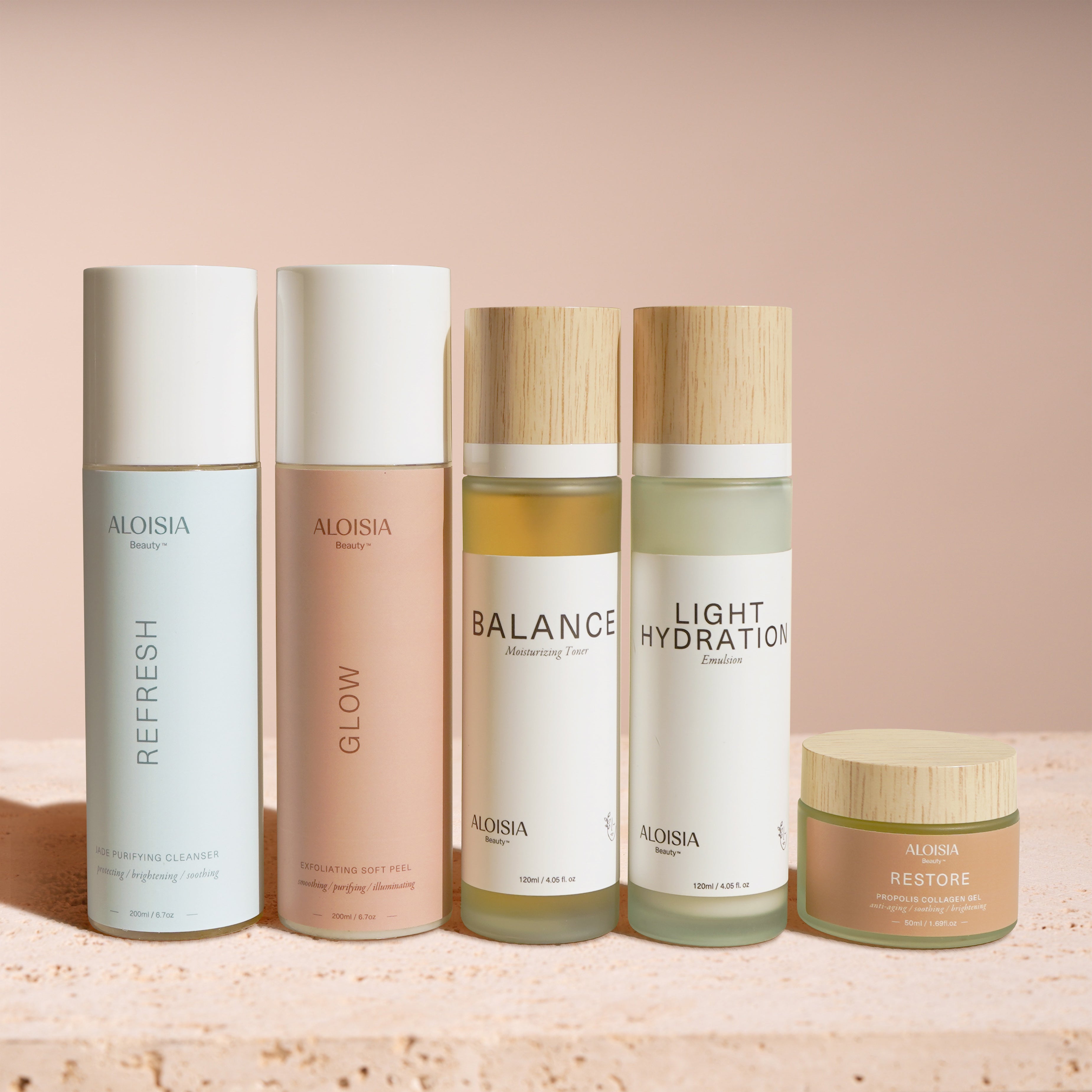 REFRESH Jade Purifying Cleanser, GLOW Exfoliating Soft Peel, BALANCE Moisturizing Toner, LIGHT HYDRATION Emulsion, RESTORE Propolis Collagen Gel