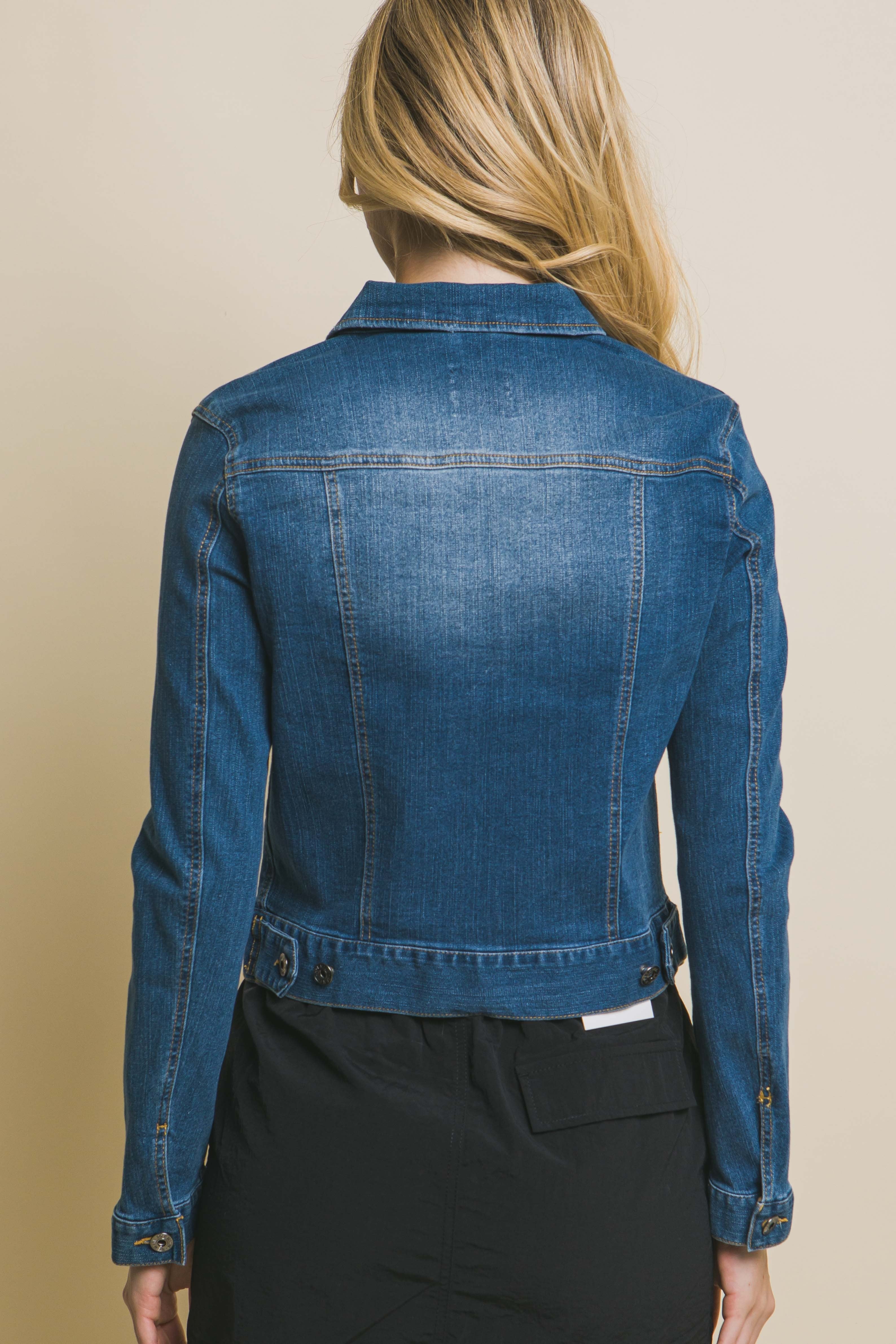 Elevate your everyday look with this Distressed Button Up Denim Jacket, crafted from stretchy cotton for all-day comfort and the perfect fit. Featuring a classic silhouette with modern edge, its subtle distressing adds just the right amount of attitude. Layer it over your favorite dress or tee for effortless style.