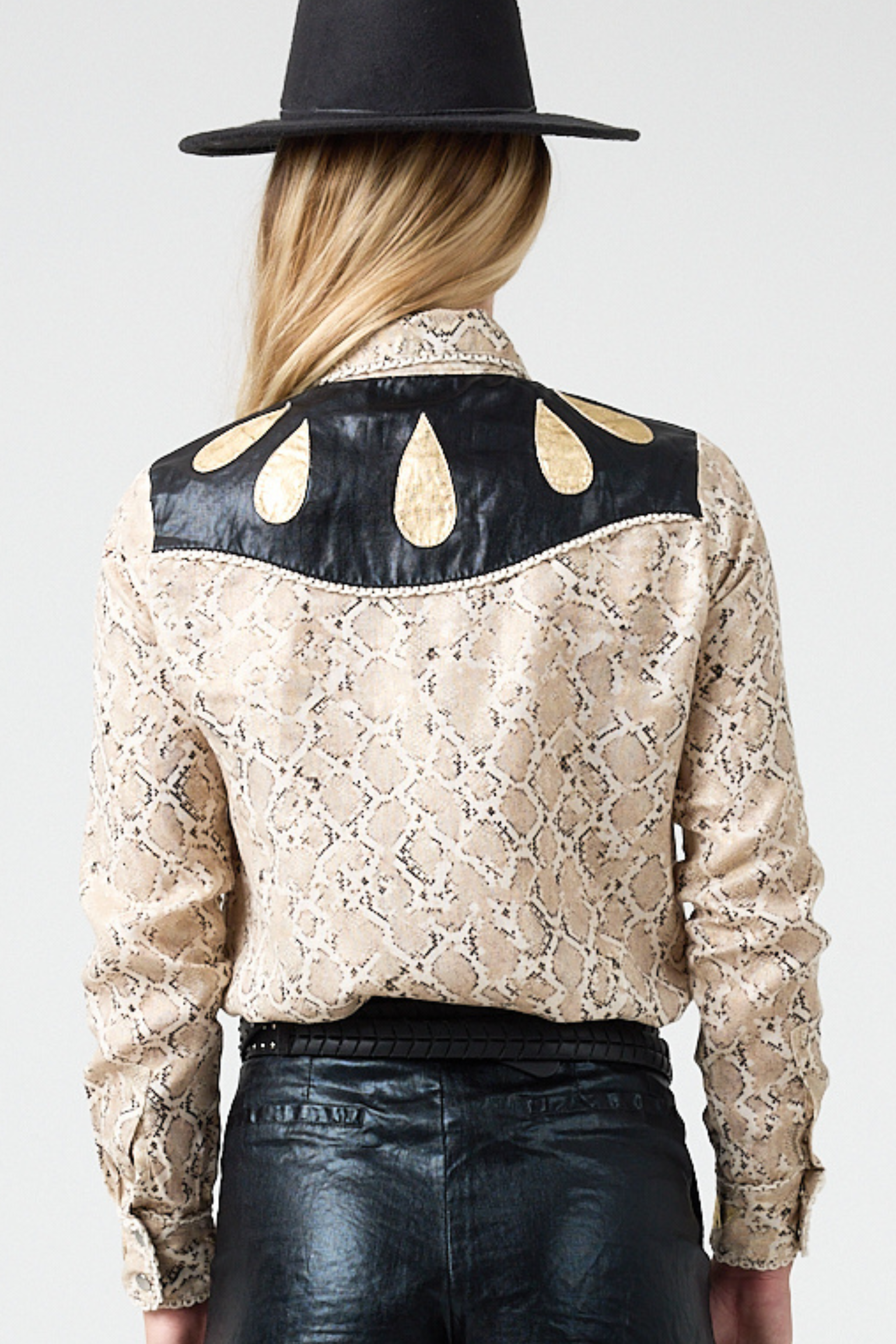 Far West Metallic Linen Shirt - Snake Print with Metallic Black and Gold Appliques