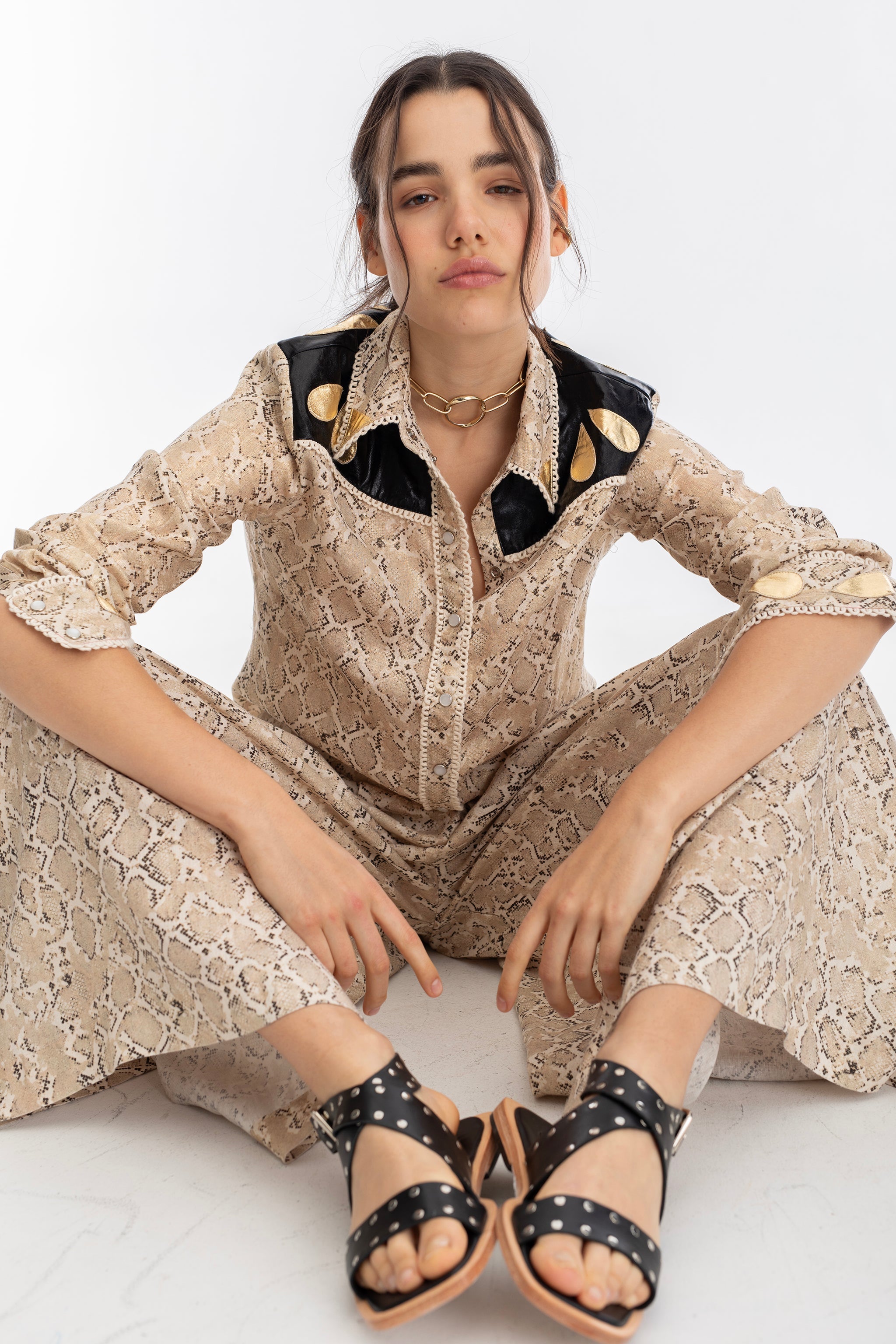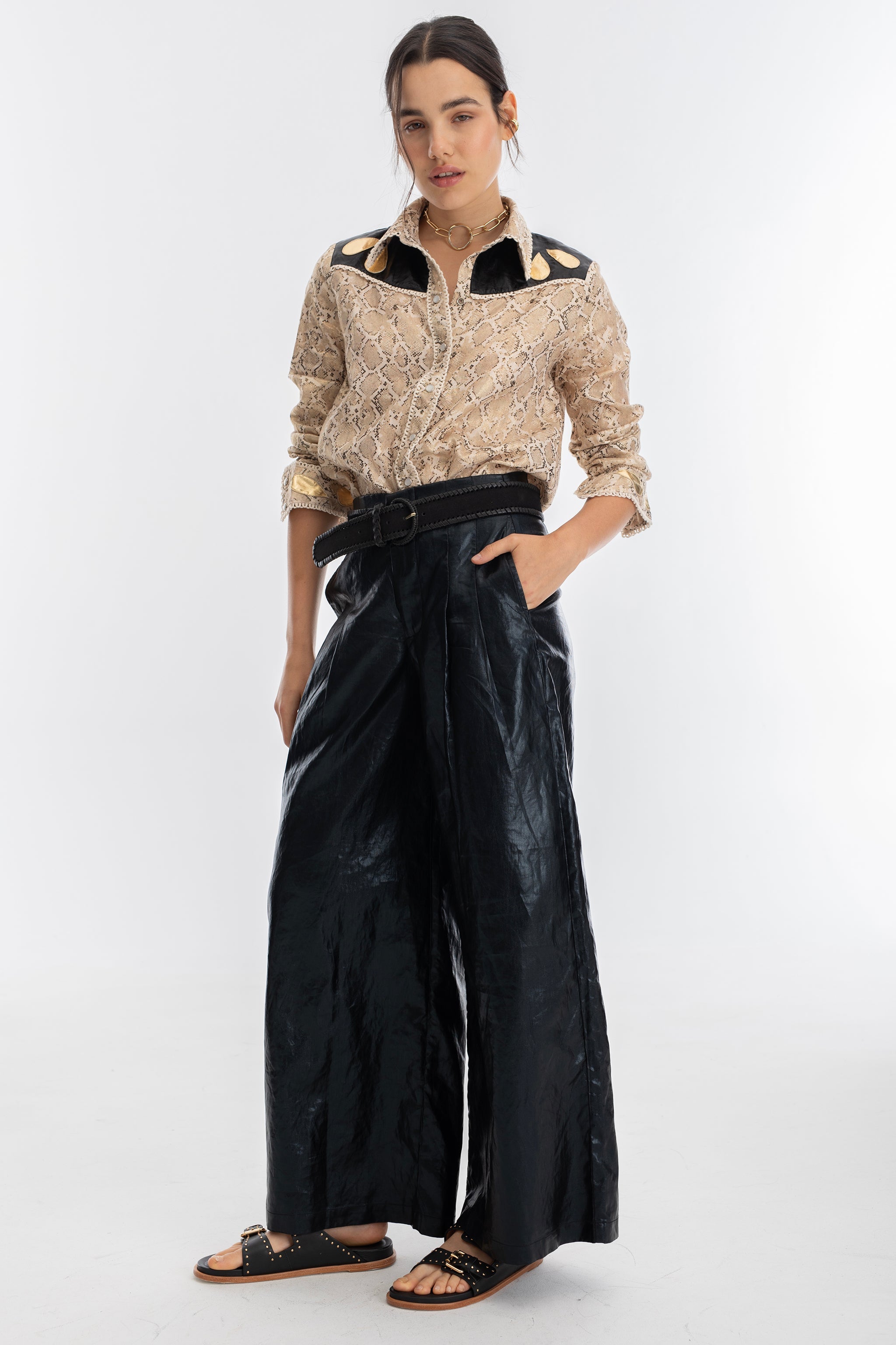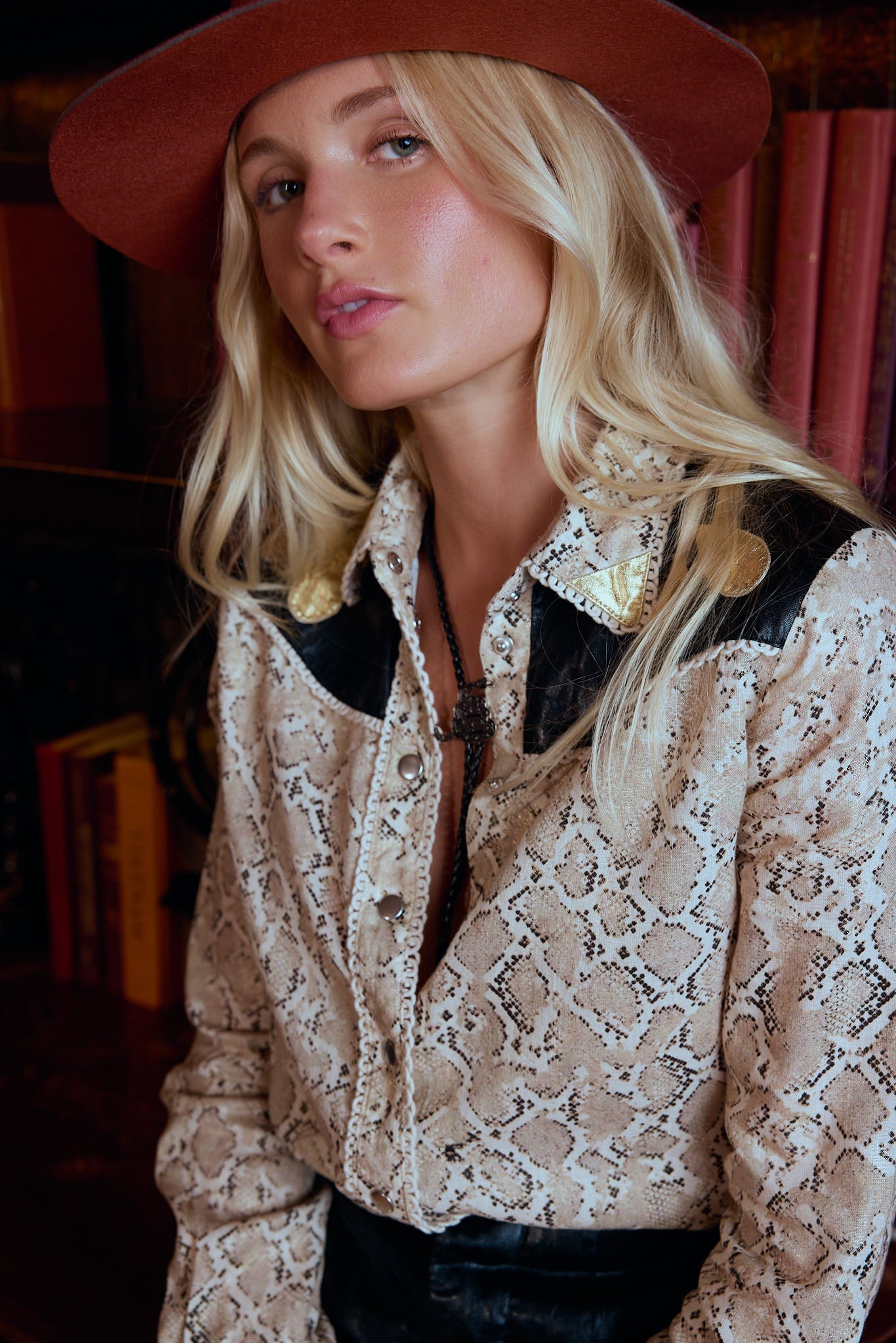 This #cowboycore shirt is an ideal pairing for our best-selling Culotte Metallic Linen Pants, in Gold or Metallic Black, or with our Sabi Metallic Linen Pants in the Snake print.