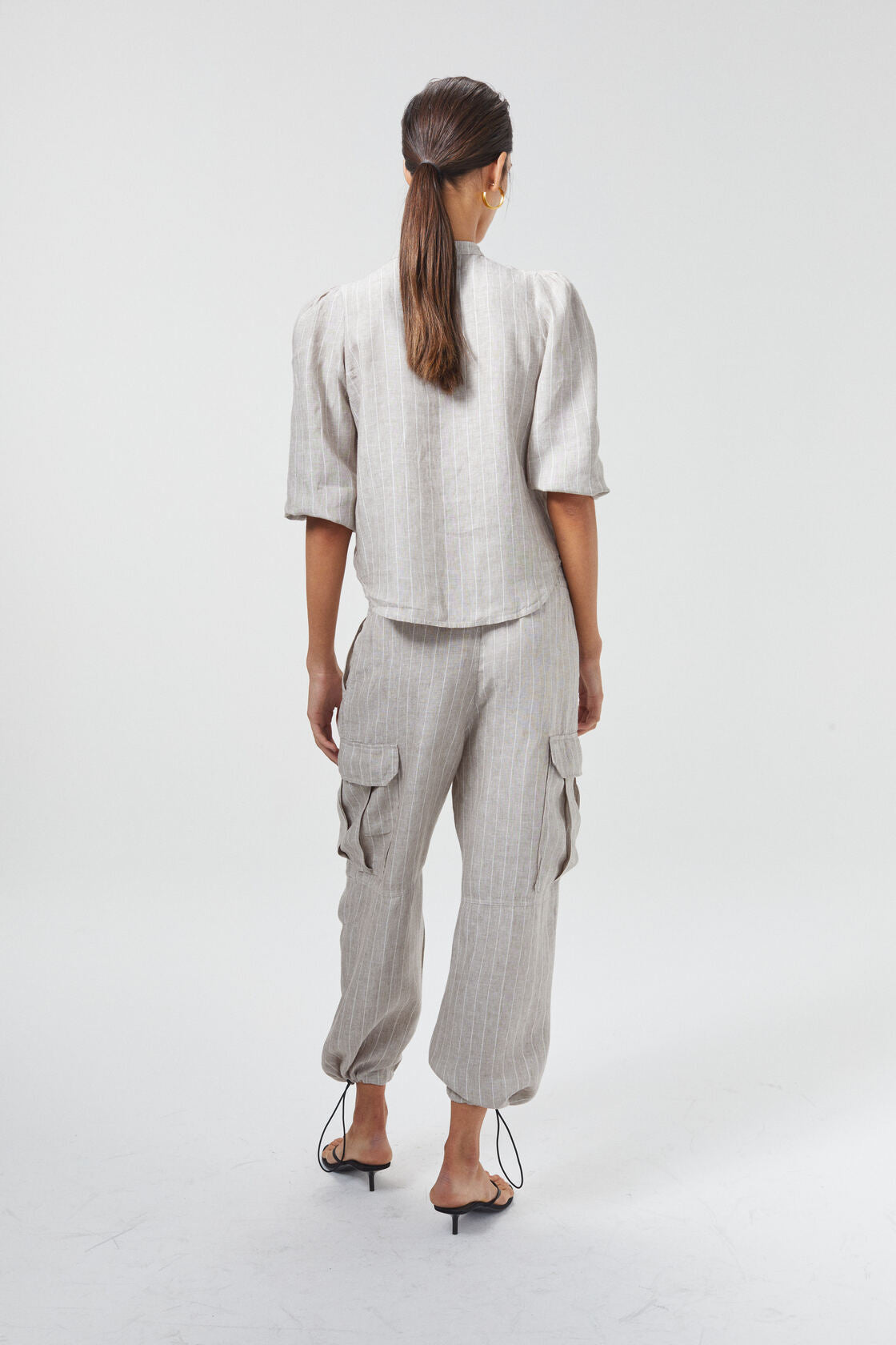 It's made with the softest 100% linen, pre-washed and softened for a super easy handling and lovely drape. It features a mandarin neck, shell buttons and long balloon sleeves with elastic cuffs.