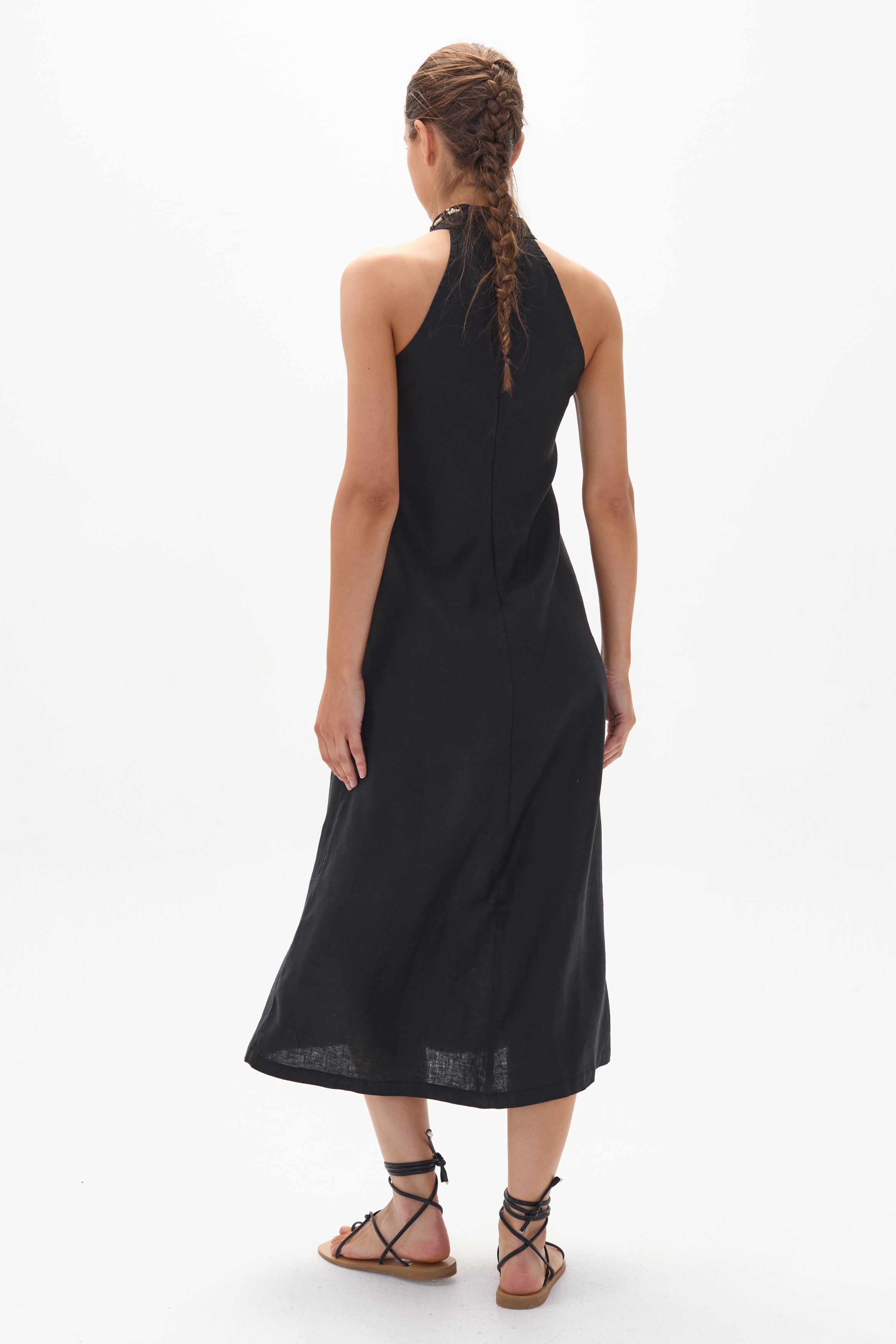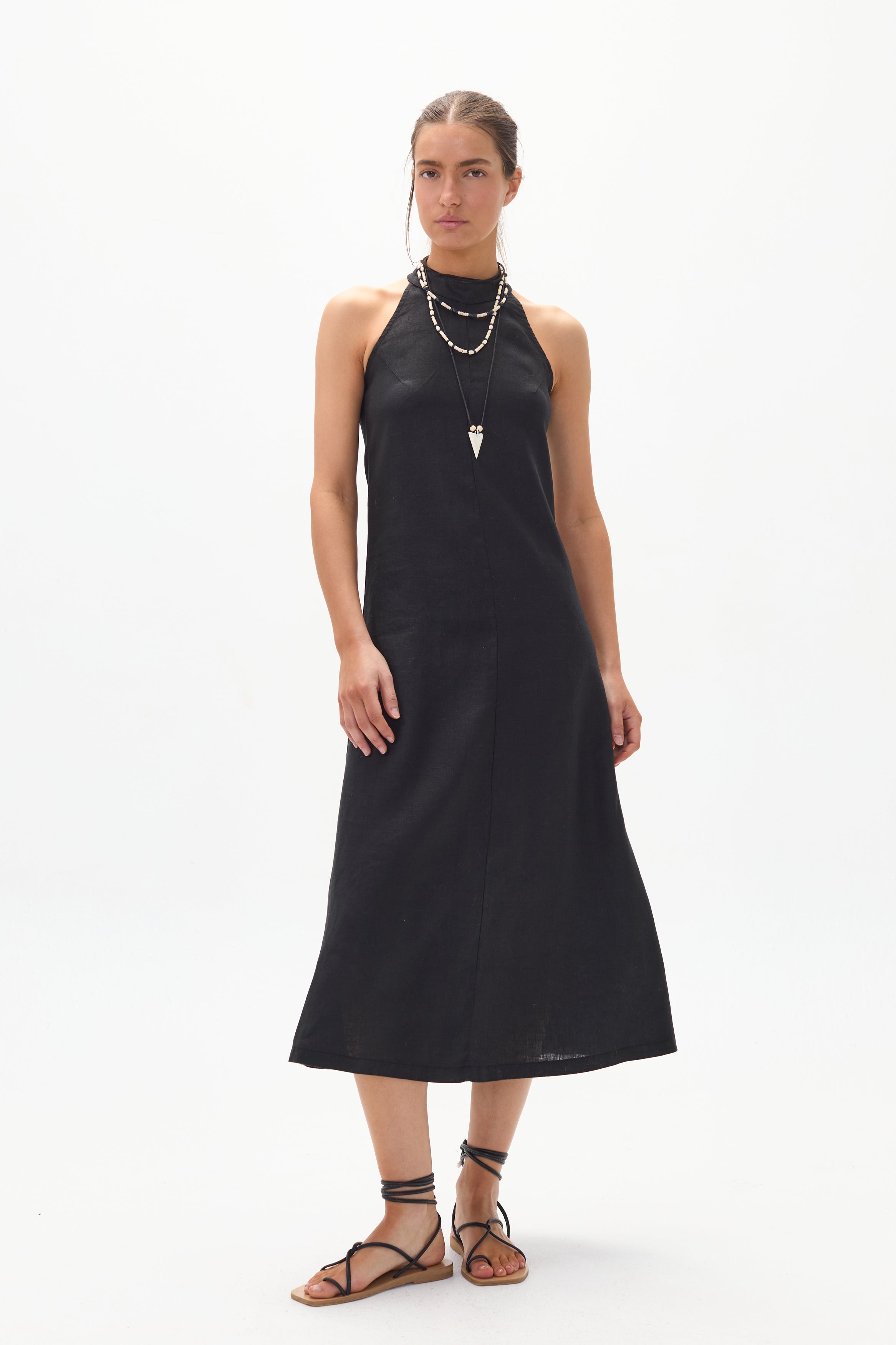 The Olivia midi linen dress falls from a high, halter neckline, into a sleeveless, feminine silhouette combining timeless details. Hidden back zipper and neck button-loop closure. Perfect for a fancy evening date or any special occasion.