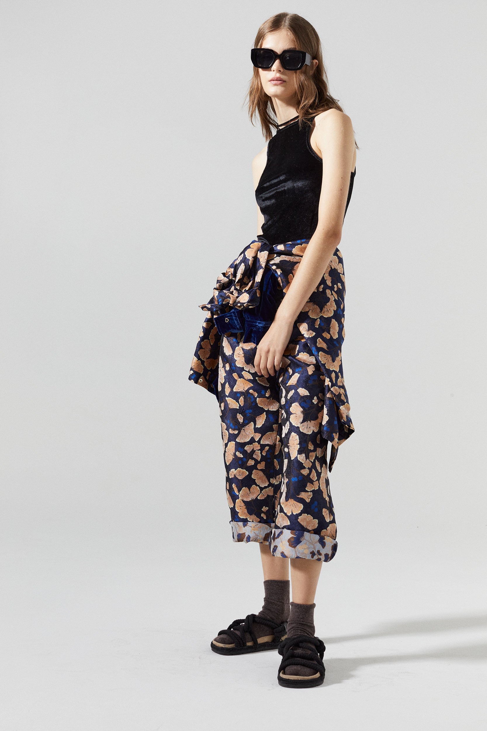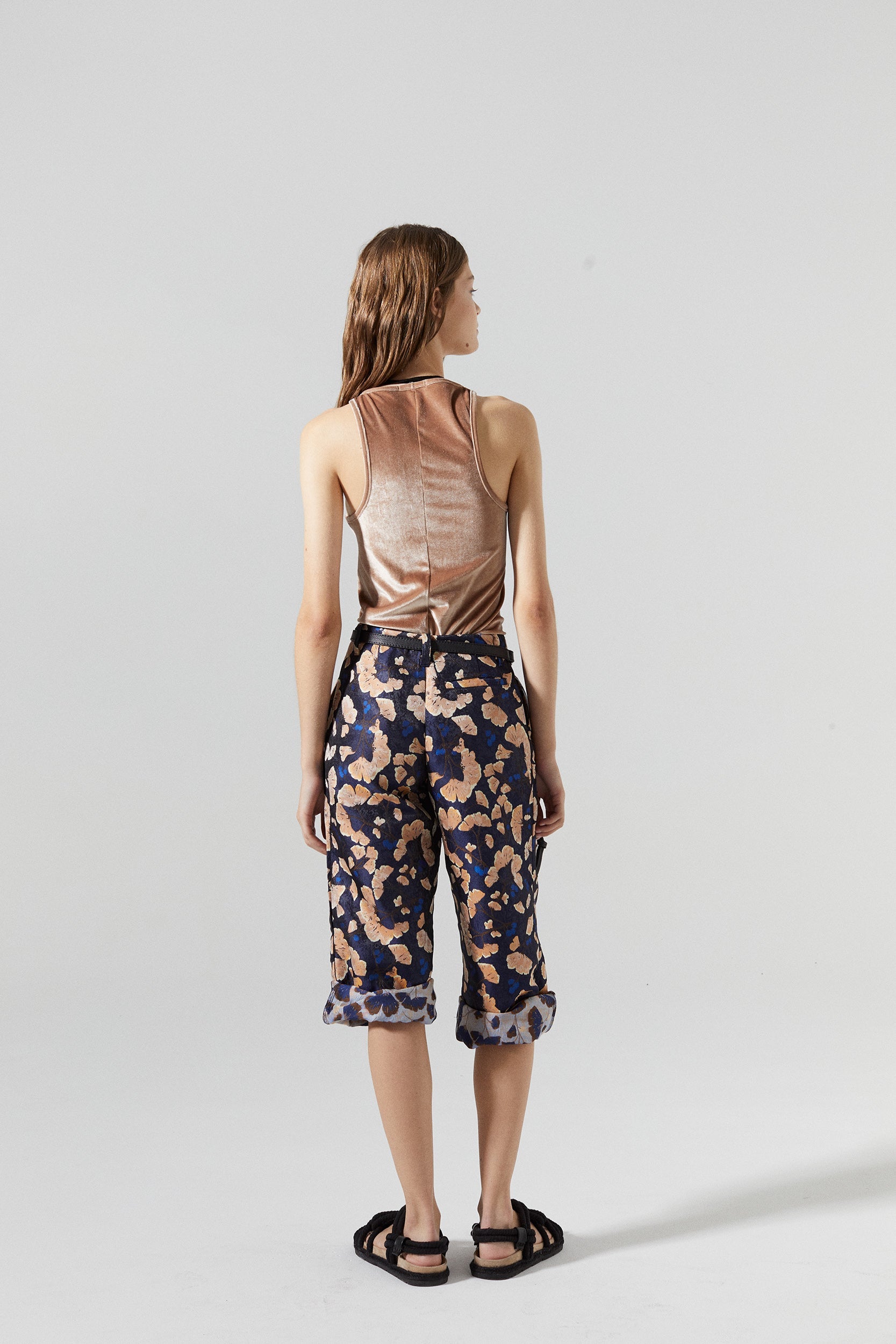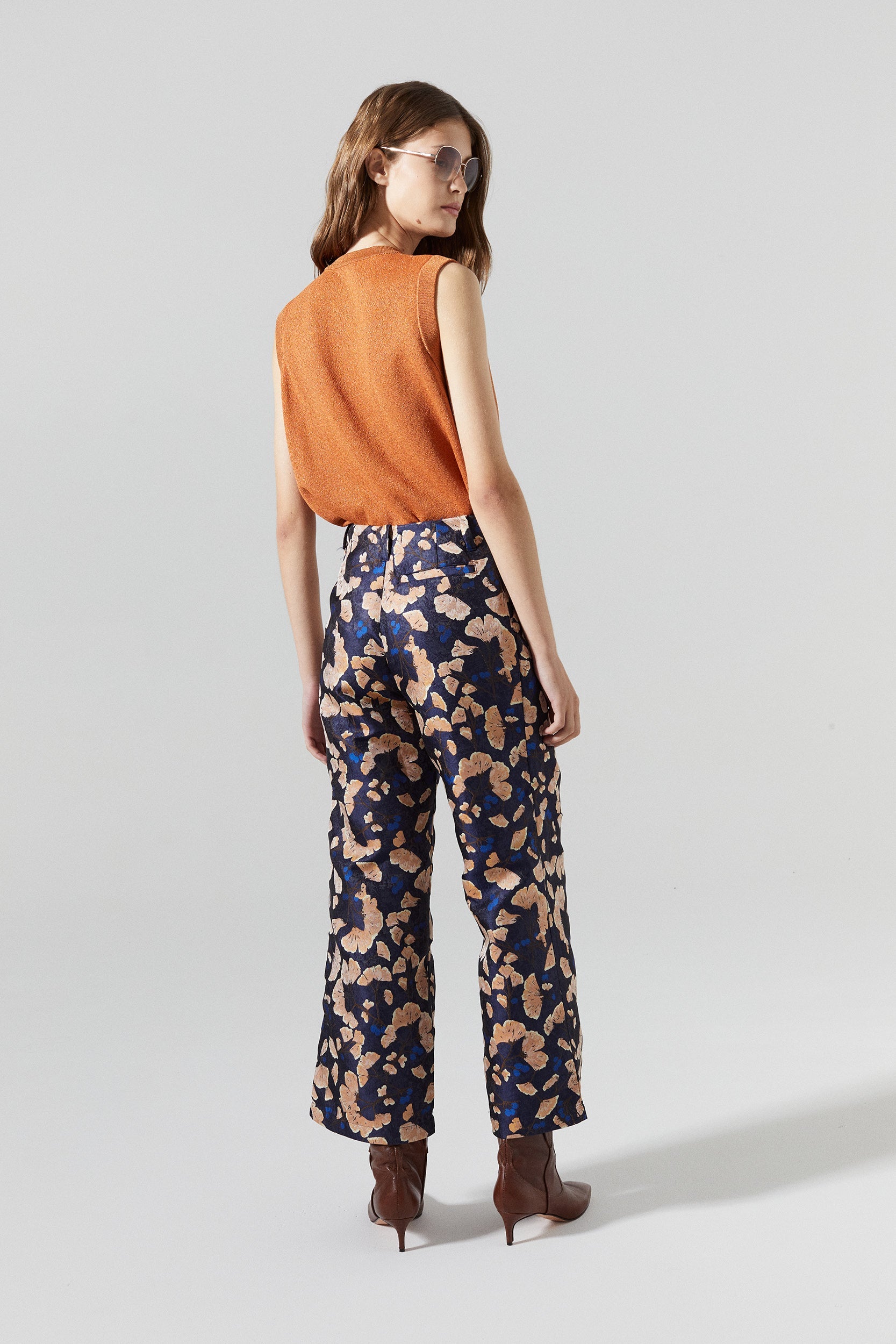 The Sakura Brocade Pant is a statement piece that elevates any look. It features wide legs and a low rise, with front closure and pleats for a tailored style. The Ginkgo jacquard in shades of blue and copper adds shine and a feminine touch to this piece.
