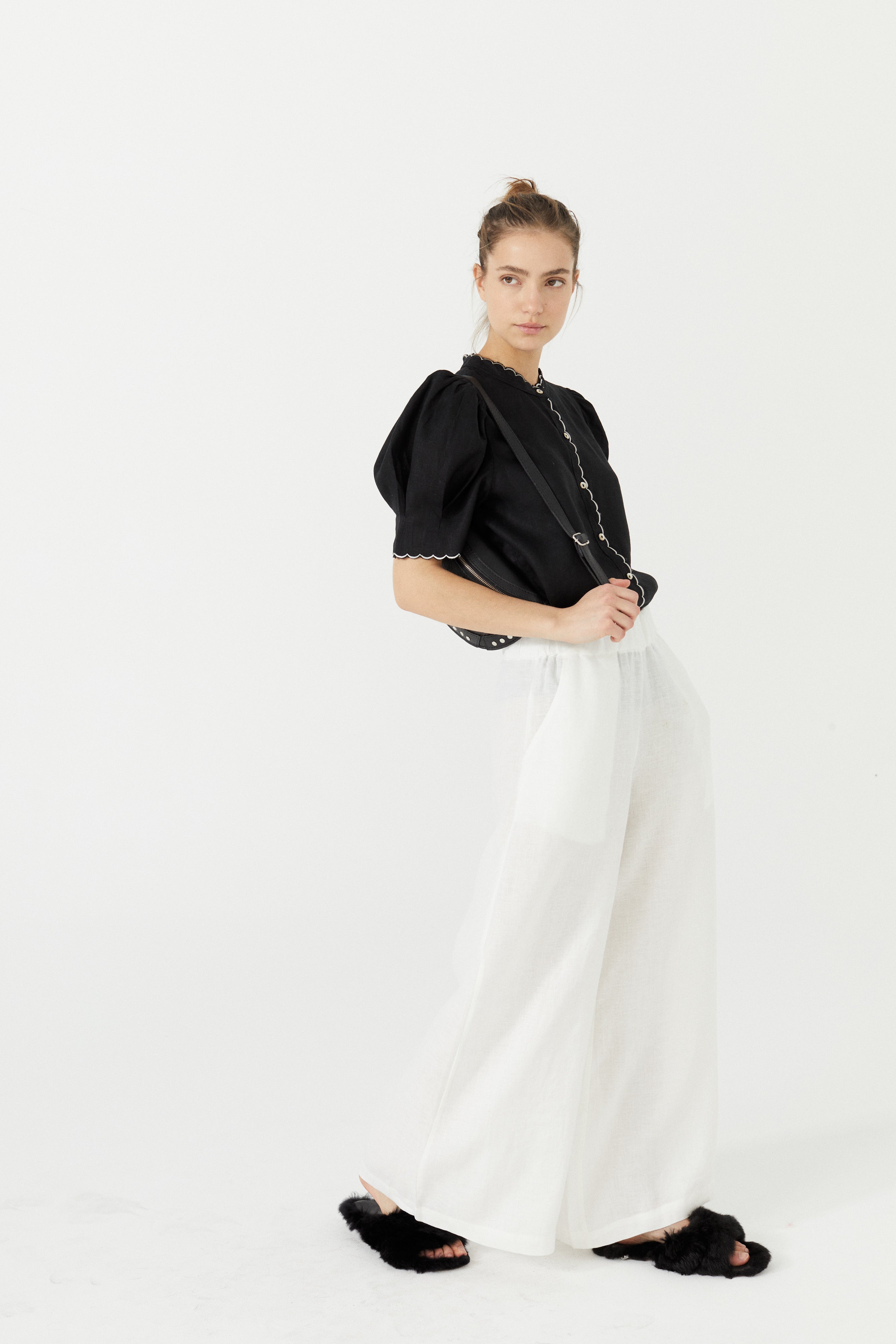 Flattering and flirty, this 100% natural linen shirt with embroidered details features puffed short sleeves, a minimalist mao neck and shell buttons on the front.