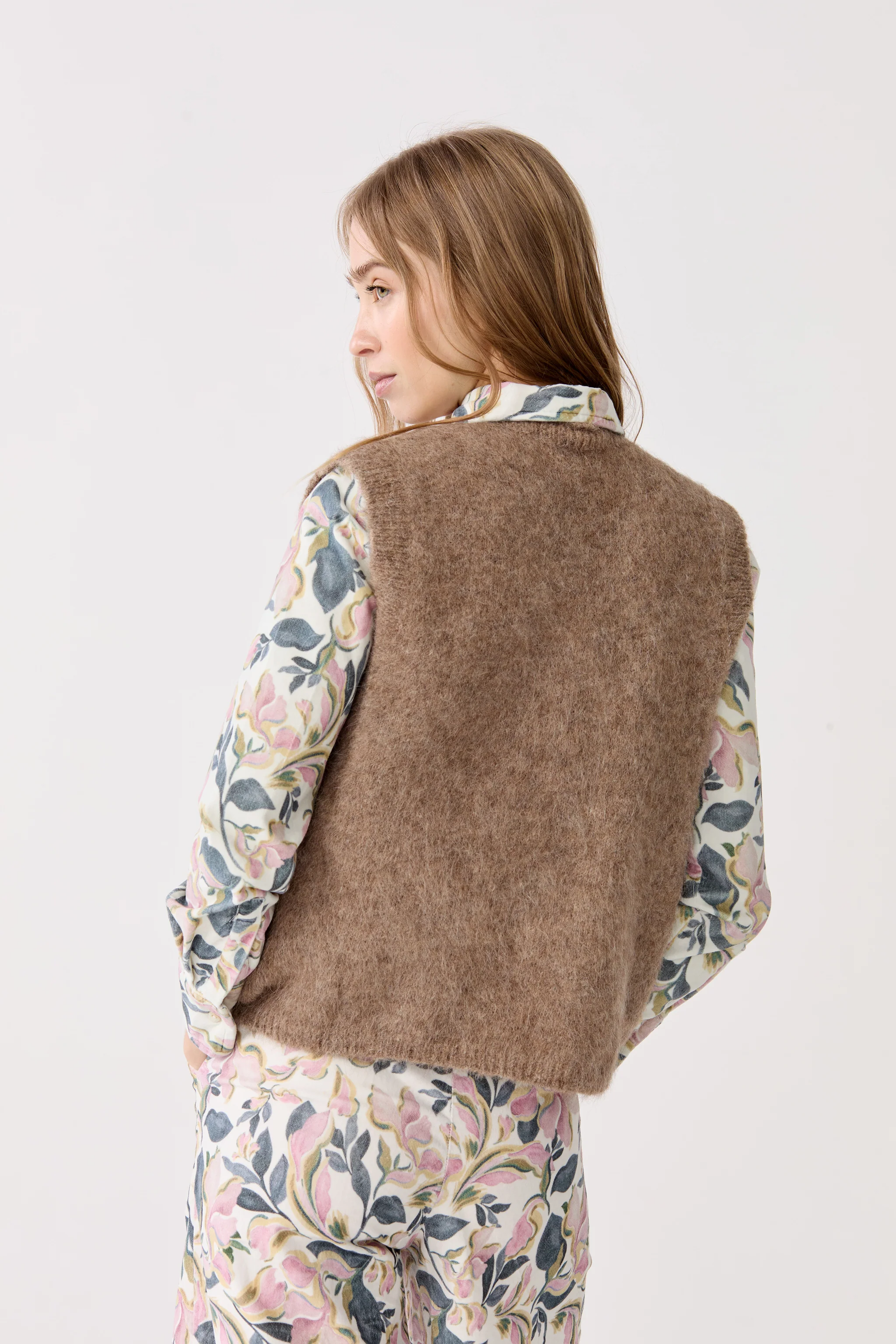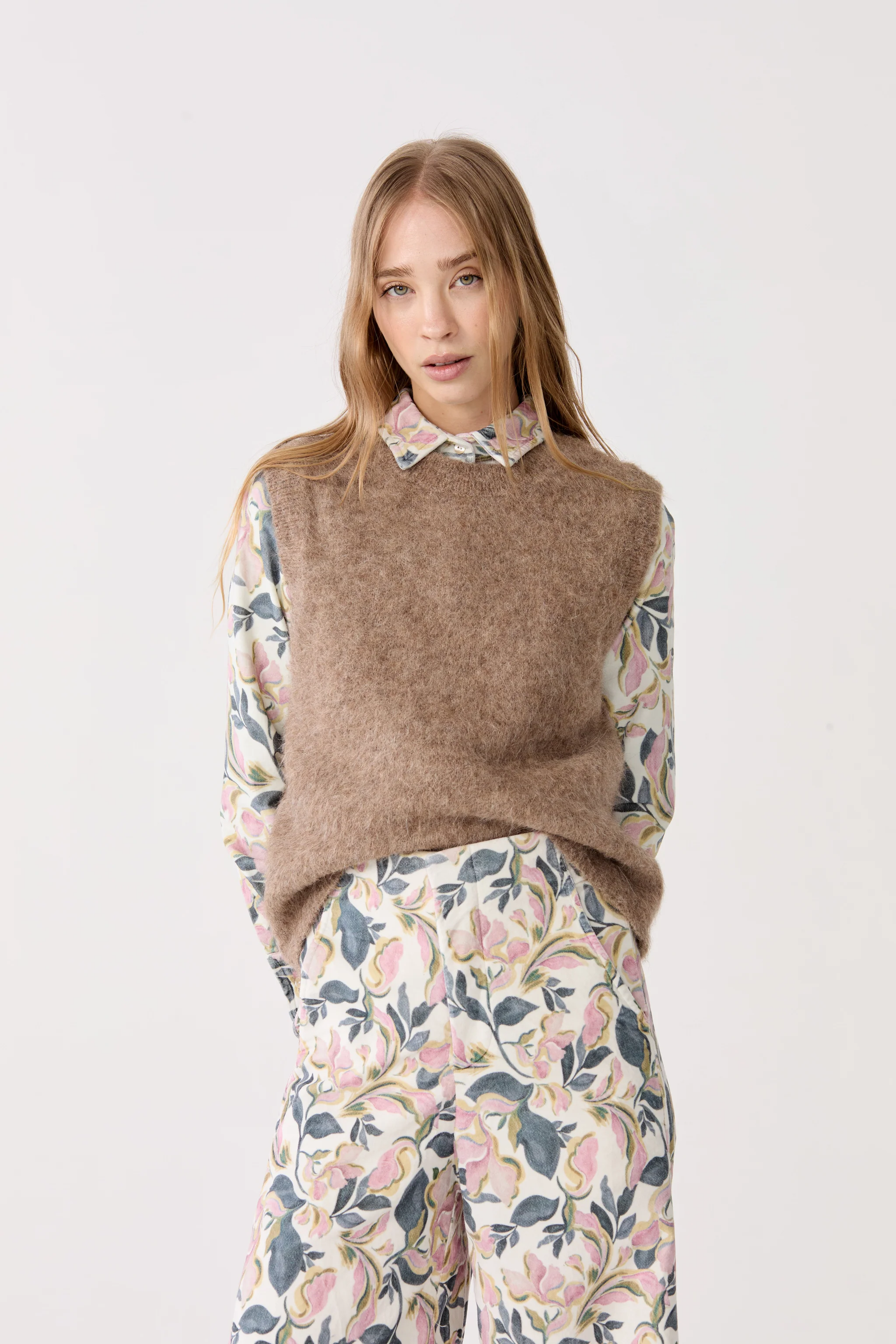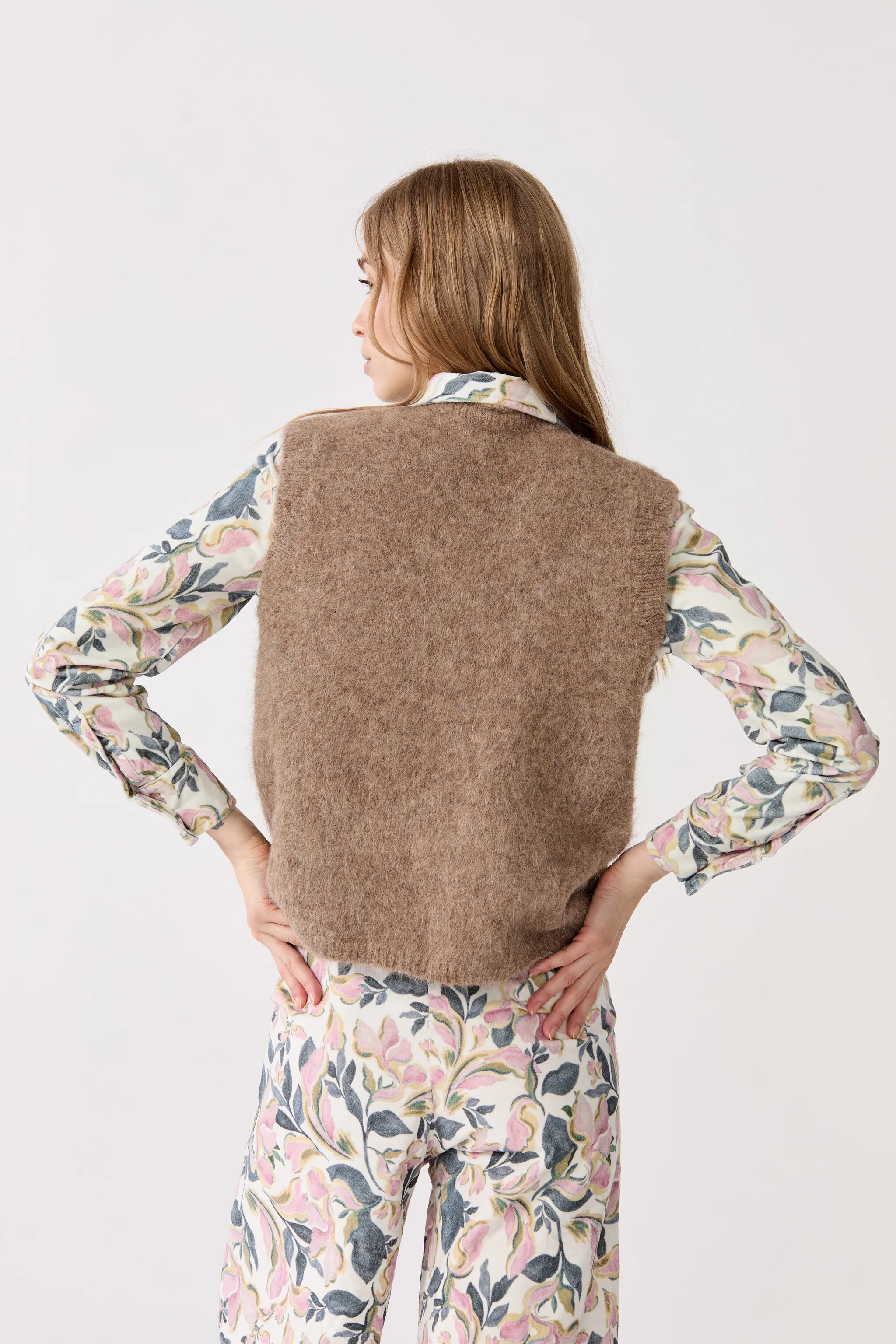 Meet the new Alpaca Knitted crewneck vest, with a relaxed fit, because who couldn't use a little extra relaxation? Refined by ribbed trim the alpaca vest makes a soft silhouette to transition with the seasons.  Wear it with our super culotte denim pants.