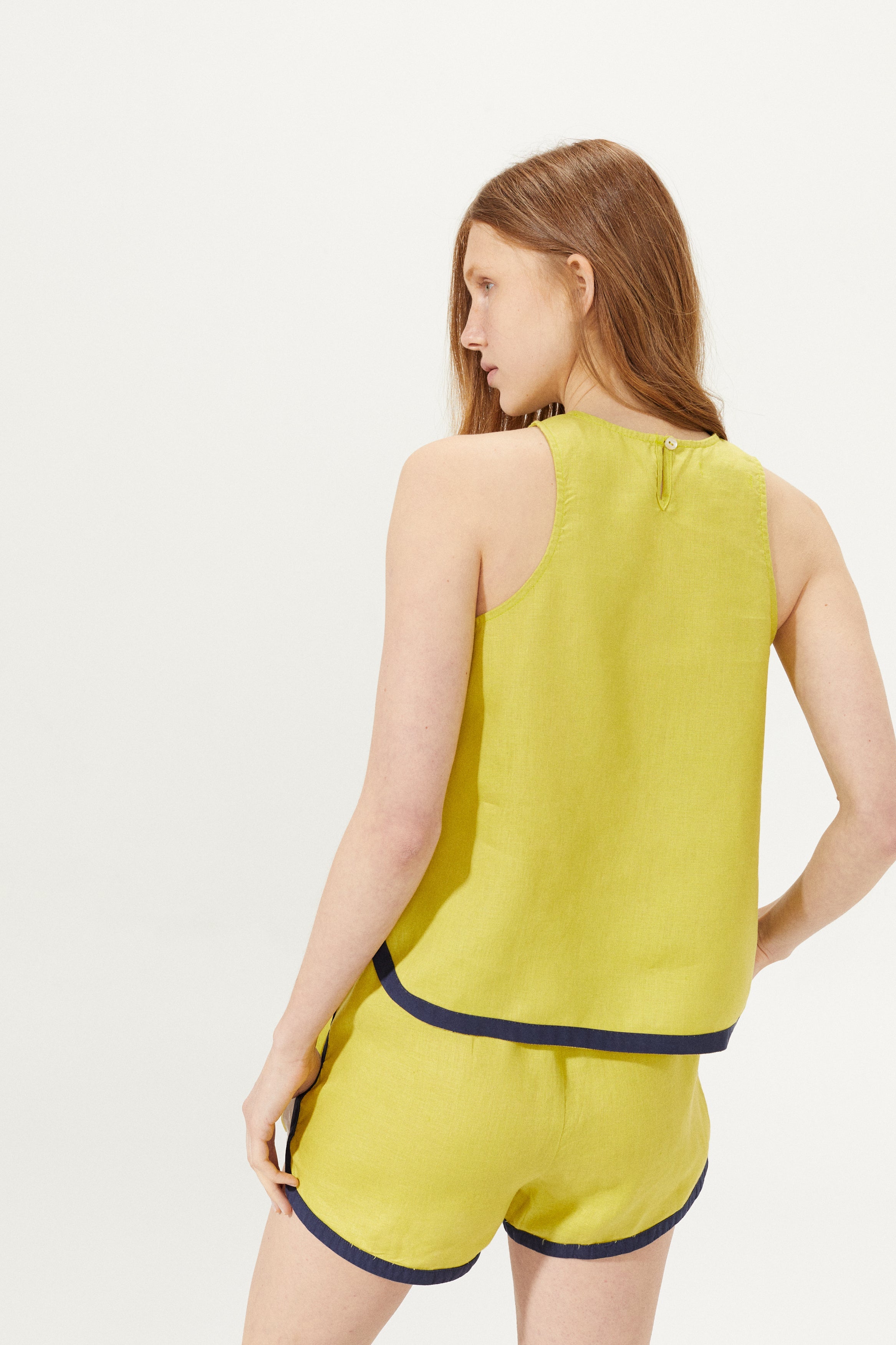 Our sleeveless Anna Linen Top is made entirely of 100% linen, and it features a high neckline, tank top shoulders and a curved, loose hemline for a relaxed fit and look. The side linen trimming adds a chic, playful vibe.