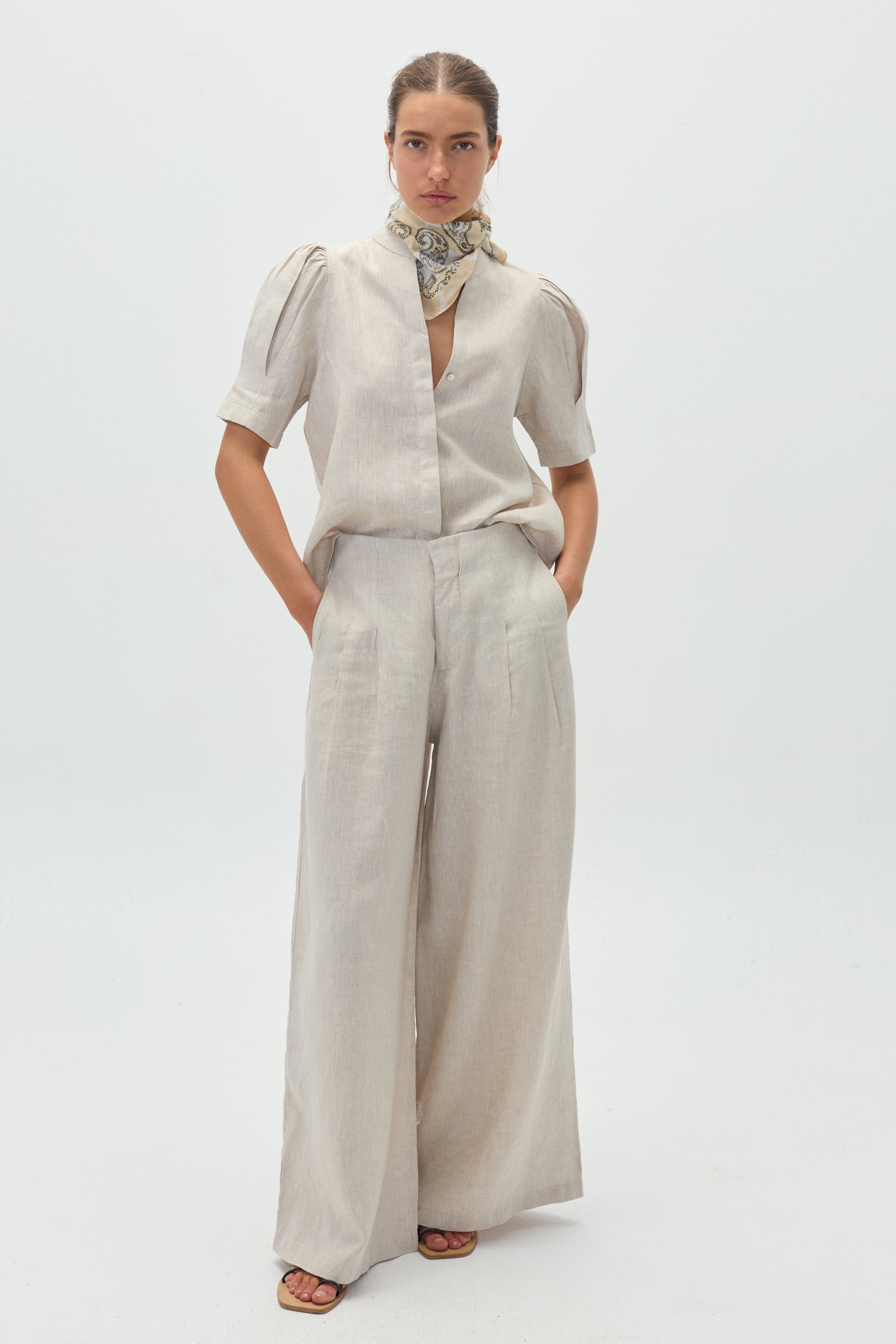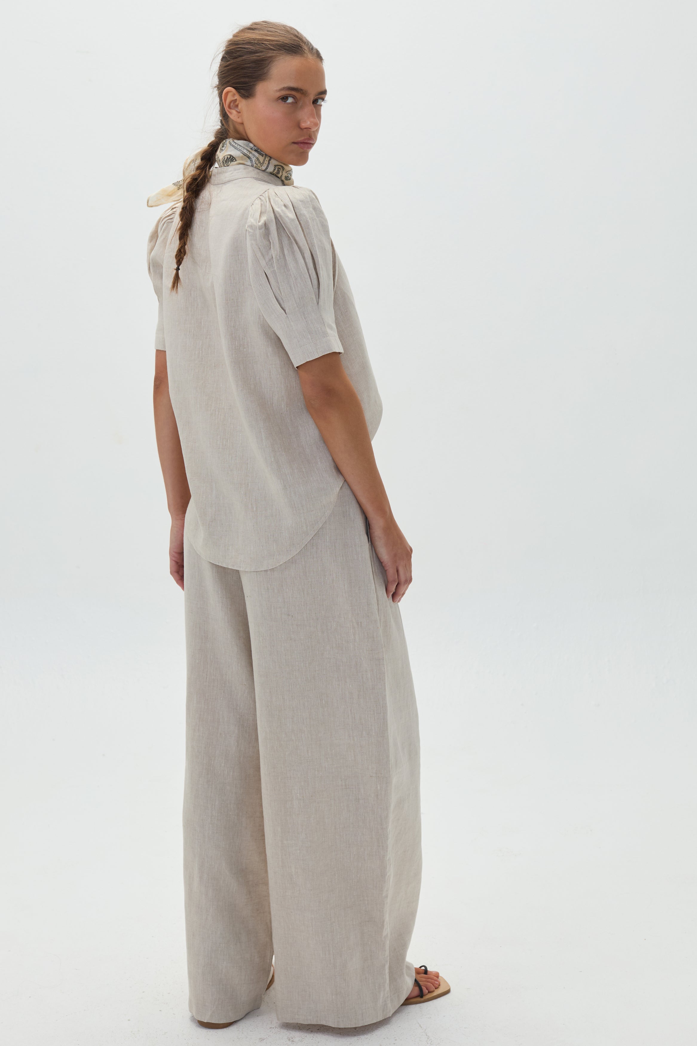 There's nothing like a good linen shirt. The Athina is femenine, casual and elegant at the same time. Made with our premium 100% linen, it features puffed short sleeves and mao v-neck with shell buttons.