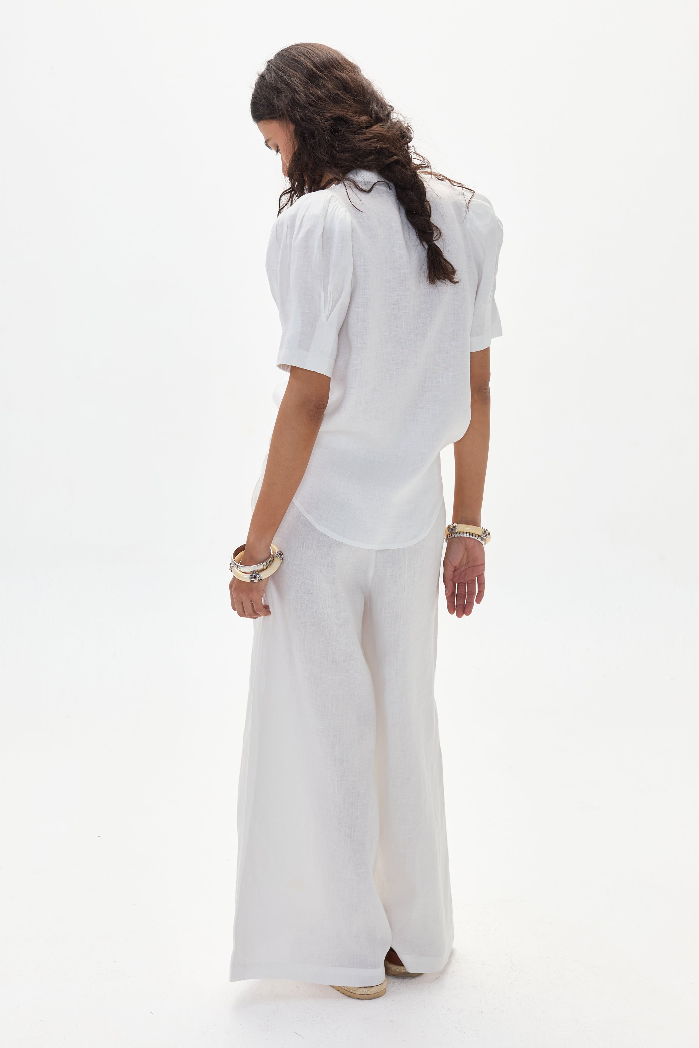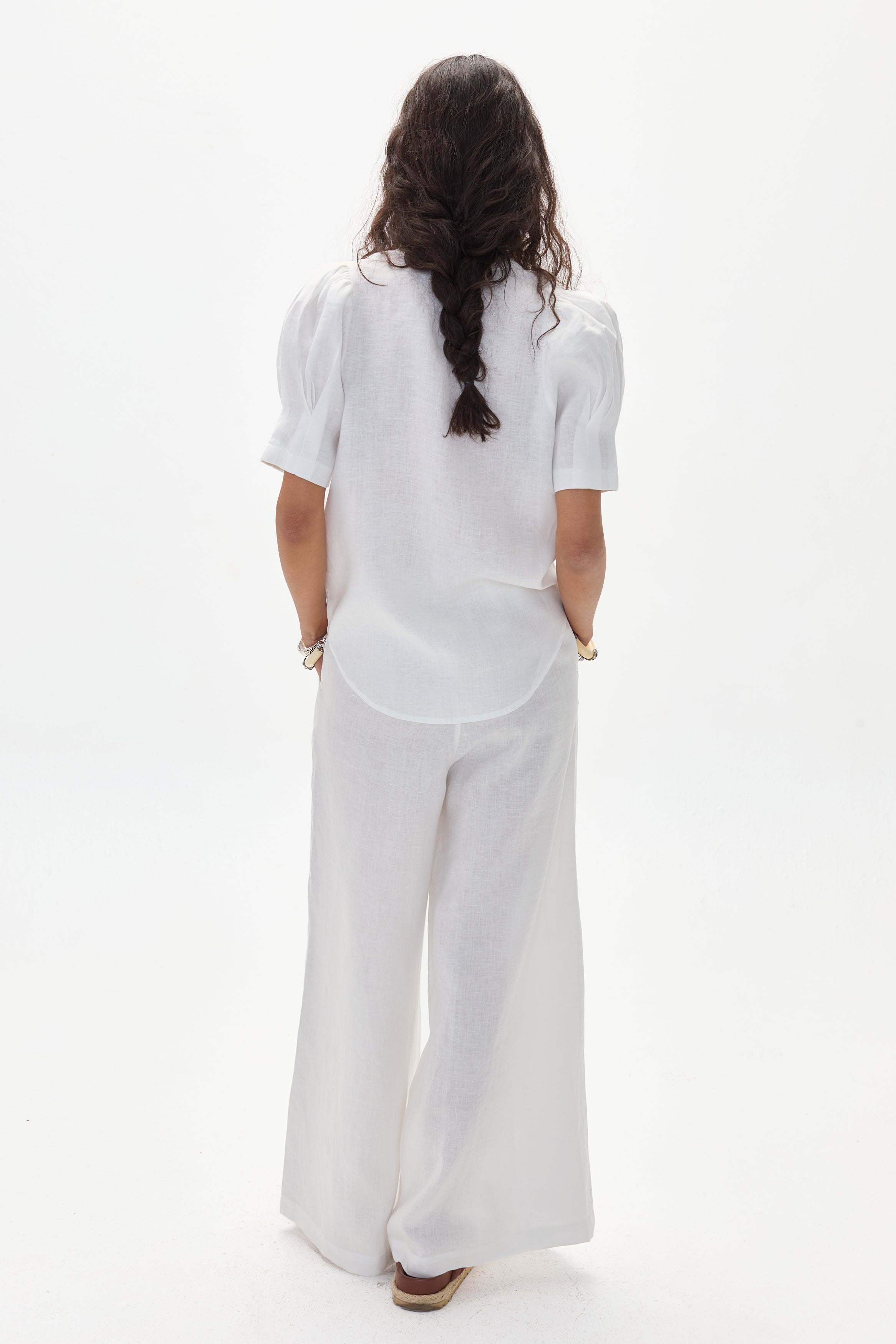 Made with our premium 100% linen, it features puffed short sleeves and mao v-neck with shell buttons.