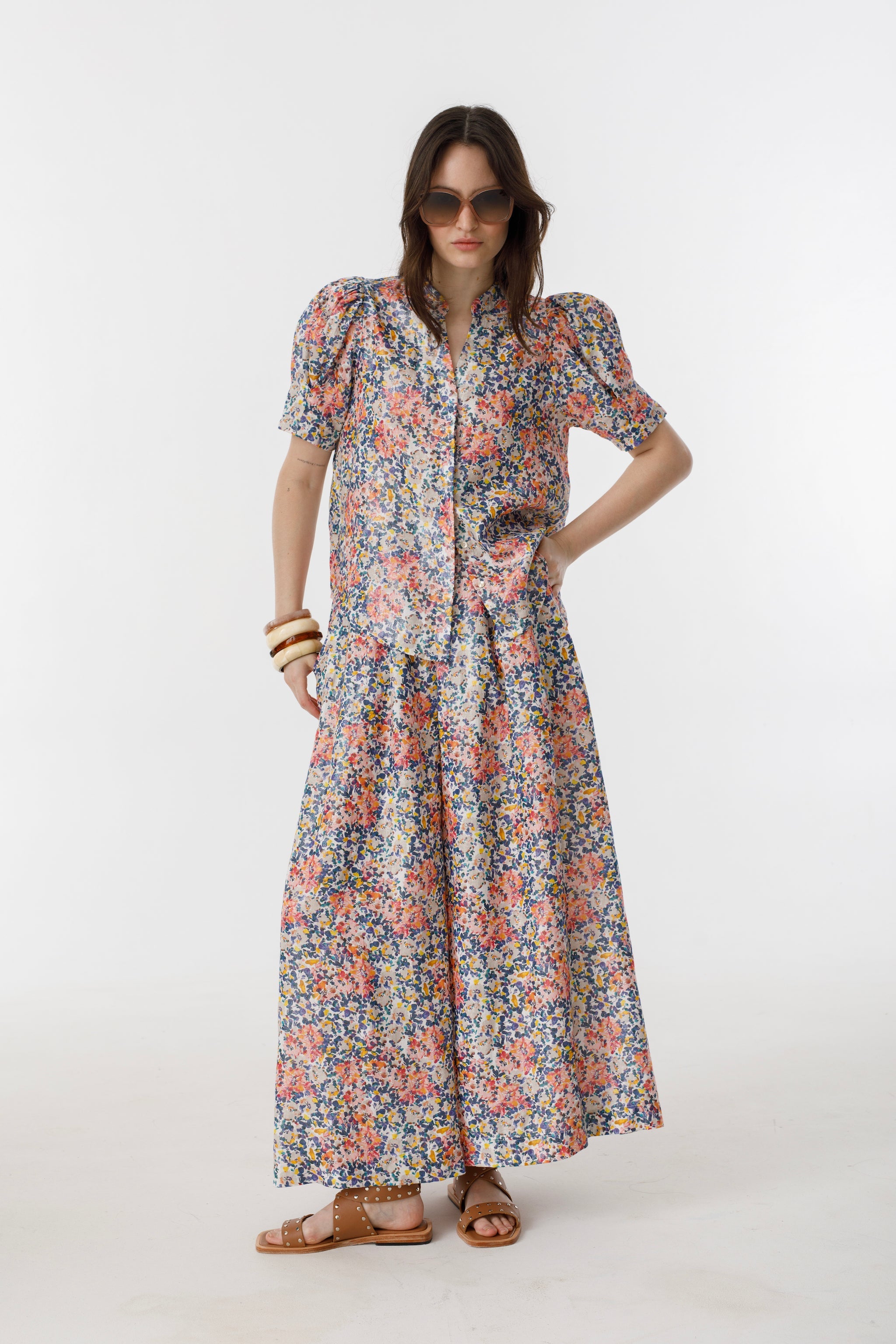 There's nothing like a good linen shirt. The Athina is femenine, casual and elegant at the same time. Made with our premium 100% linen, and it's not only printed but also finished with a metallic coating. It features puffed short sleeves and mao v-neck with shell buttons.
