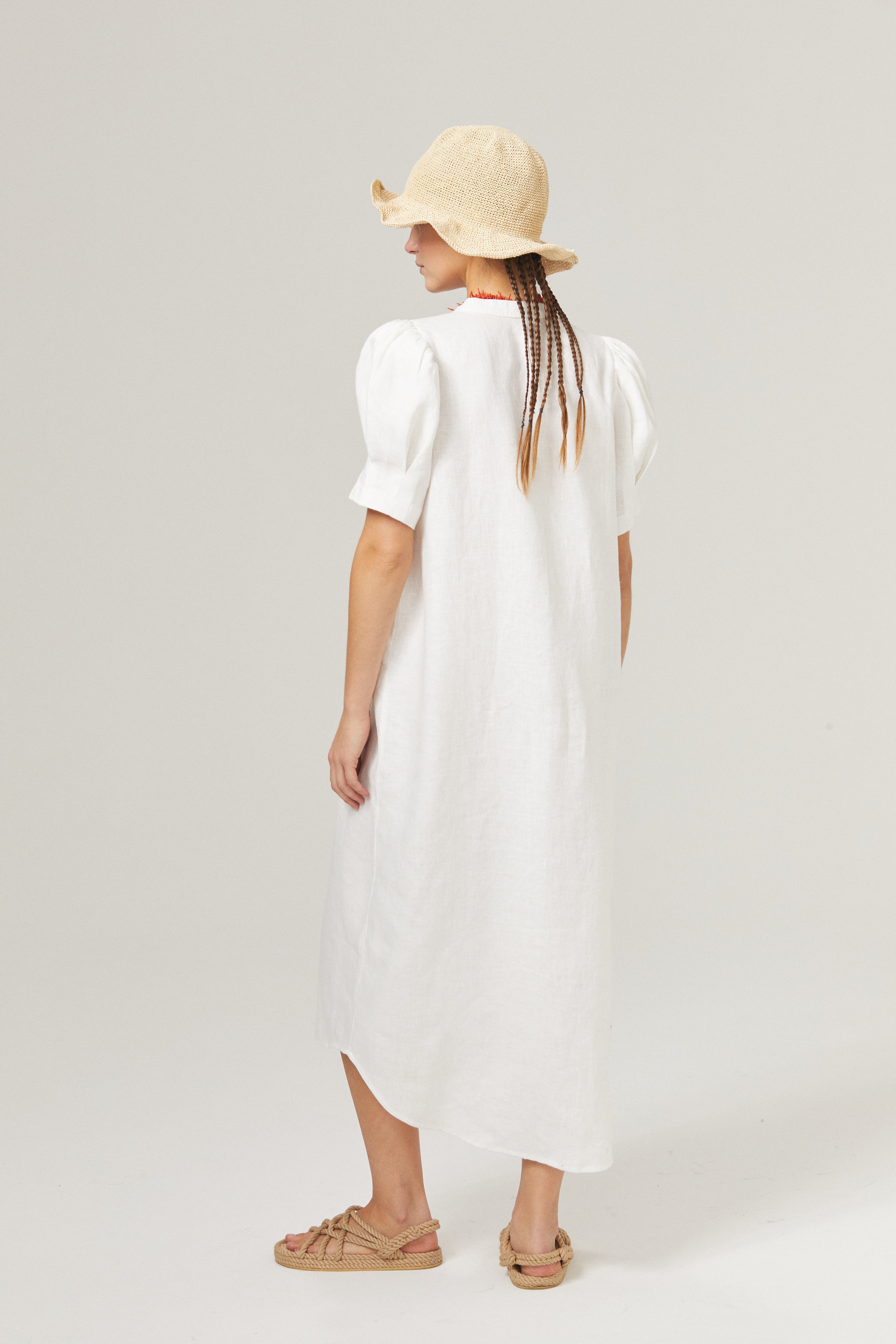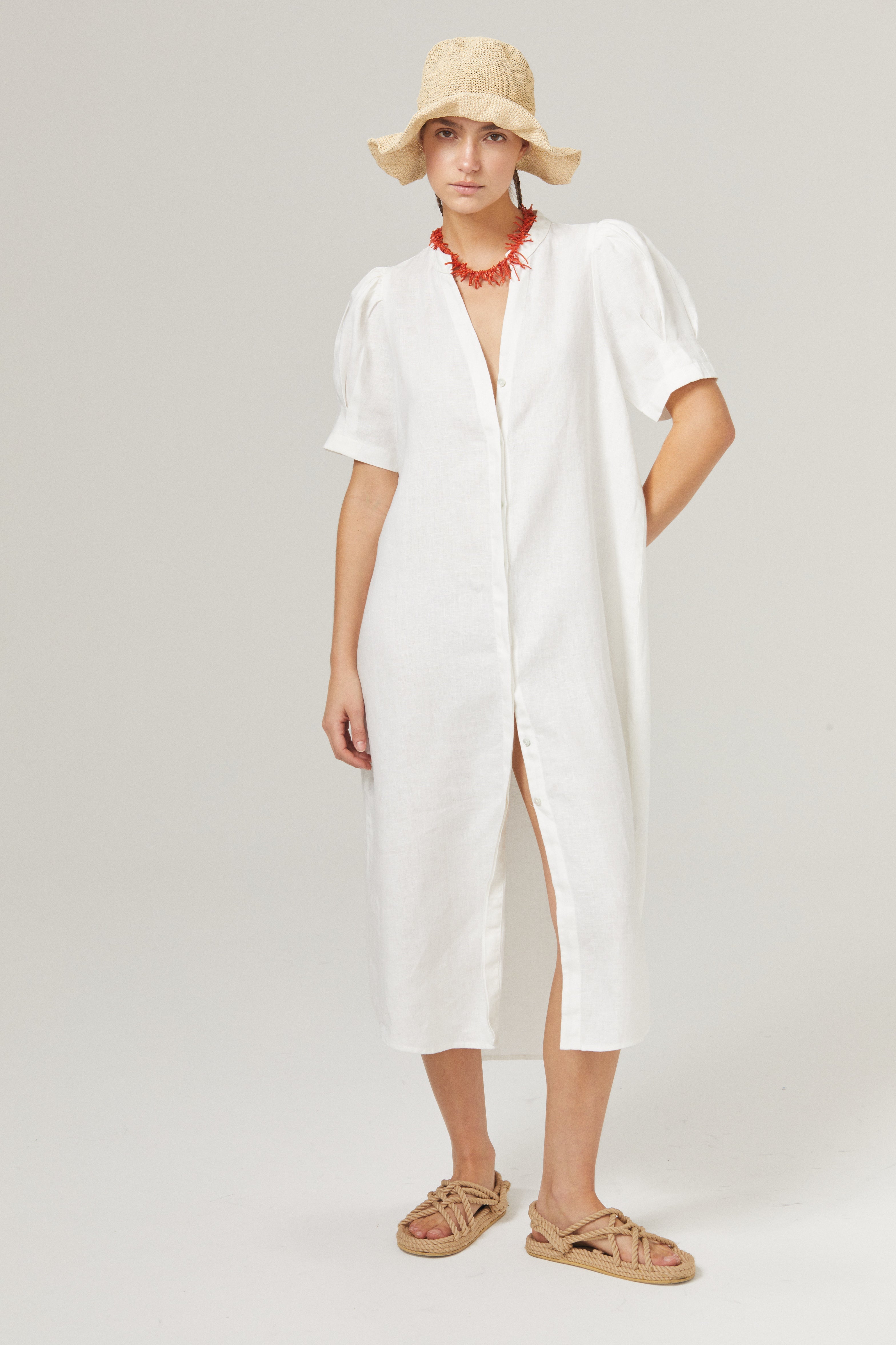 With simple lines and a midi length that is always elegant and chic, it's made with 100% organic linen.