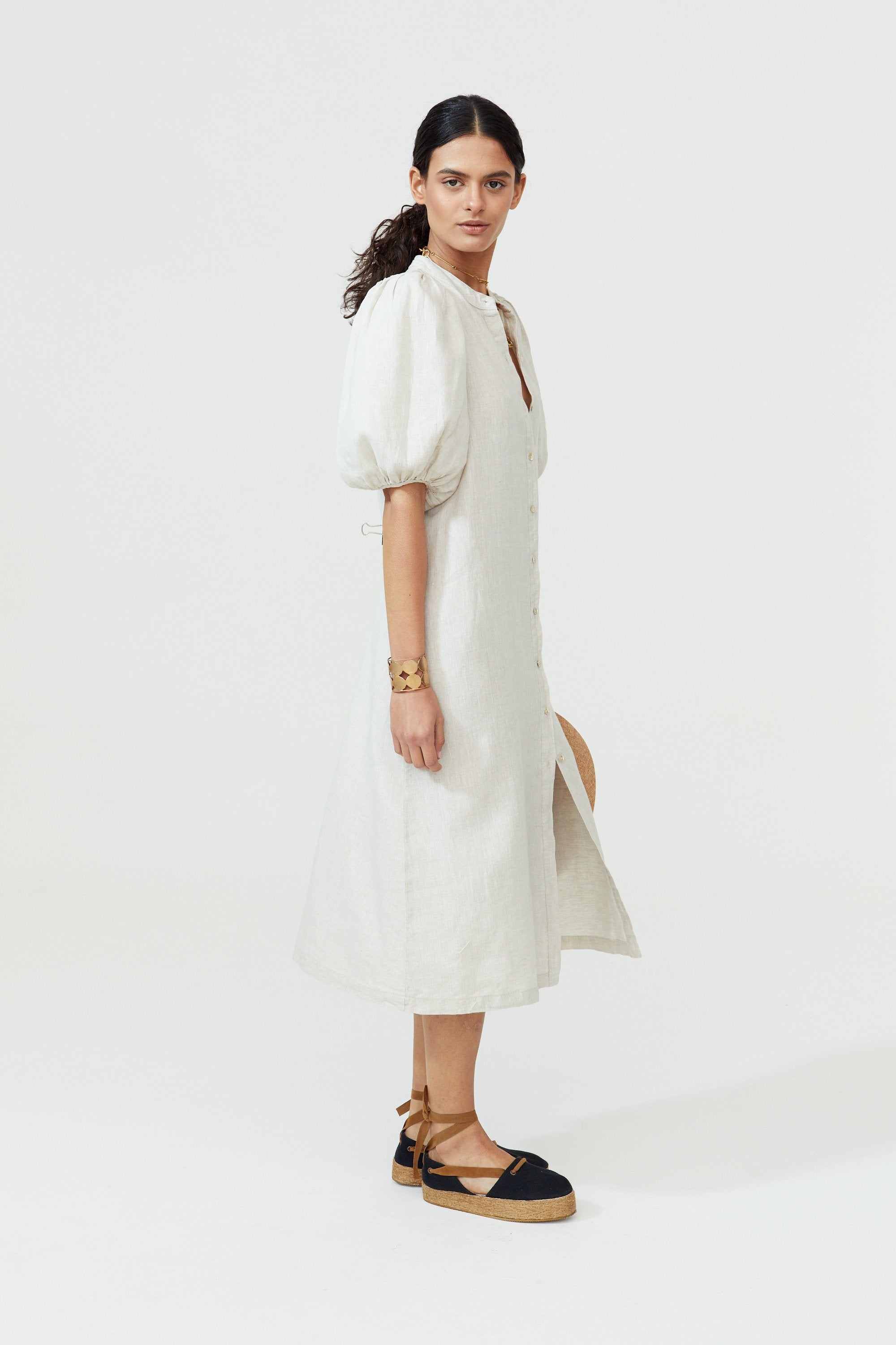 The Bubble dress made of 100% linen is a very flattering piece for any occasion. With a mao neck and puff sleeves that accentuate the A-line silhouette to create a feminine shape.