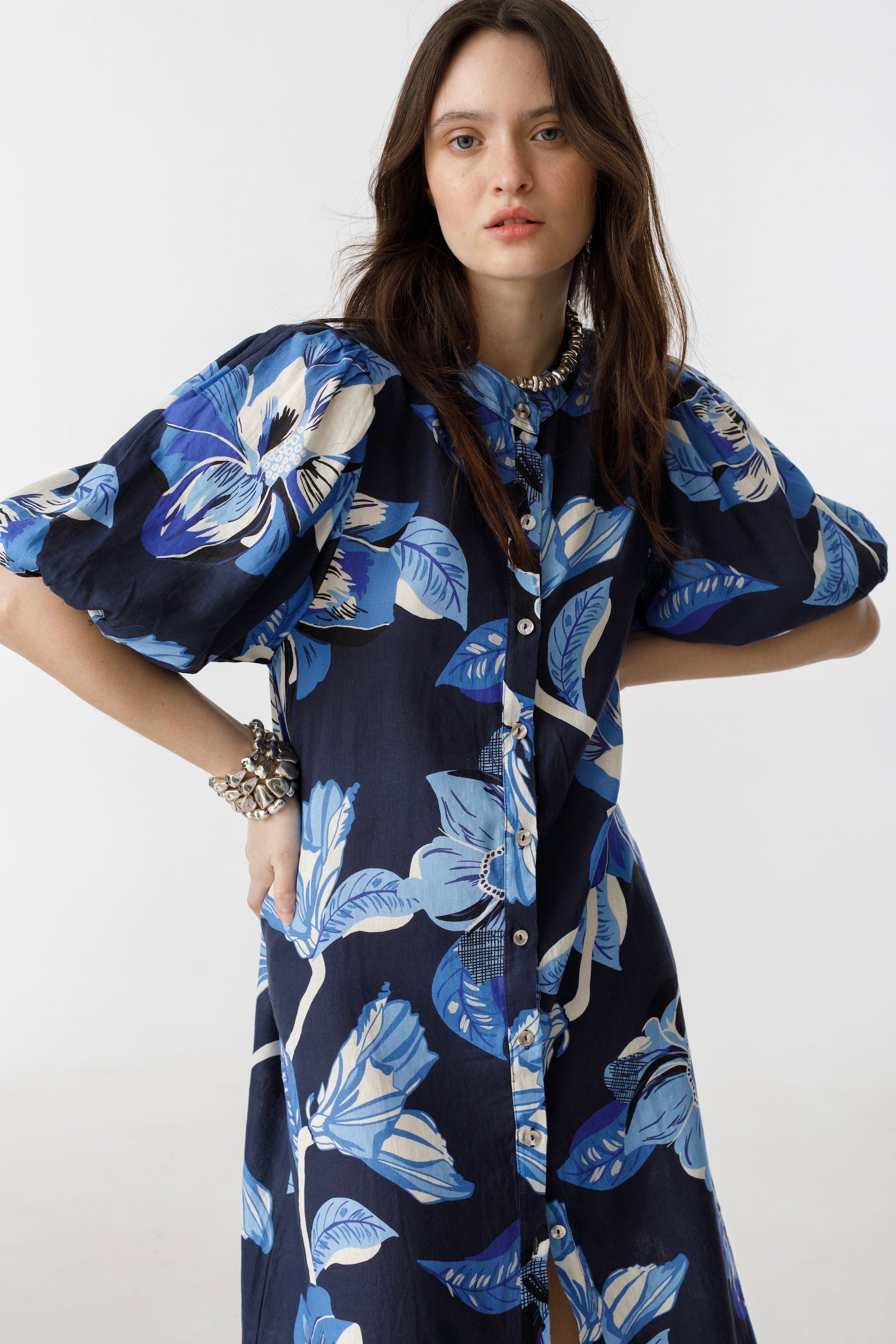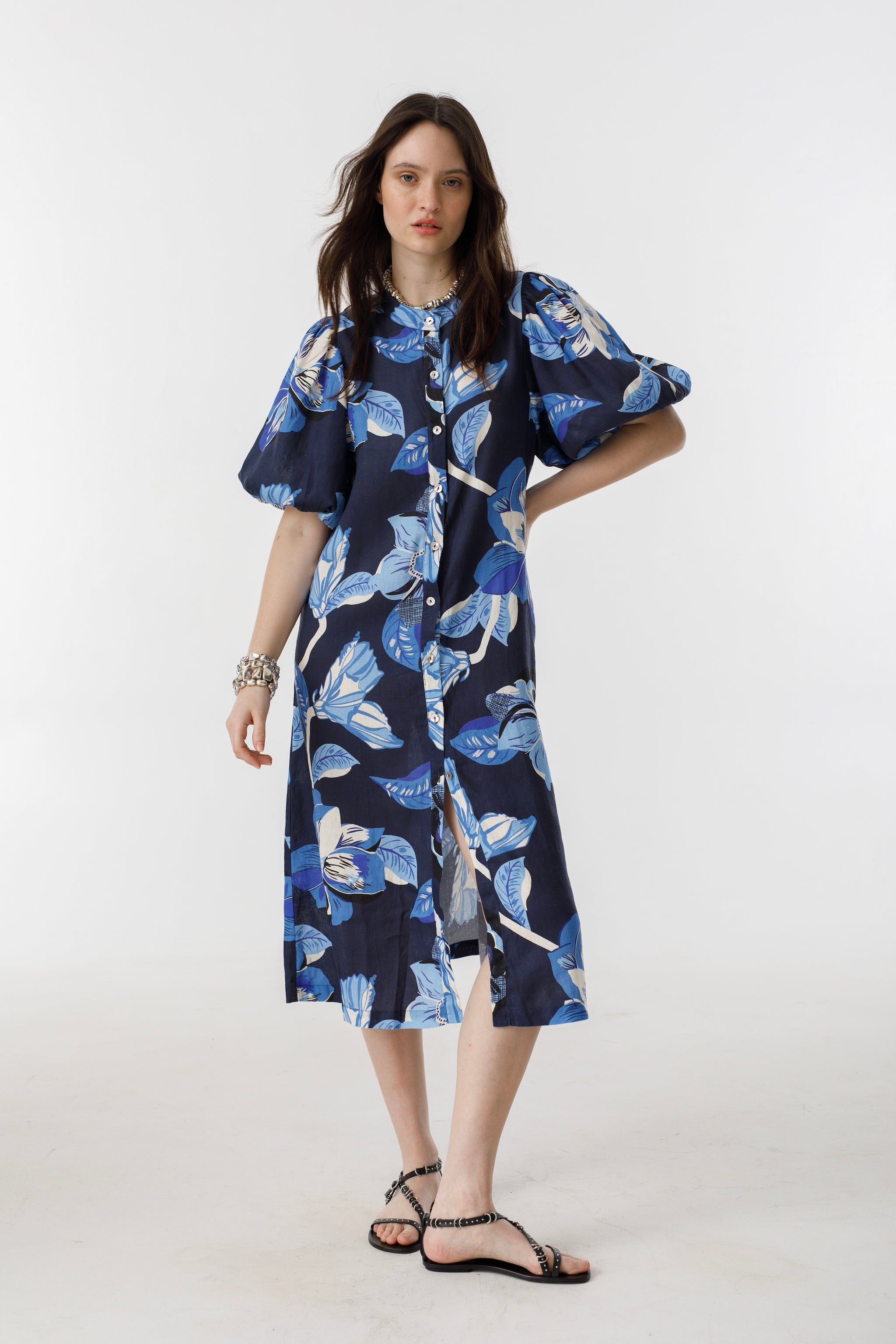 If you're seeking a feminine and comfortable dress, without a doubt, we would recommend our signature Bubble Dress. This gem has been a long-time best-selling piece, and we're absolutely certain you'll adore it. Crafted with our beloved 100% organic linen, it's pre-washed and softened for effortless care and a lovely drape. This midi-length linen dress has romantic puffed sleeves up to the elbow, a Mandarin collar, and shell buttons.