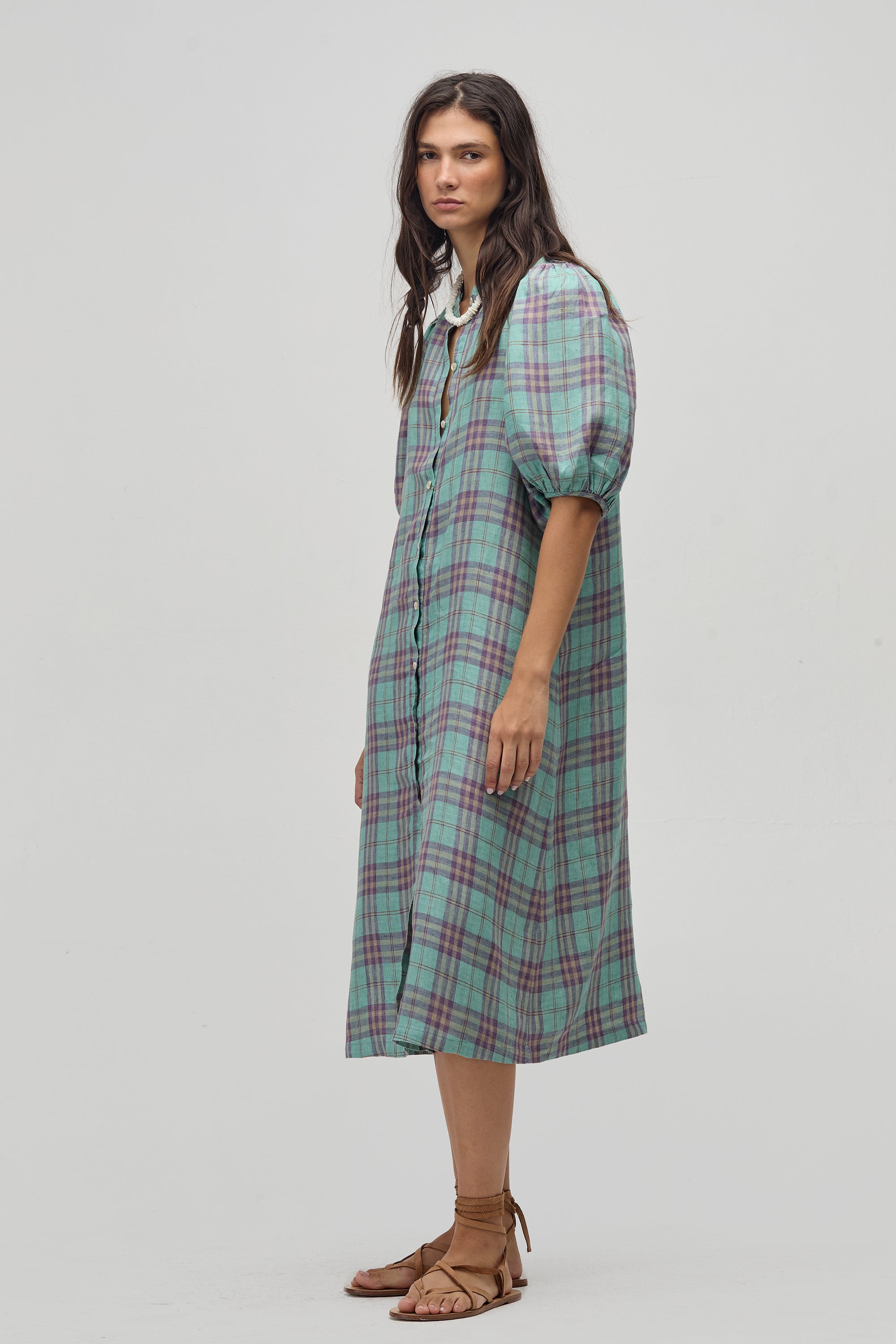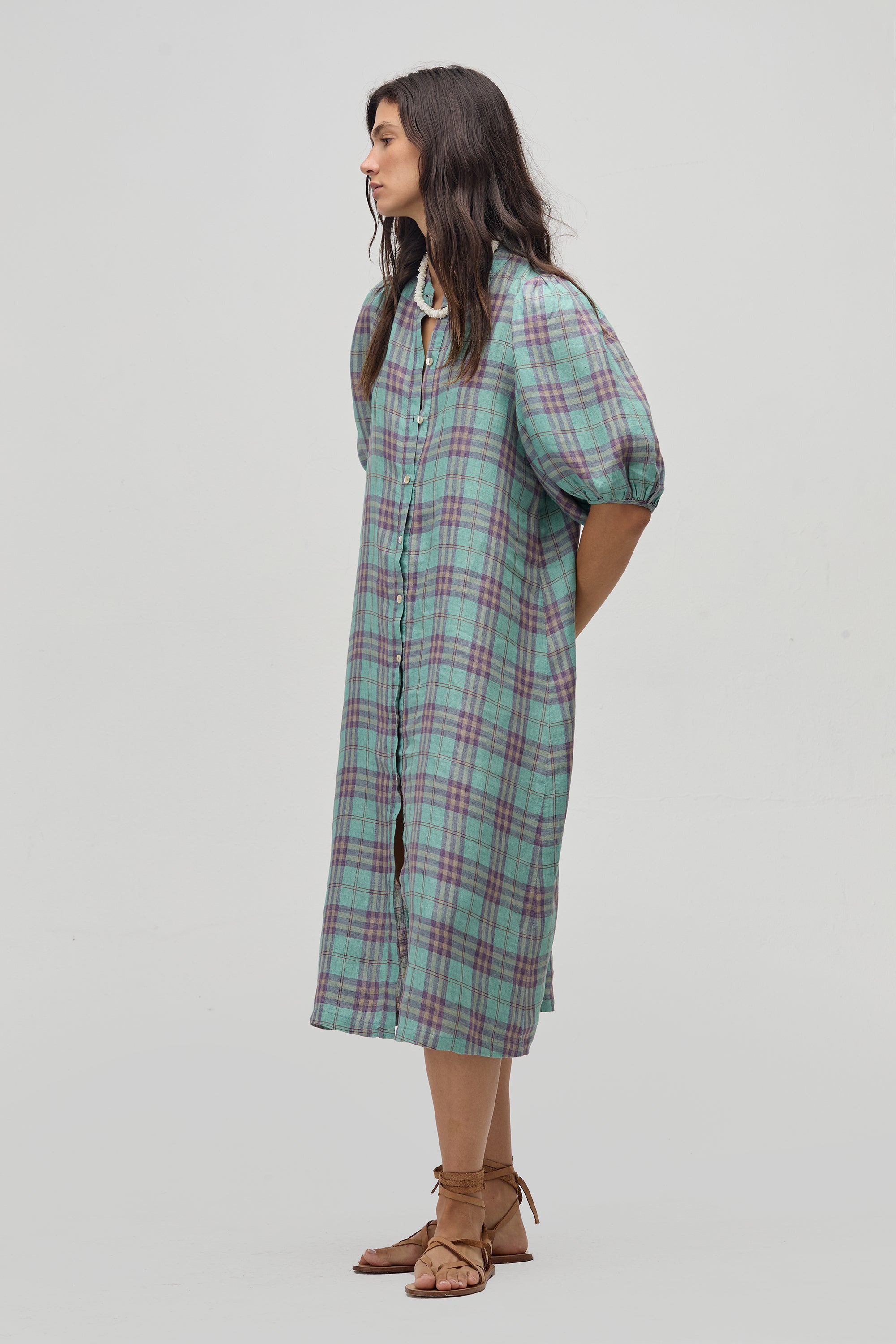 The Bubble dress made of 100% linen is a very flattering piece for any occasion. With a mao neck and puff sleeves that accentuate the A-line silhouette to create a feminine shape.