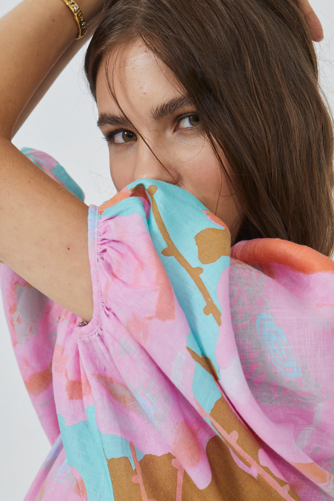 The Bubble linen top is a very feminine and flattering piece for any occasion. Features a mao neckline, button front closure, and puff sleeves. Paired it with the Luna pant, Elastic shorts, or your favorite jeans.