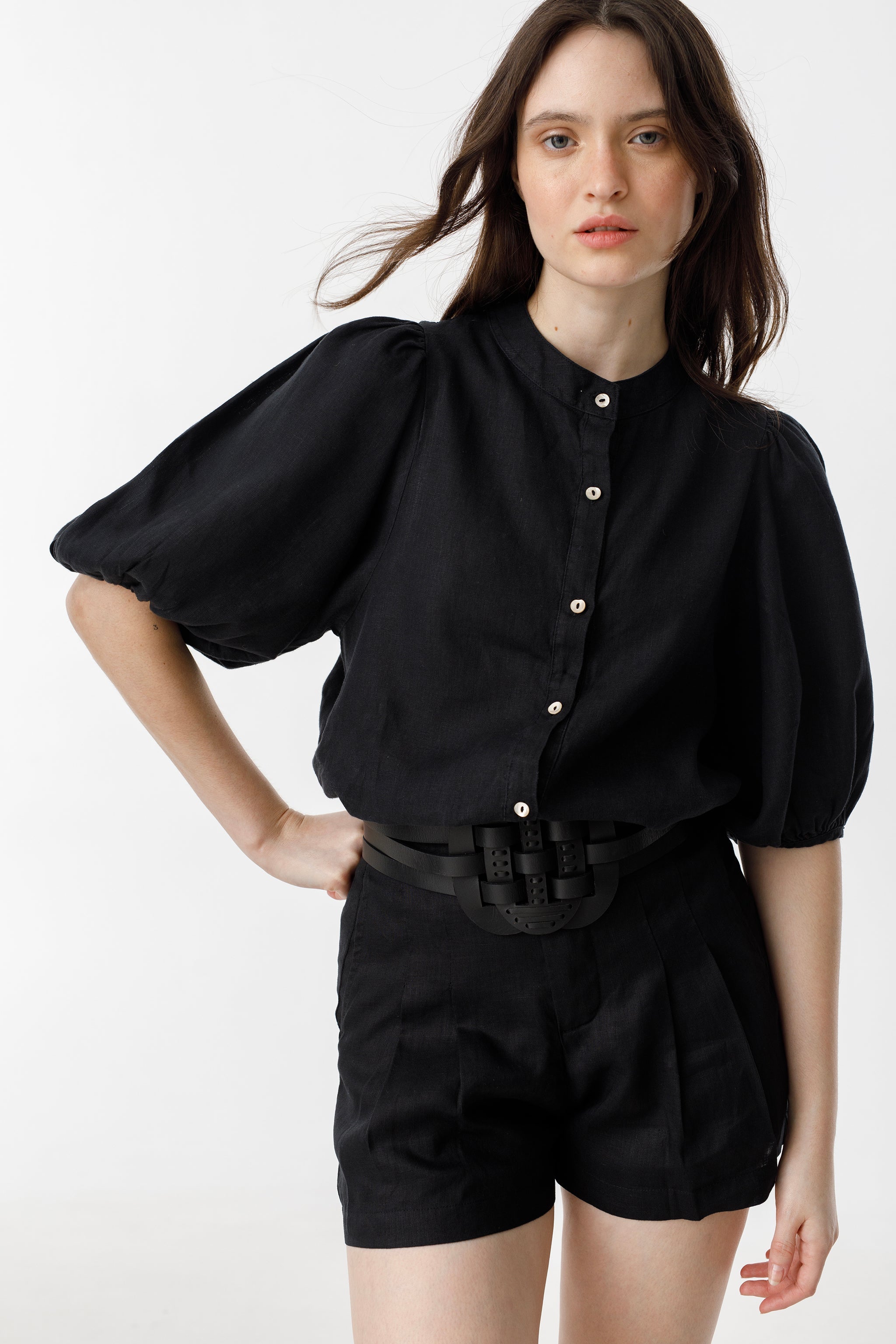 The shirt features a mandarin neckline, shell buttons, and feminine puffed sleeves.