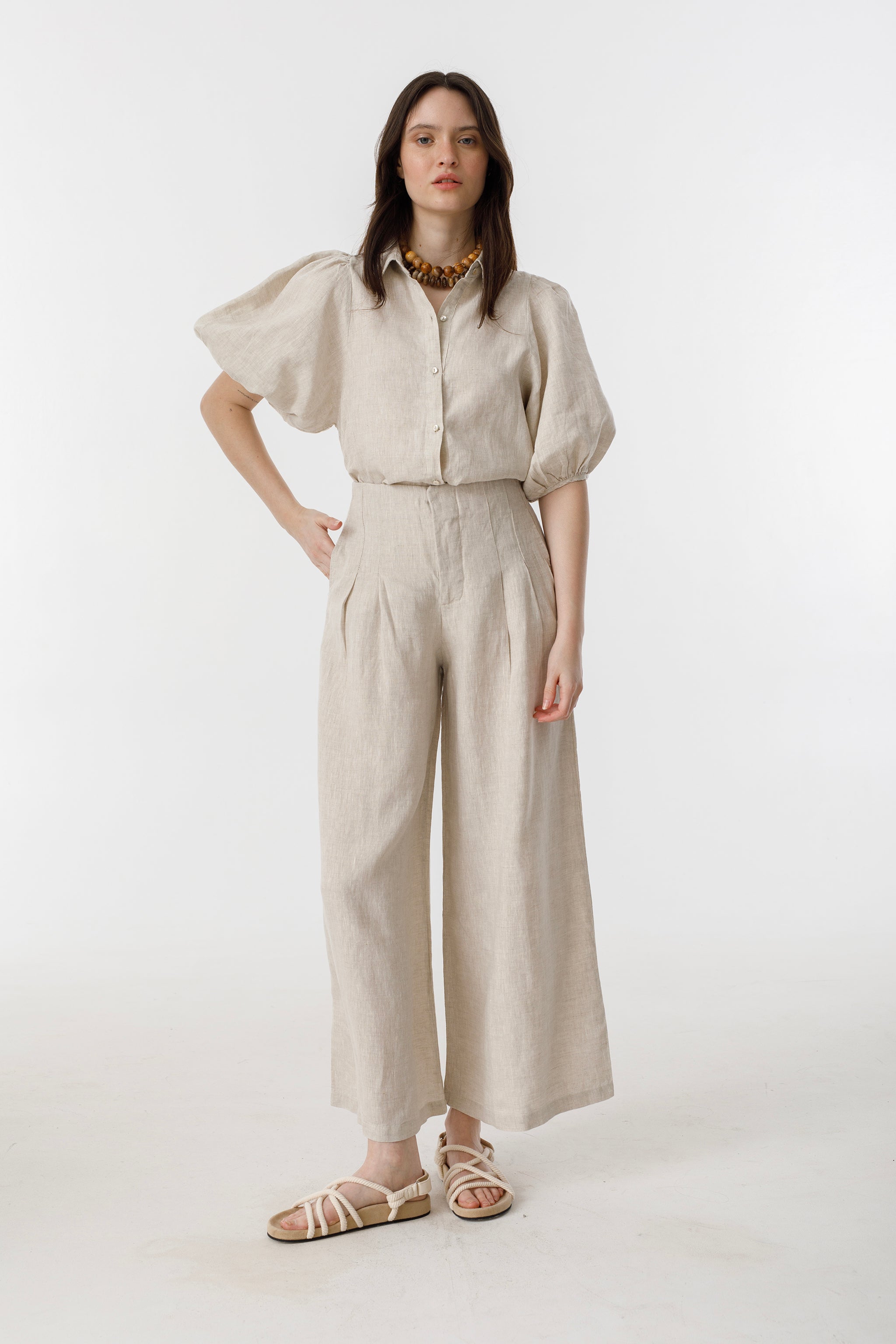 Discover our bestselling high-waisted Culotte Linen Pants, designed with a structured waistband for added support and comfort. These wide pants are perfect for those who love a snug fit around the waist and have a defined waistline. They offer a flattering silhouette and are ideal for creating a chic, polished look. They are made with our signature premium 100% organic linen. They have side pockets and front zipper fastening with a hook.
