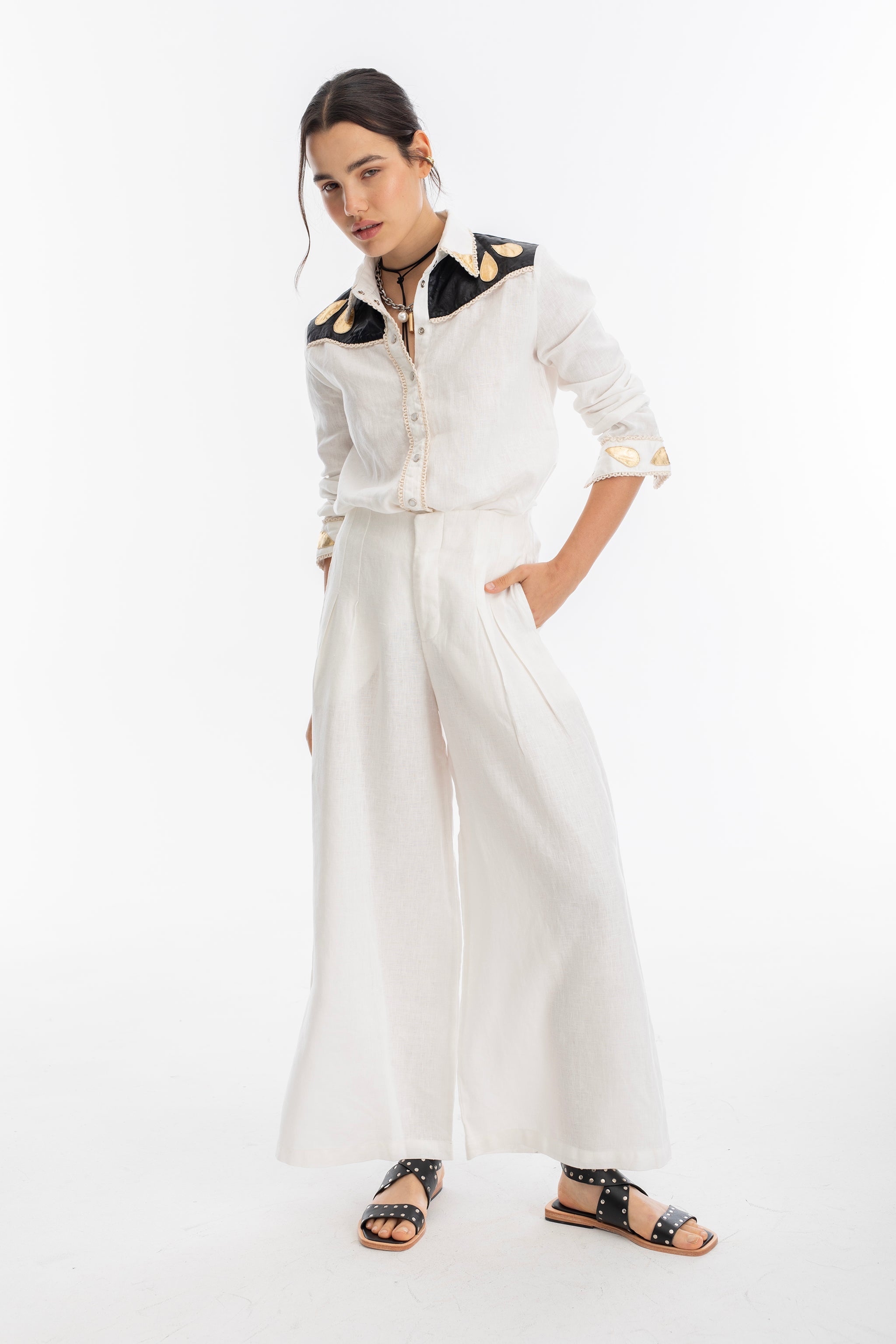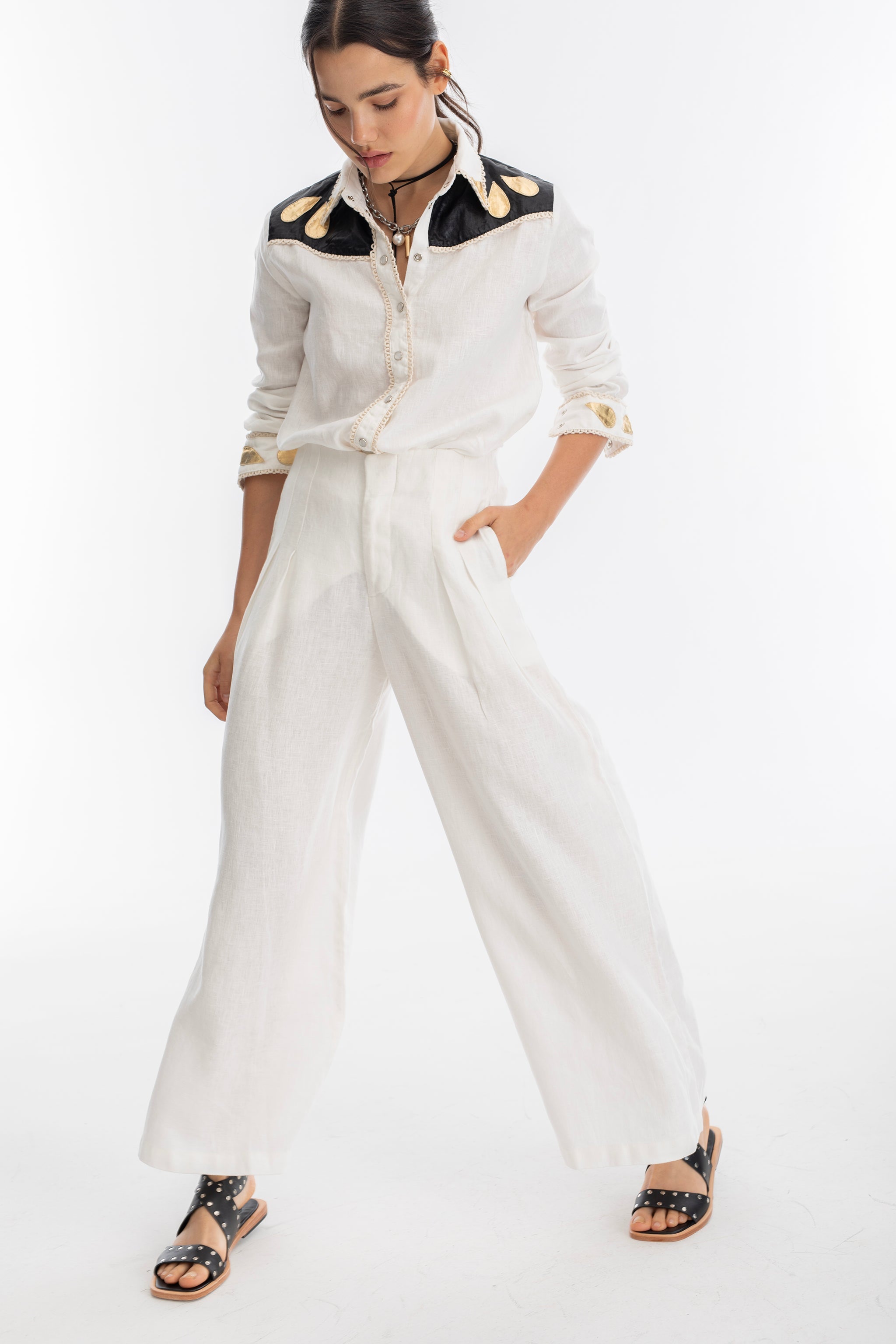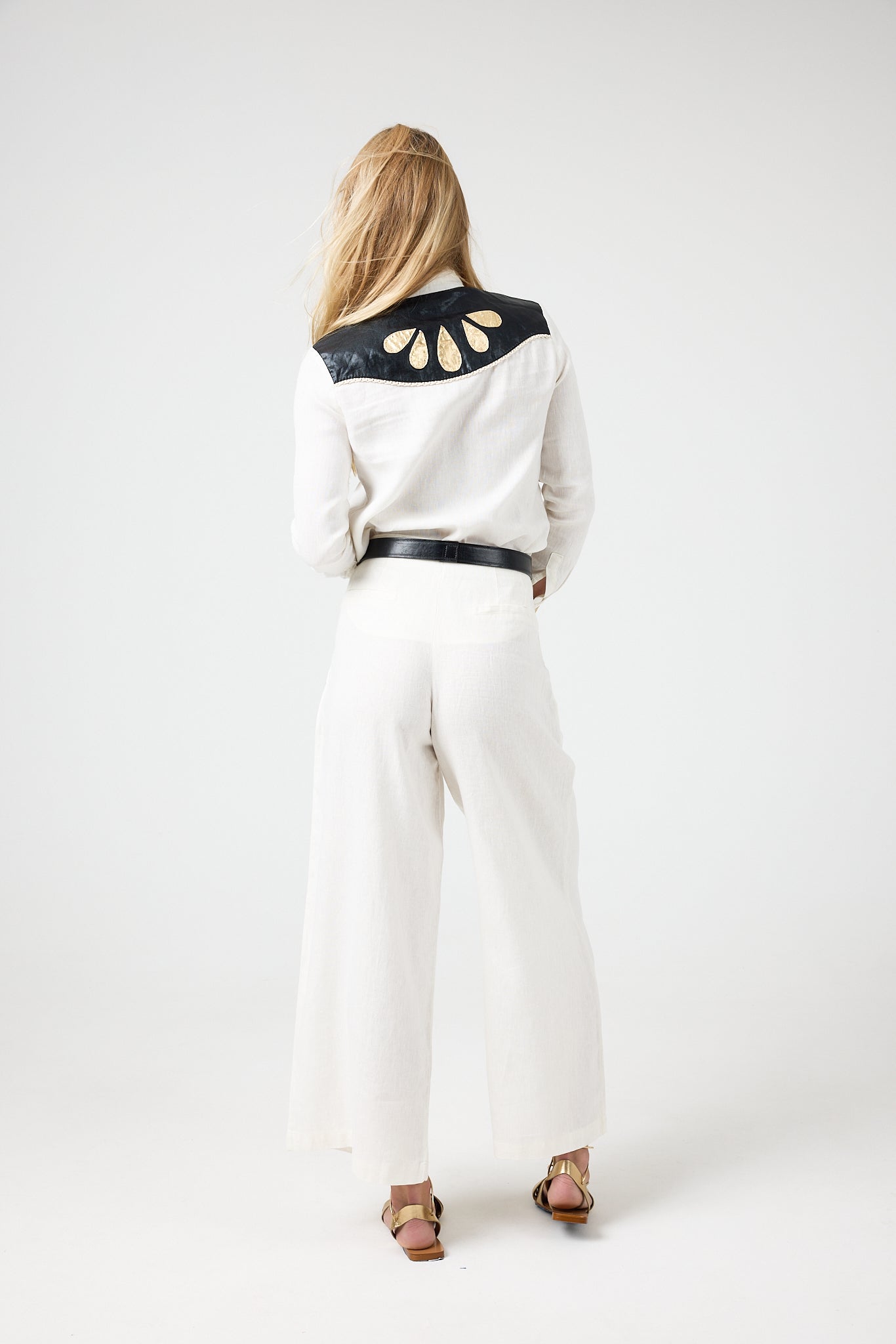 Far West Linen Shirt - Off-White with Metallic Black and Gold Appliques