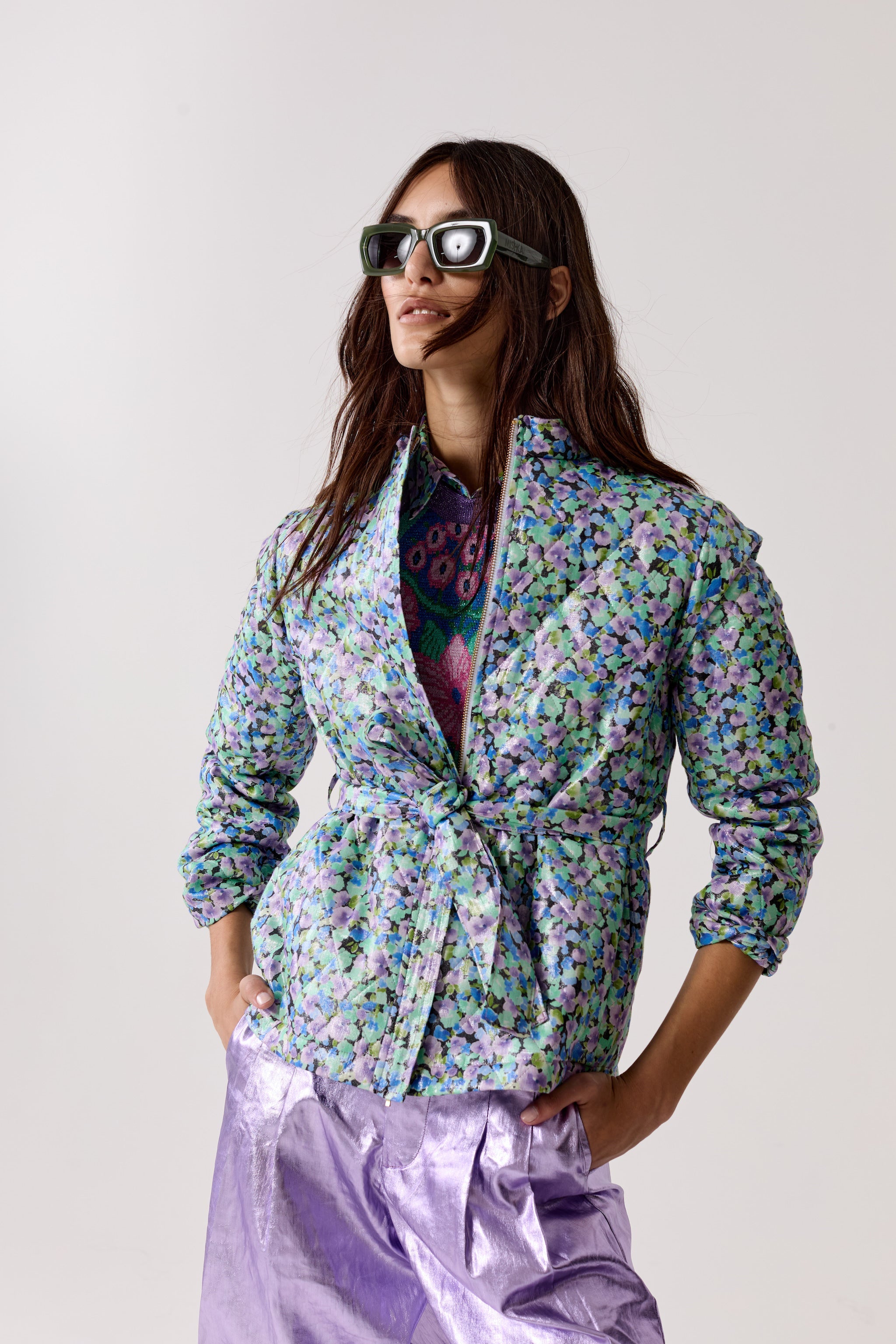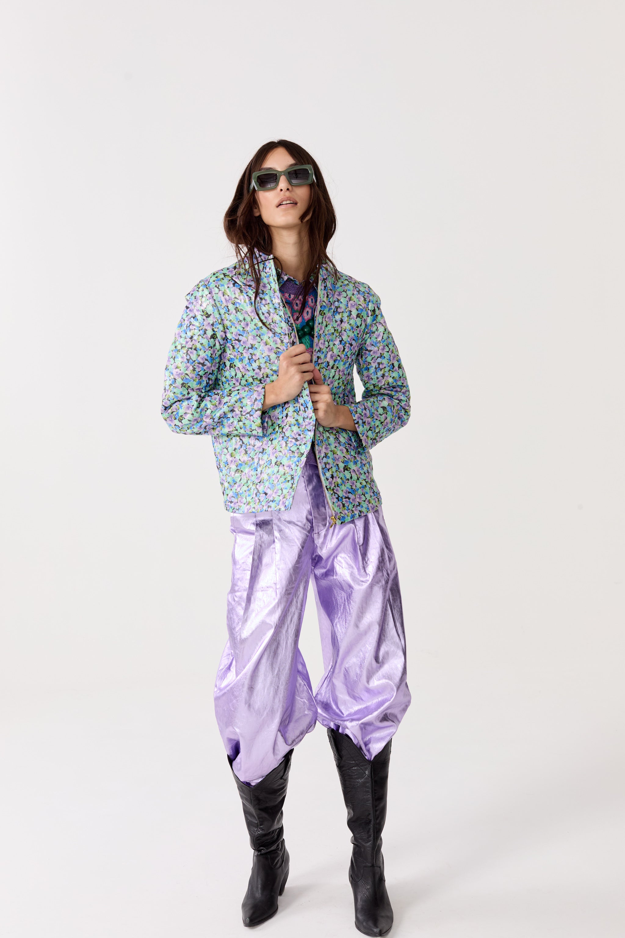 Crafted from 100% natural linen, this quilted jacket is not only printed but also finished with a metallic coating, adding a touch of shimmer to your look.