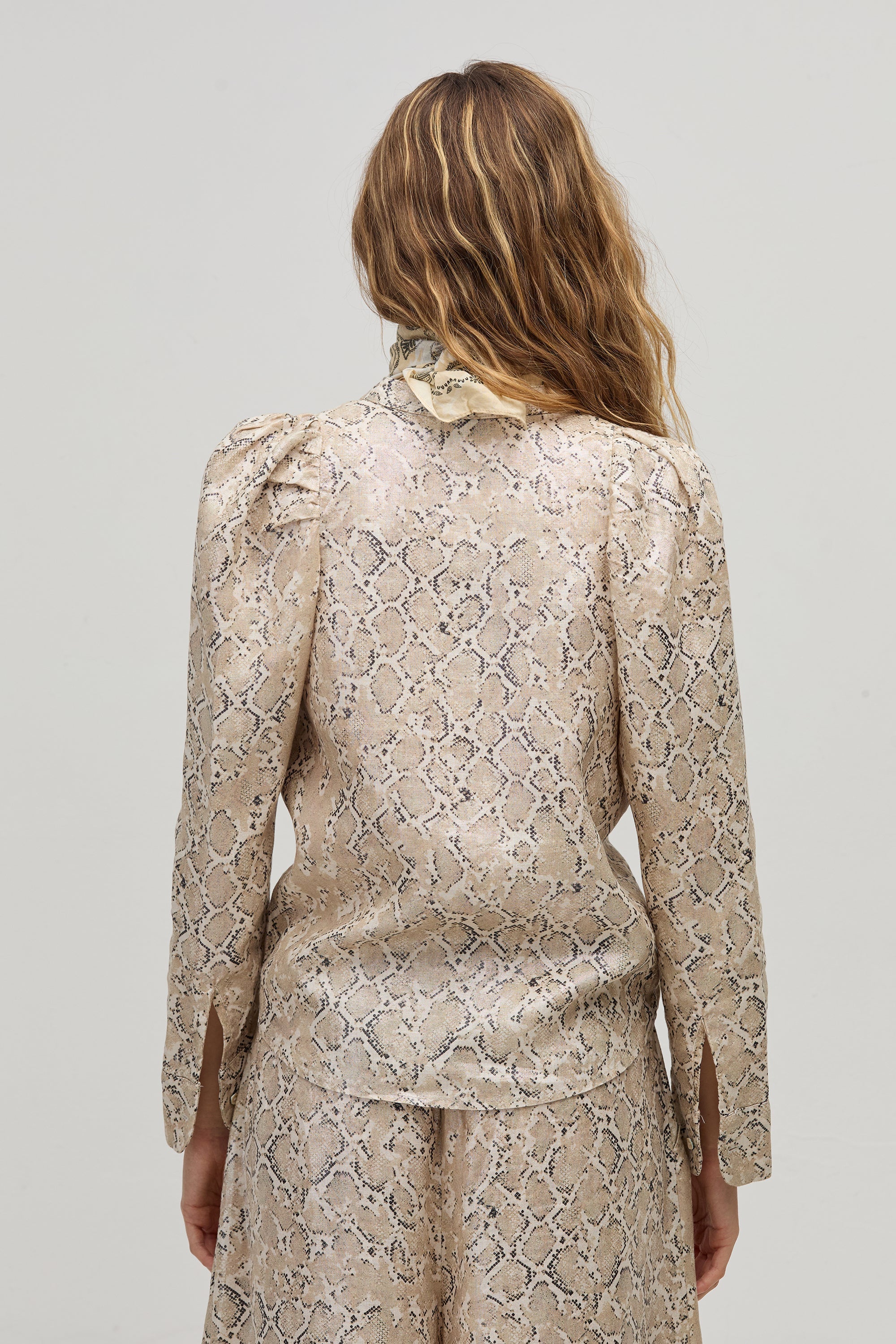 Hands down, the Lilium is our new favorite shirt. Feminine and flattering, this shirt is crafted with 100% natural linen, and it’s not only printed but also finished with a metallic coating. It features puffed shoulders and a mandarin neckline.