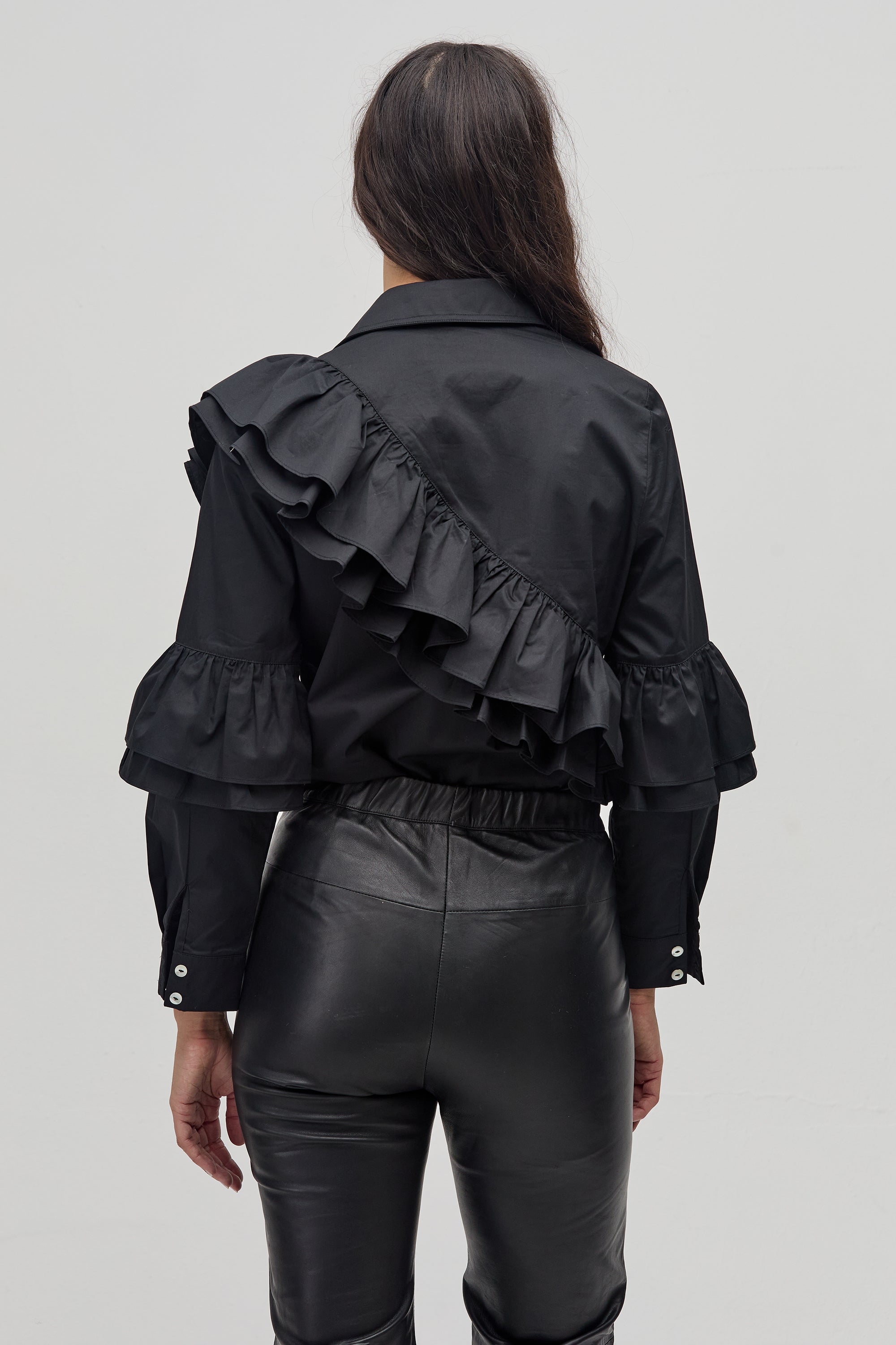 The Mambo Poplin Shirt is the standout in our collection. Its double ruffles are present on both the front and back, cascading from the shoulders to the waist, and even at the elbows, adding a playful and romantic touch. Crafted from 100% organic cotton, it features a timeless collar and delicate mother-of-pearl buttons. Step into the Mambo and make a lasting impression.