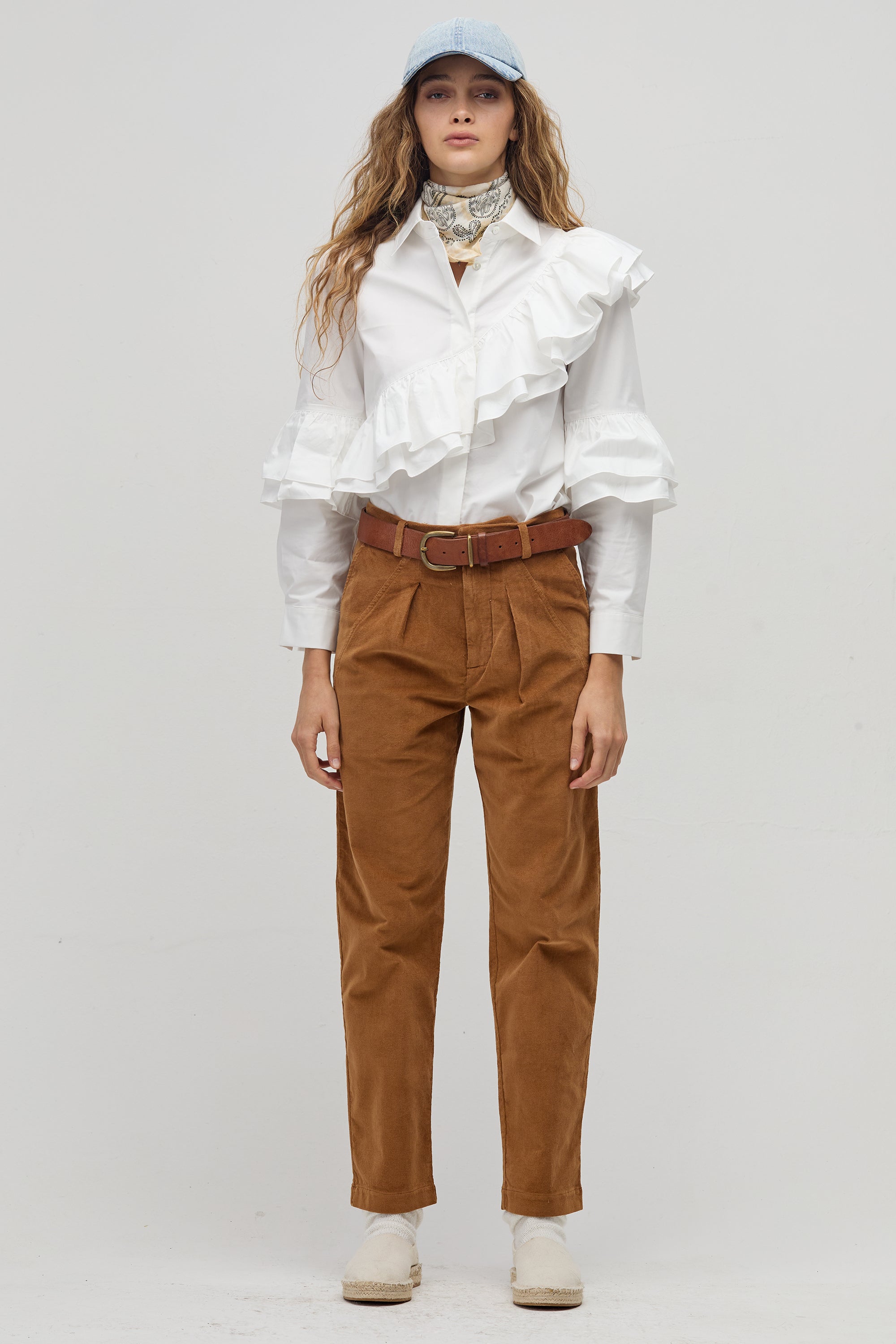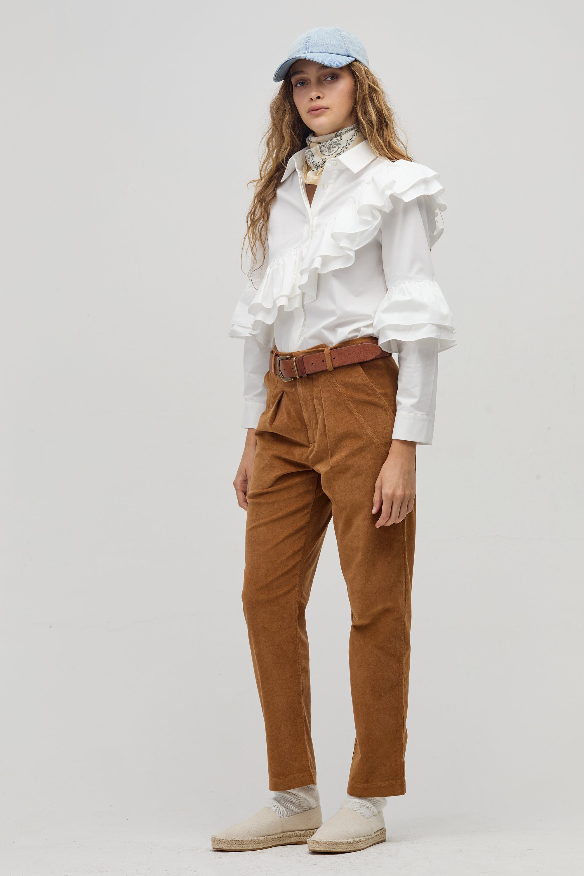 The Mambo Poplin Shirt is the standout in our collection. Its double ruffles are present on both the front and back, cascading from the shoulders to the waist, and even at the elbows, adding a playful and romantic touch. Crafted from 100% organic cotton, it features a timeless collar and delicate mother-of-pearl buttons. Step into the Mambo and make a lasting impression.