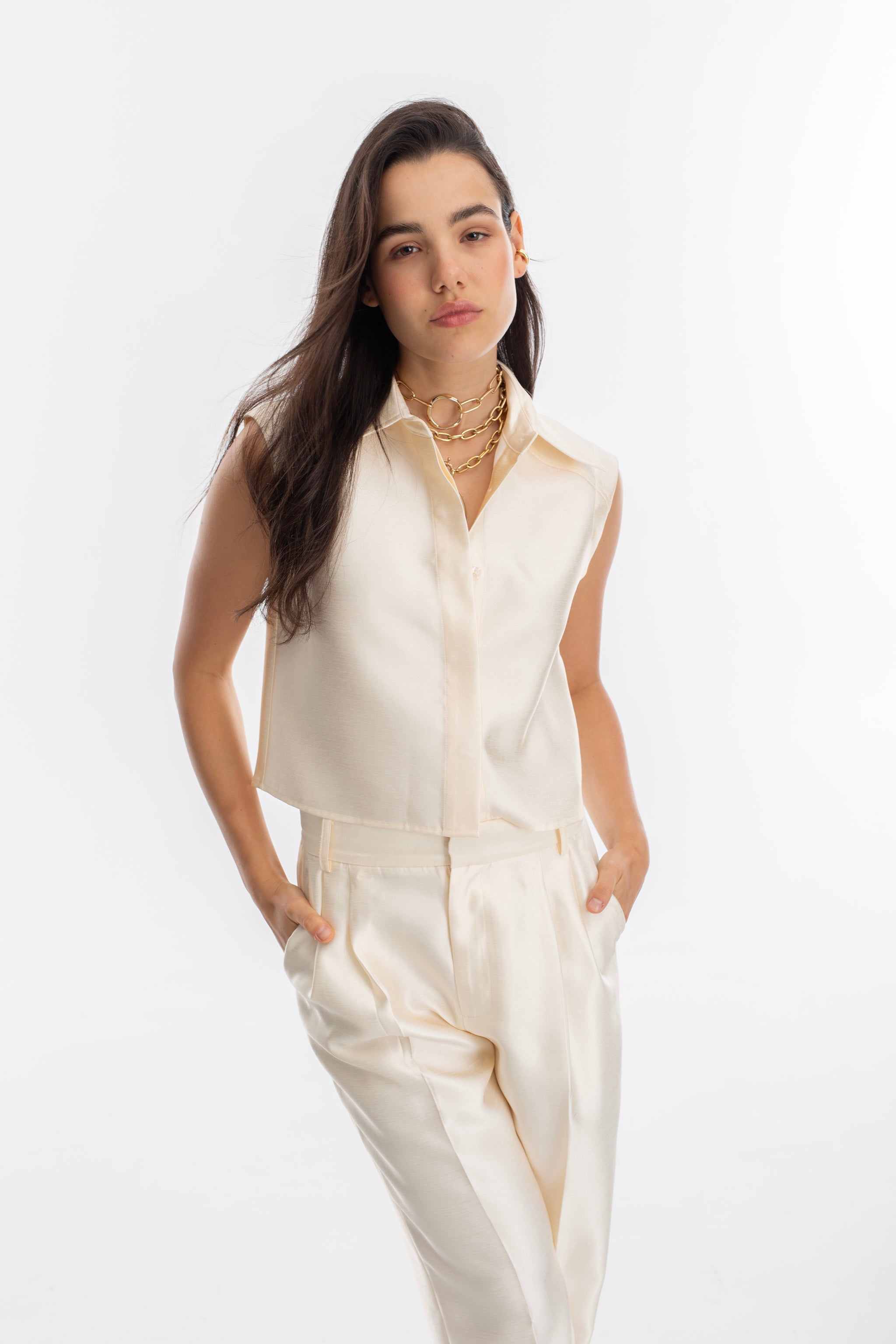 This sleeveless top offers a relaxed, boxy silhouette, and features a classic shirt collar and a hidden button placket. It’s made with taffeta fabric, which has a soft shine in a cream hue, making it perfect for the holiday season.