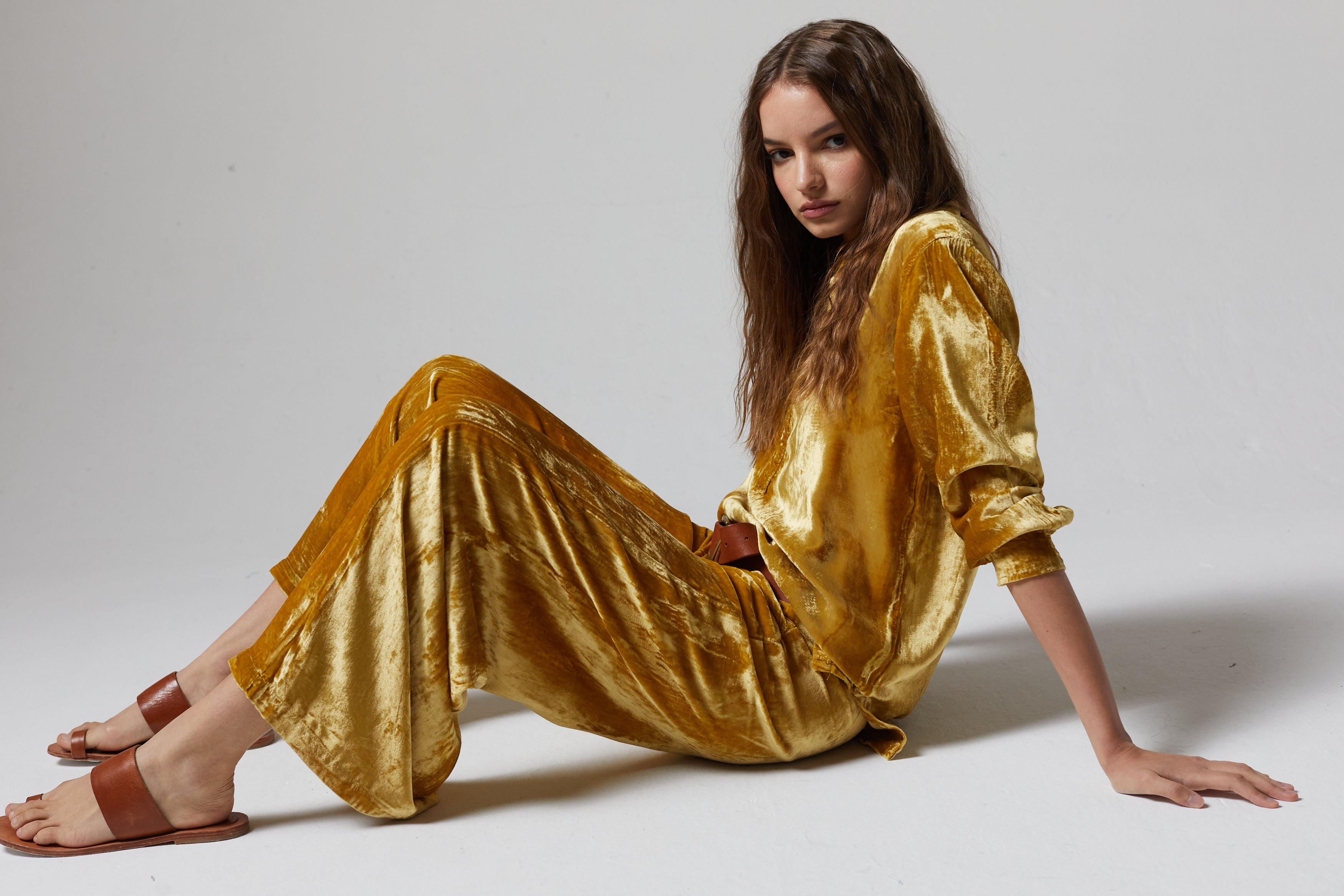 When comfy meets sophistication. The New Luna Pant features wide legs and a flattering high-waist with elastic back waistline for a better fit. The pure silk velvet elevates this style while adding a rich texture and lovely drape, making it the perfect statement piece for a special occasion.