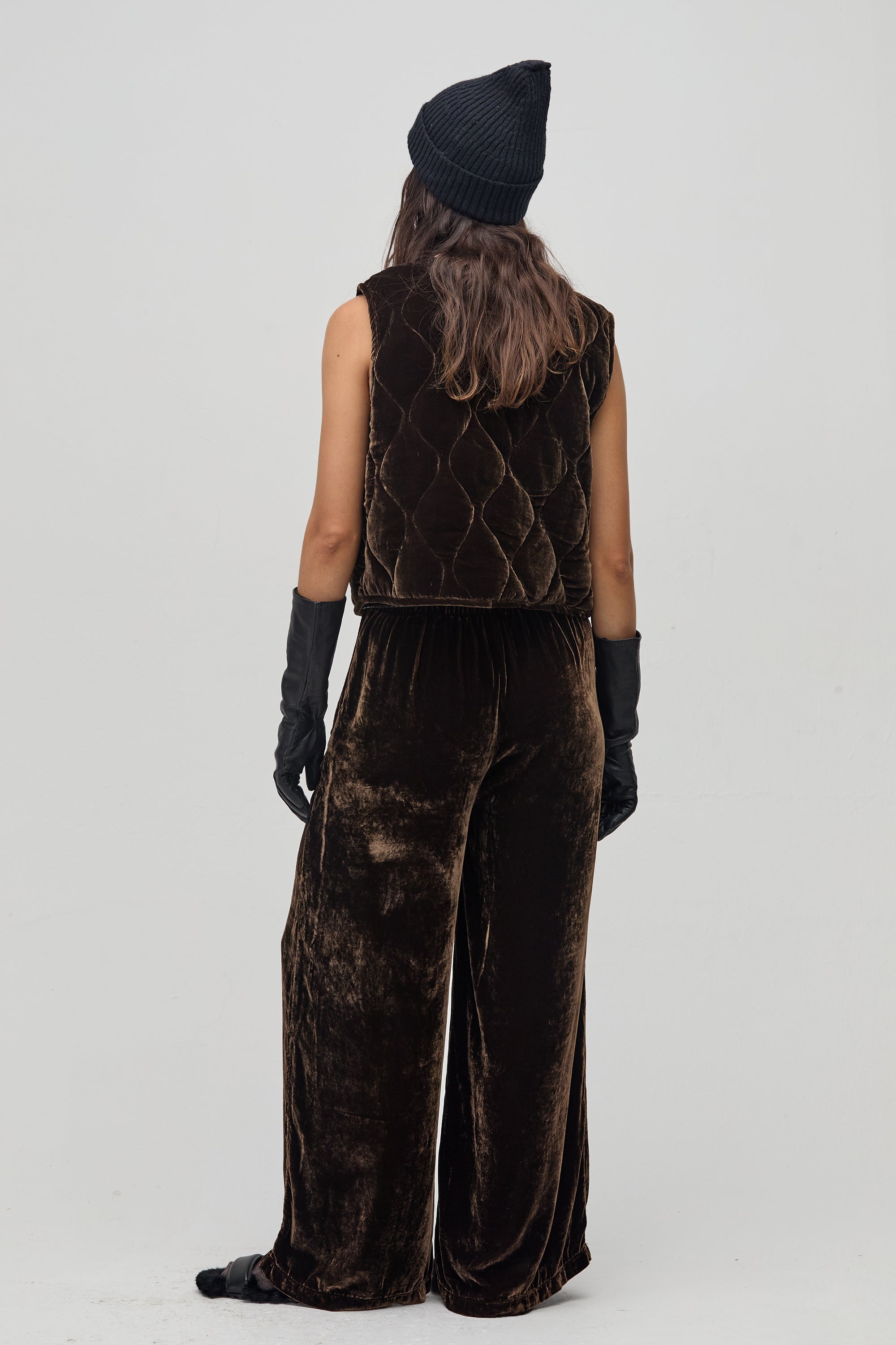 When comfy meets sophistication. The New Luna Pant features wide legs and a flattering high-waist with elastic back waistline for a better fit. The pure silk velvet elevates this style while adding a rich texture and lovely drape, making it the perfect statement piece for a special occasion.
