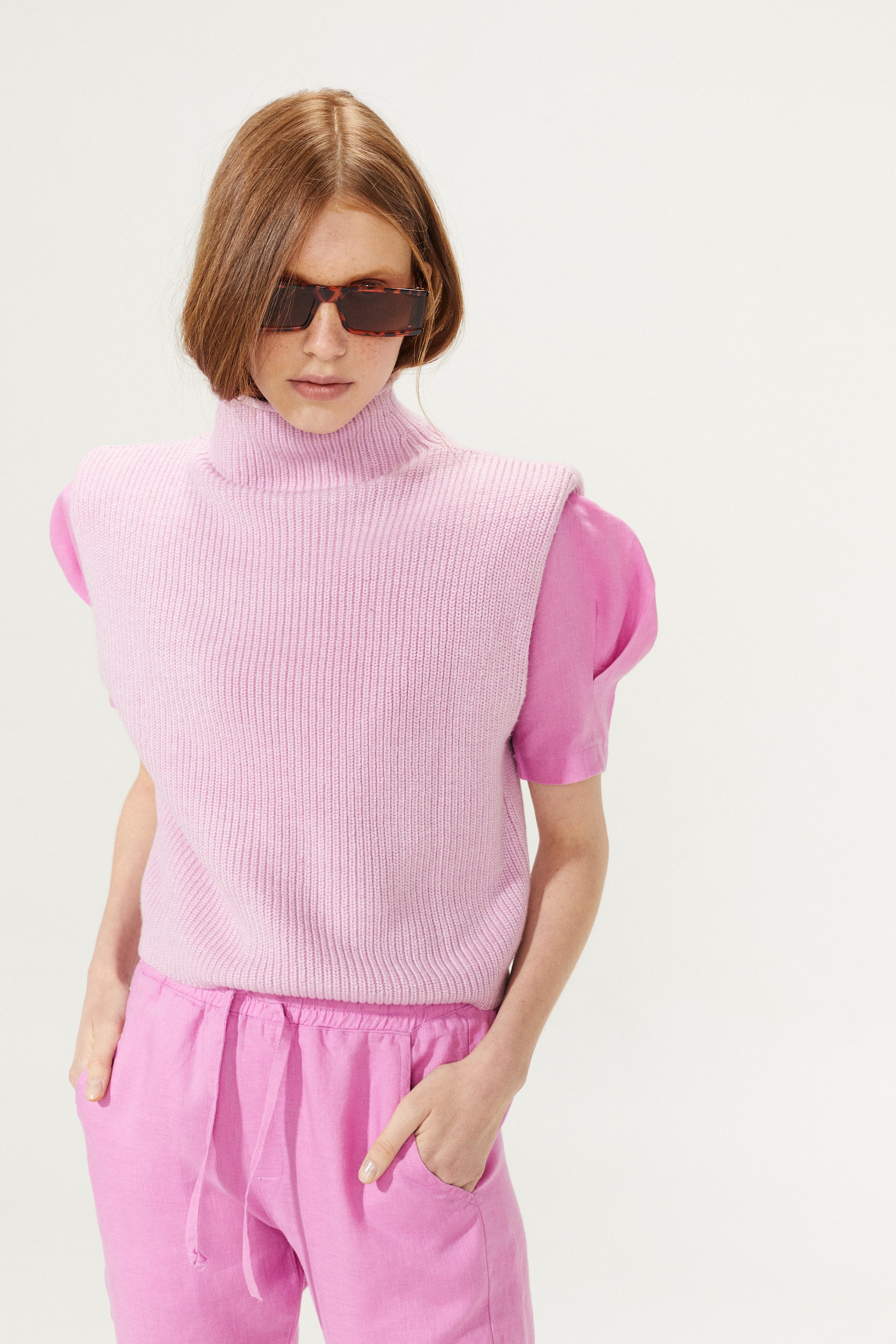 Our model is wearing it with the Athina Linen Shirt and the Power Knitted Top.