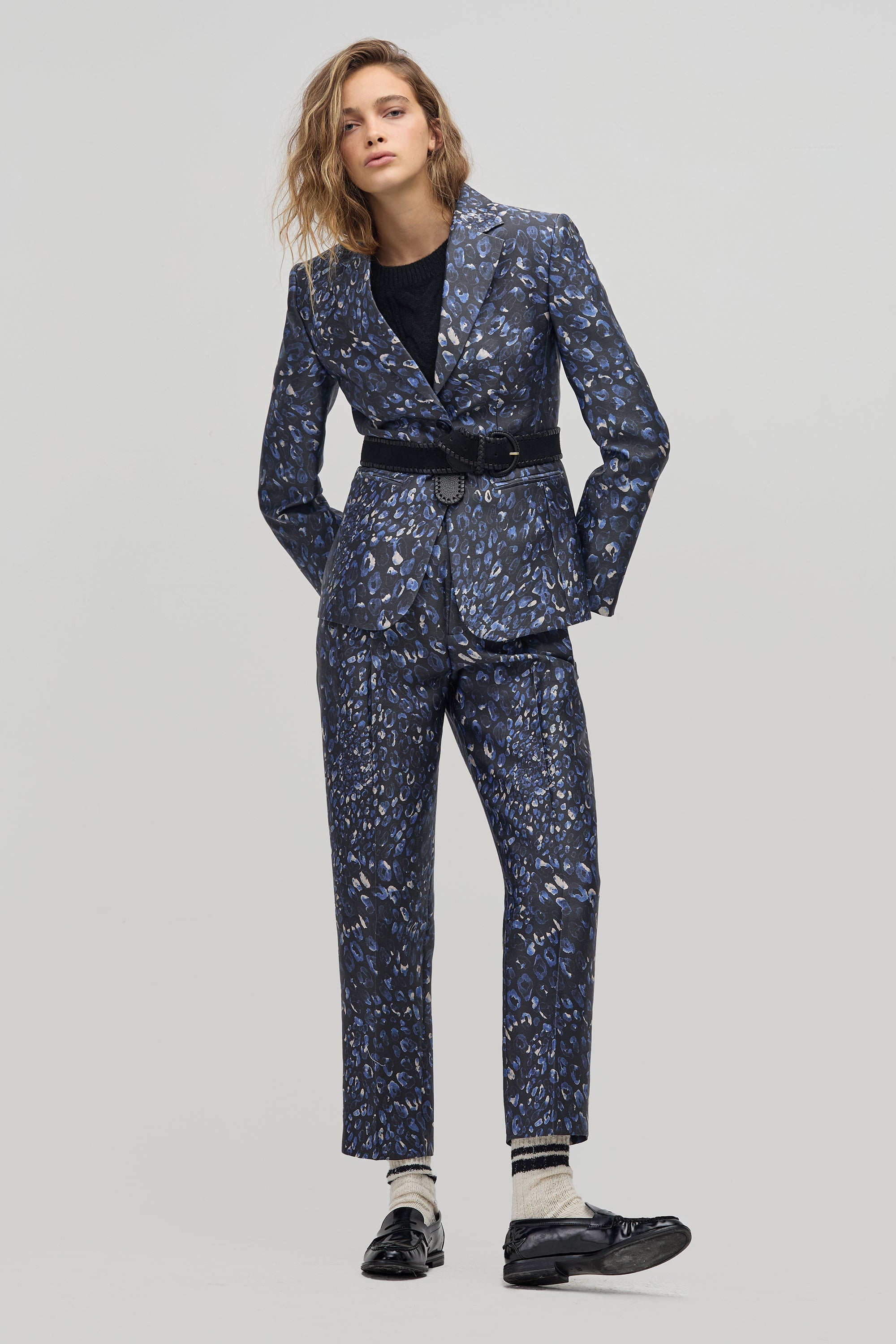 Our Oslo Blazer is one of our top picks for this FW25 Season. It features a pointed lapel and single button closure with welt pockets. It’s crafted from printed taffeta fabric, which has a soft shine in blue tones .