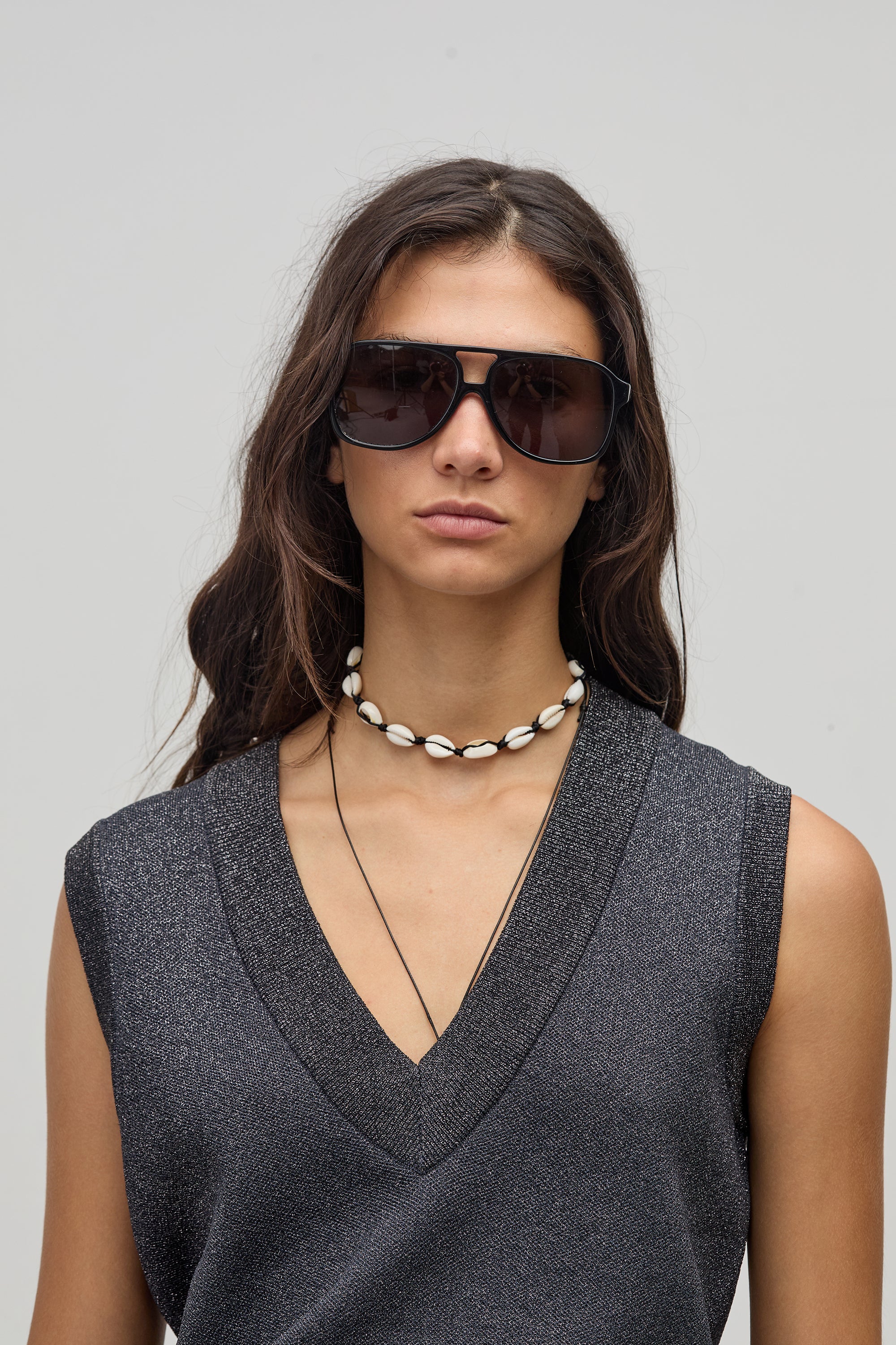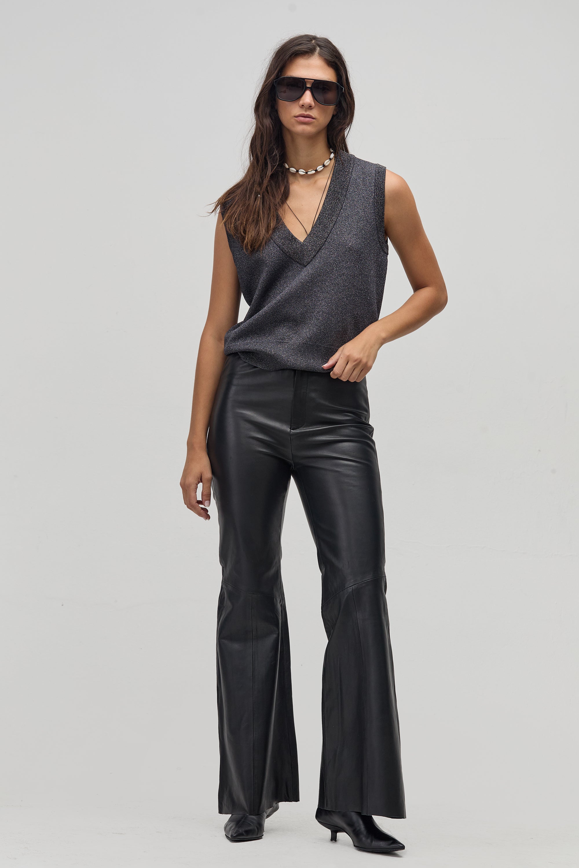Meet your new favorite wardrobe essential – our preppy knitted vest with a dash of shimmering lurex magic! This comfy and stylish V-neck vest is all about easygoing vibes and laid-back charm. Throw it on over our Samba shirt or pair it with your go-to jeans for an effortlessly cool look. With its playful lurex thread, this vest adds just the right amount of sparkle to your everyday style.
