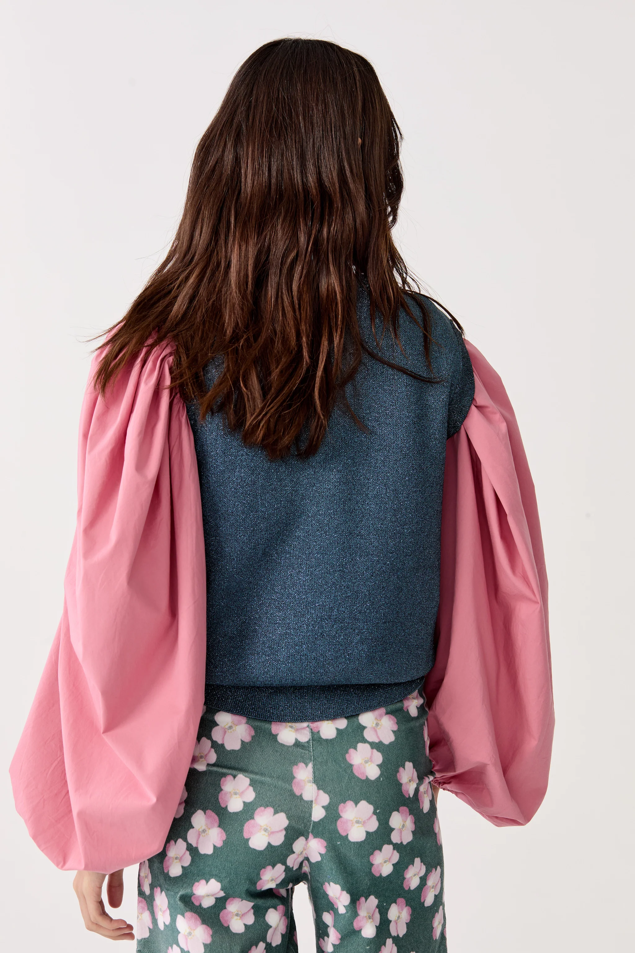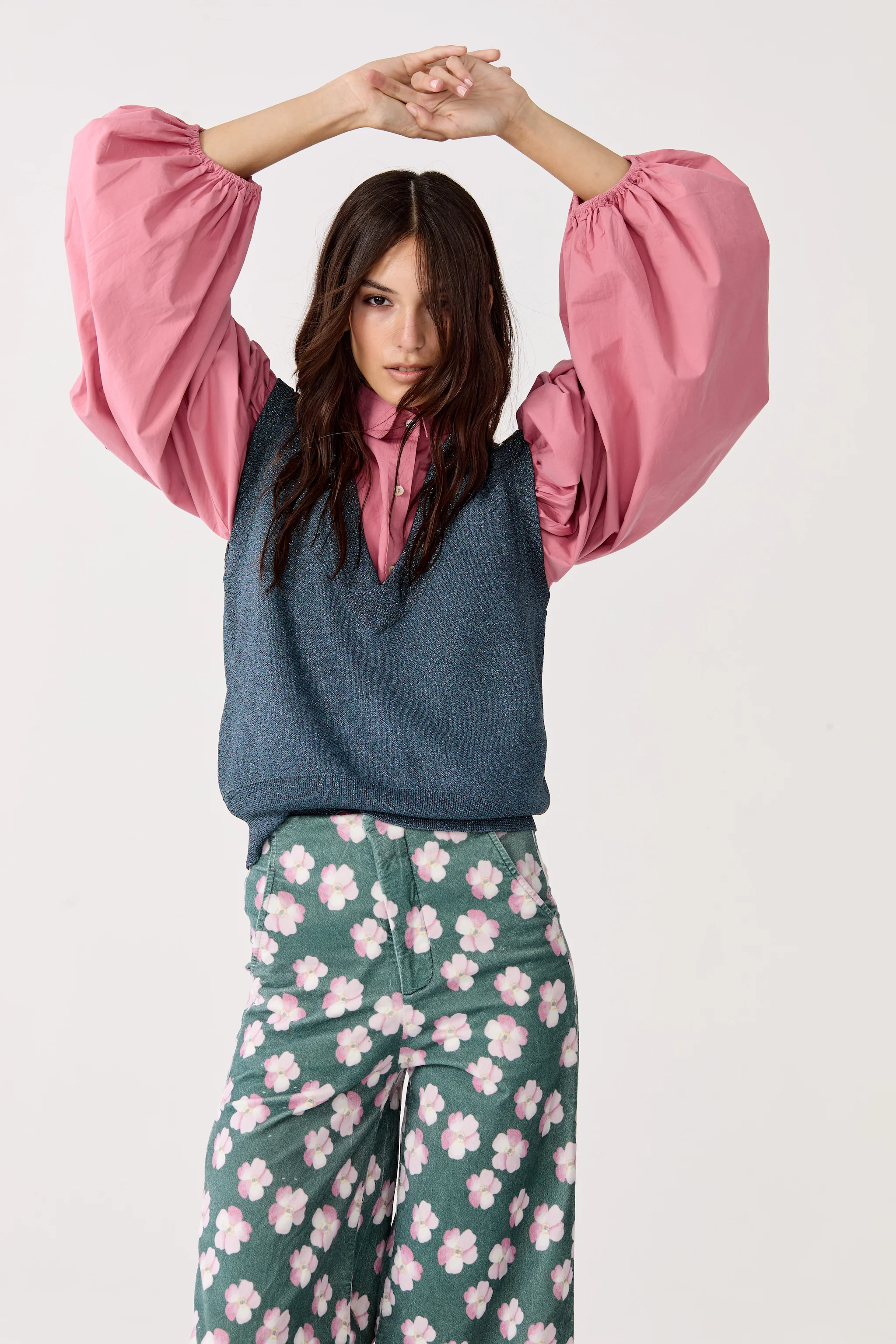 Meet your new favorite wardrobe essential – our preppy knitted vest with a dash of shimmering lurex magic! This comfy and stylish V-neck vest is all about easygoing vibes and laid-back charm. Throw it on over our Samba shirt or pair it with your go-to jeans for an effortlessly cool look. With its playful lurex thread, this vest adds just the right amount of sparkle to your everyday style.