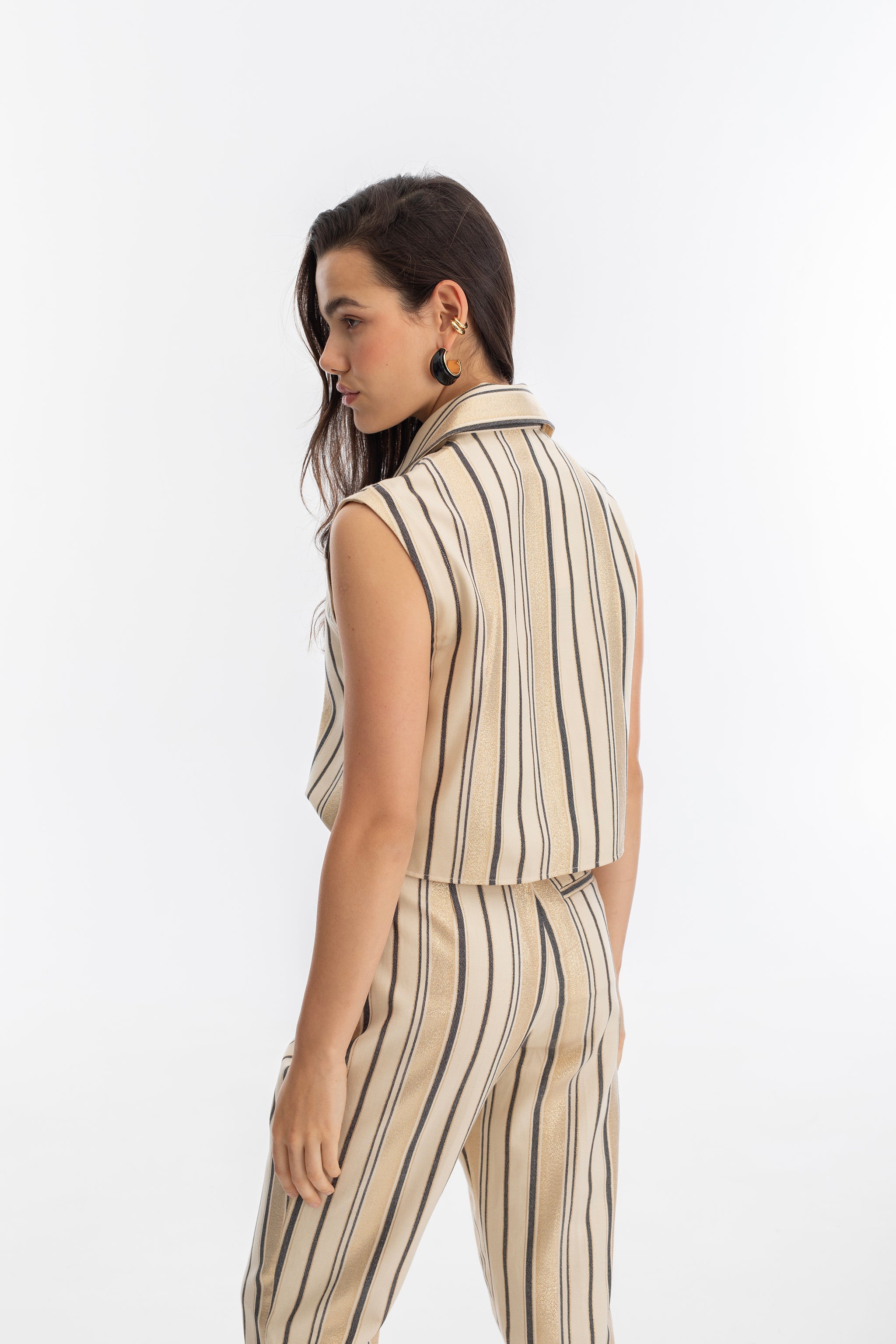 These high-waisted carrot pants feature pleats in the front and one welt pocket on the back. They are made with a cotton blend jacquard with gold stripes, making them perfect for the holiday season.