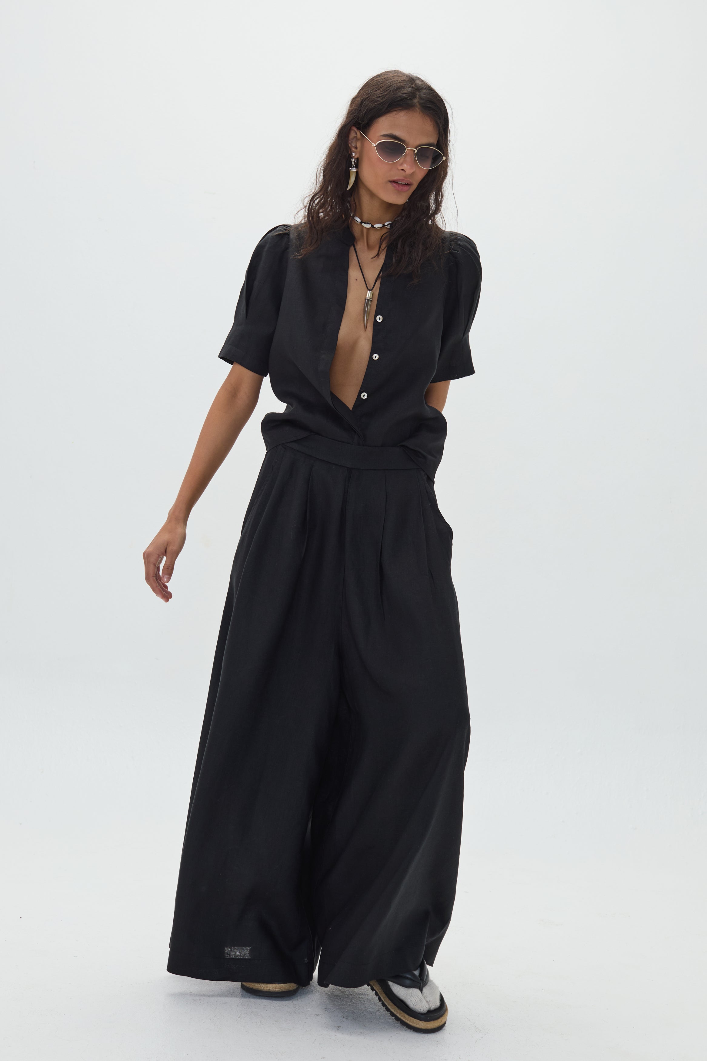 These super wide linen pants are flattering and easy. They feature a high waist with front pleats and an elastic band on the back for great comfort. The Sabi Pants are crafted from 100% natural linen, which is finished with a metallic coating.