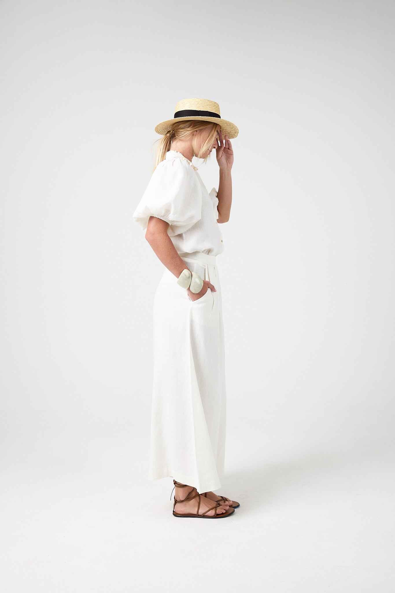 These super wide linen pants are flattering and easy. They feature a high waist with front pleats and an elastic band on the back for great comfort. The Sabi Pants are crafted from 100% natural linen, which is finished with a metallic coating.
