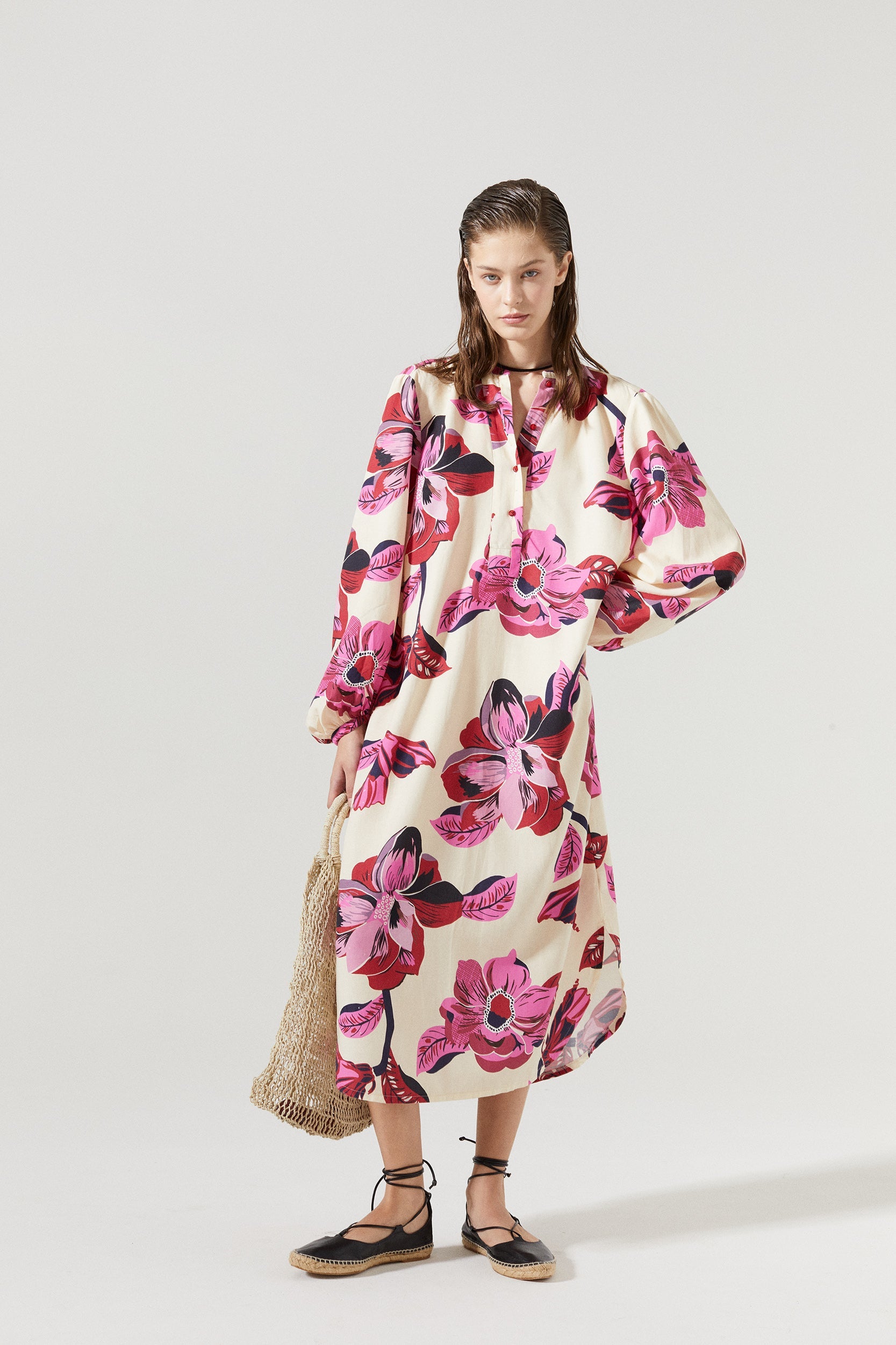 The oversized Sake Dress is super comfy and elegant, featuring a mao neckline and puffed long sleeves. Our exclusive Hibiscus print adds a colorful and feminine vibe to this style.