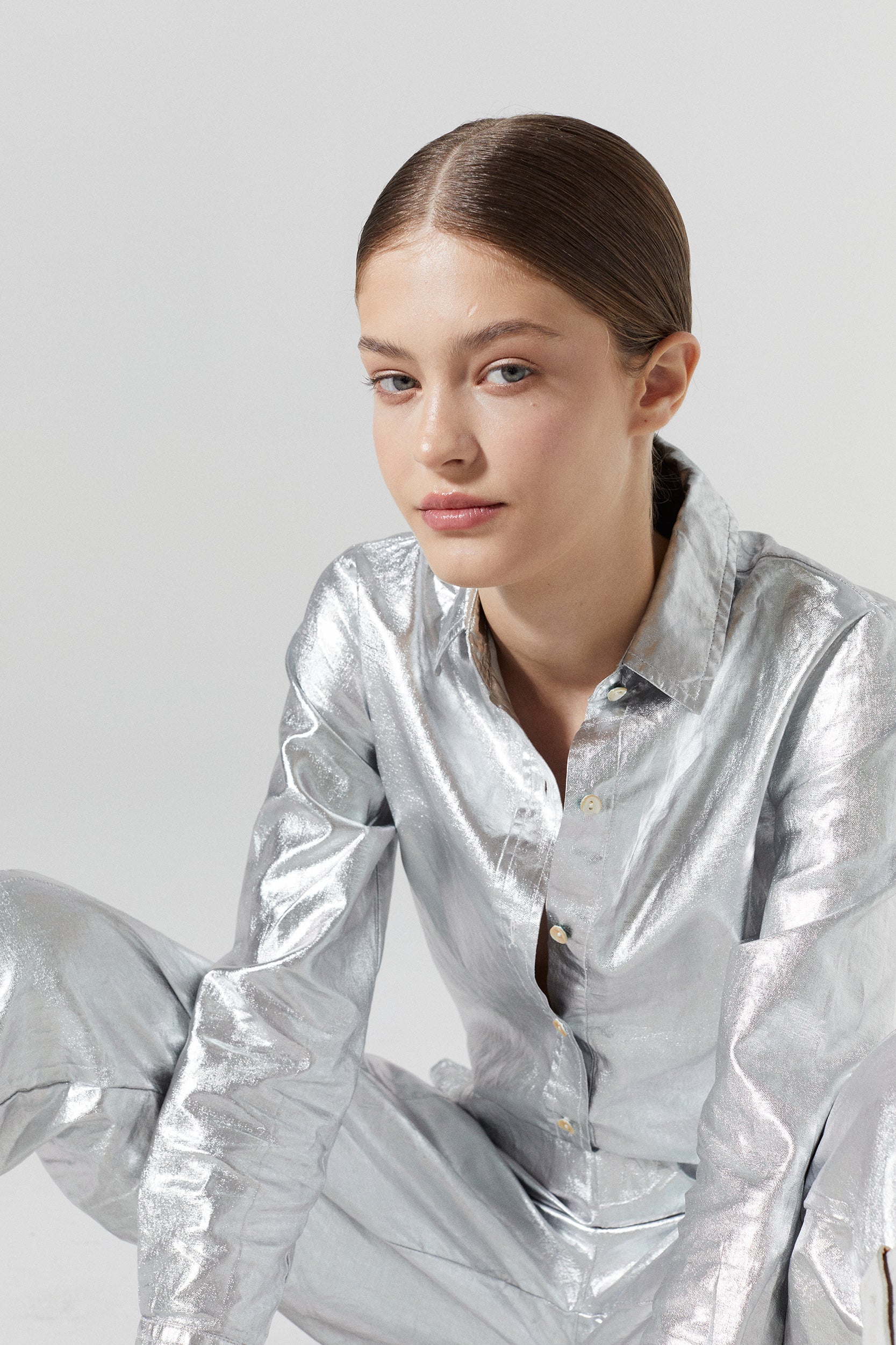 Our metallic San Marino linen shirt is the perfect elevated statement piece to have on your wardrobe. It is made of 100% organic linen with a metallic foil print, and its curved hemline is longer on the back for a super flattering silhouette. Wear it open over a white Mar Crop Top and roll up the sleeves to just below the elbow for a carefree chic vibe.