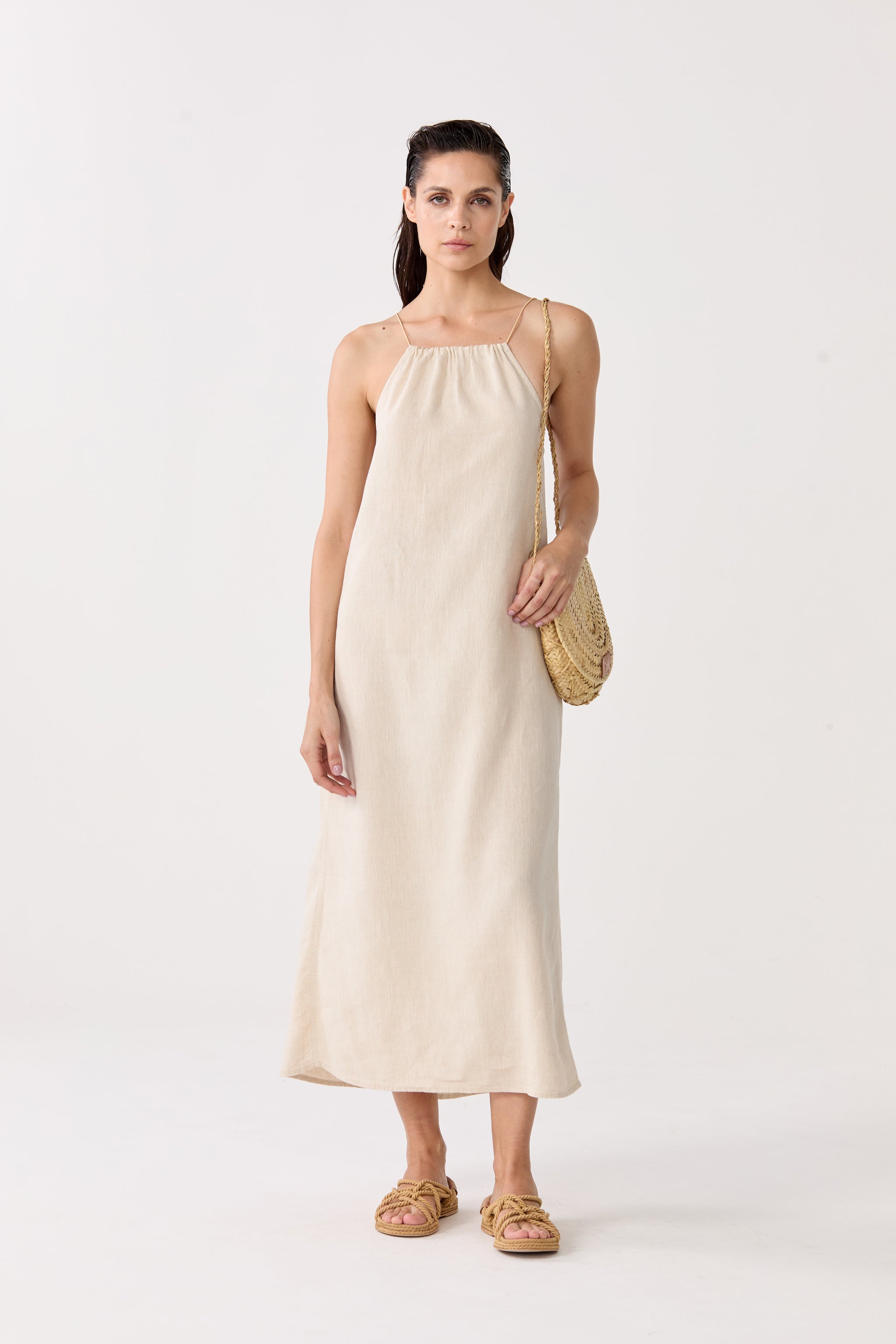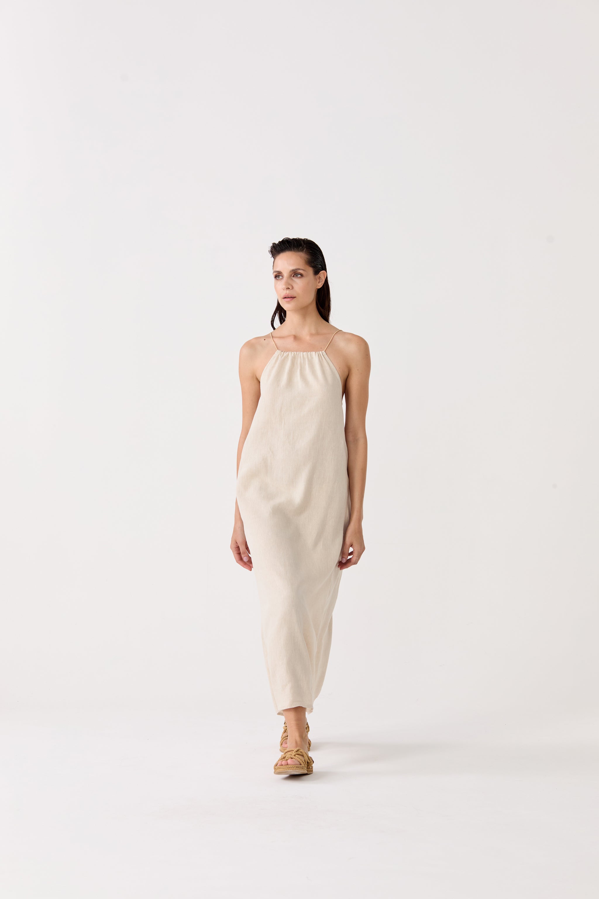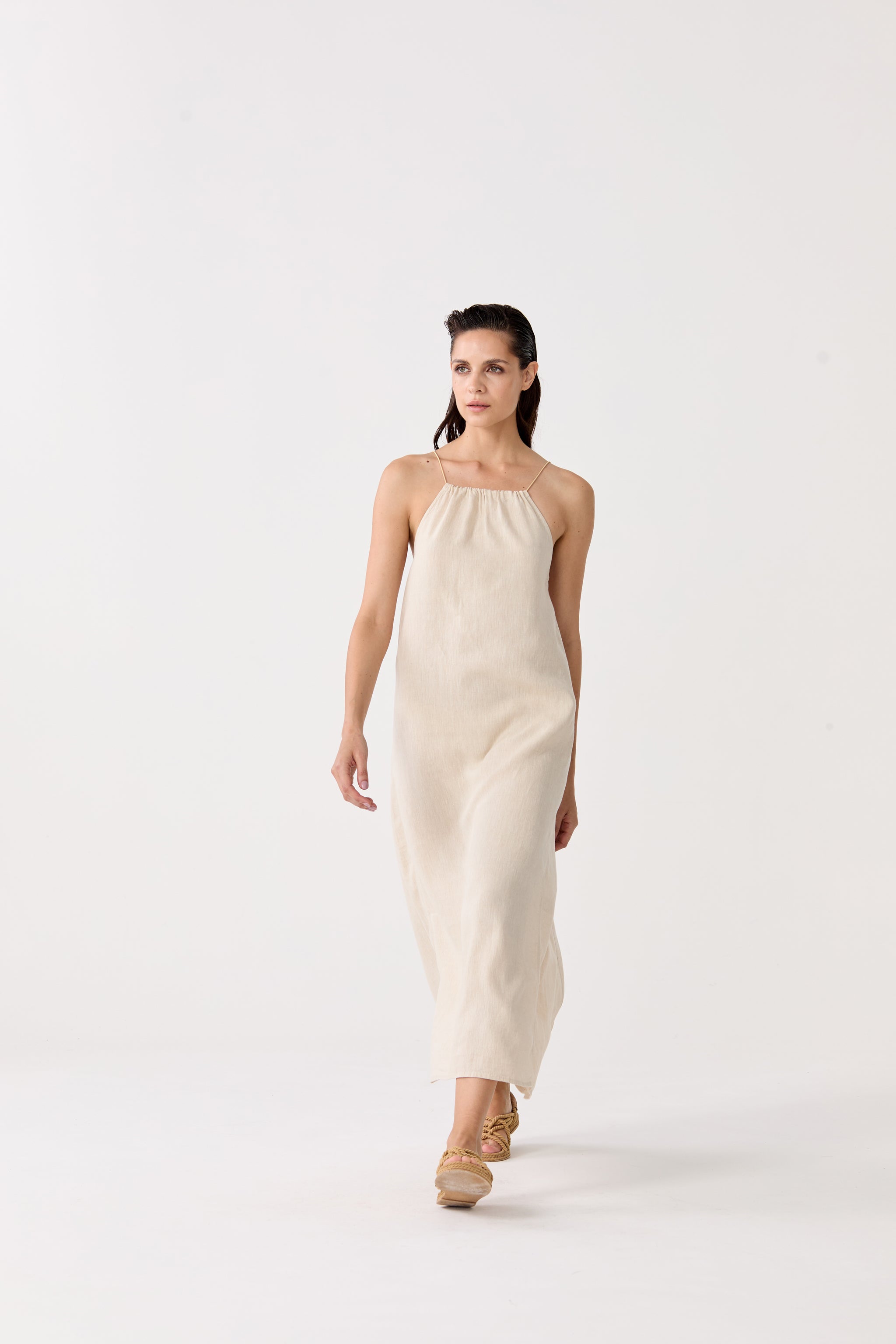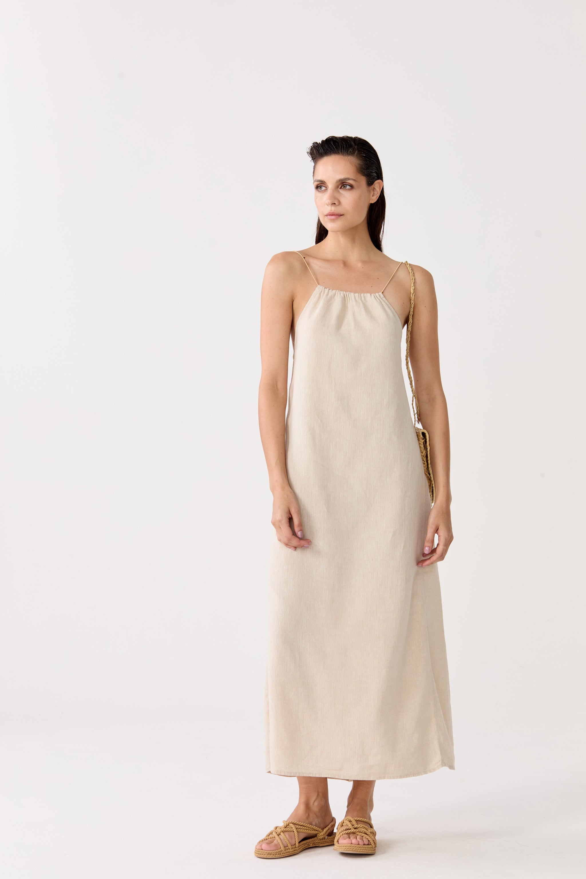 The Sophie Linen Dress is feminine and modern. Crafted from 100% natural linen —pre-washed and softened for a super easy handling— this sleeveless long dress features adjustable elastic spaghetti straps that make it comfortable and elegant. A subtle gathering at the back allows for more movement.