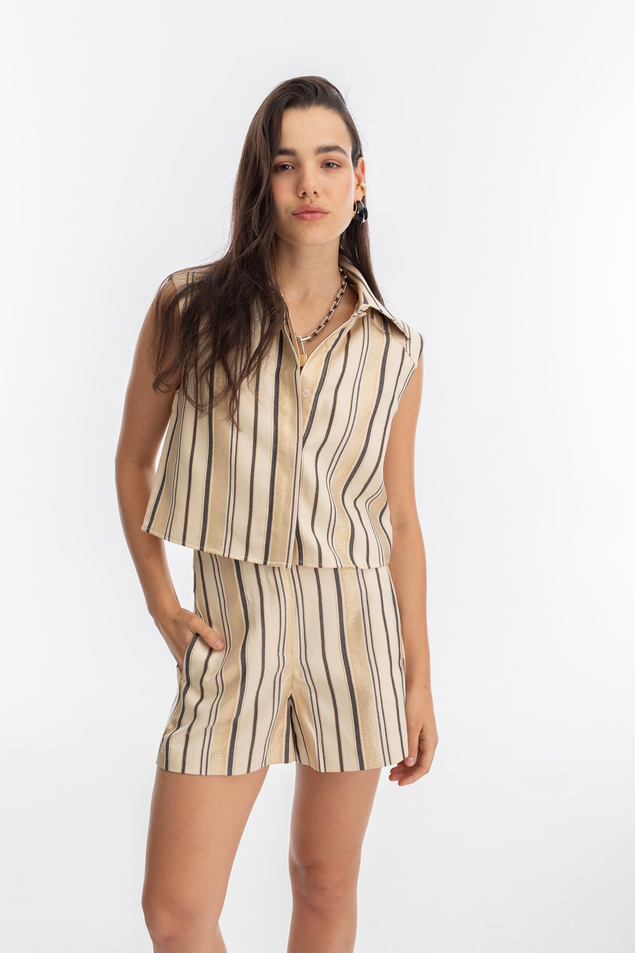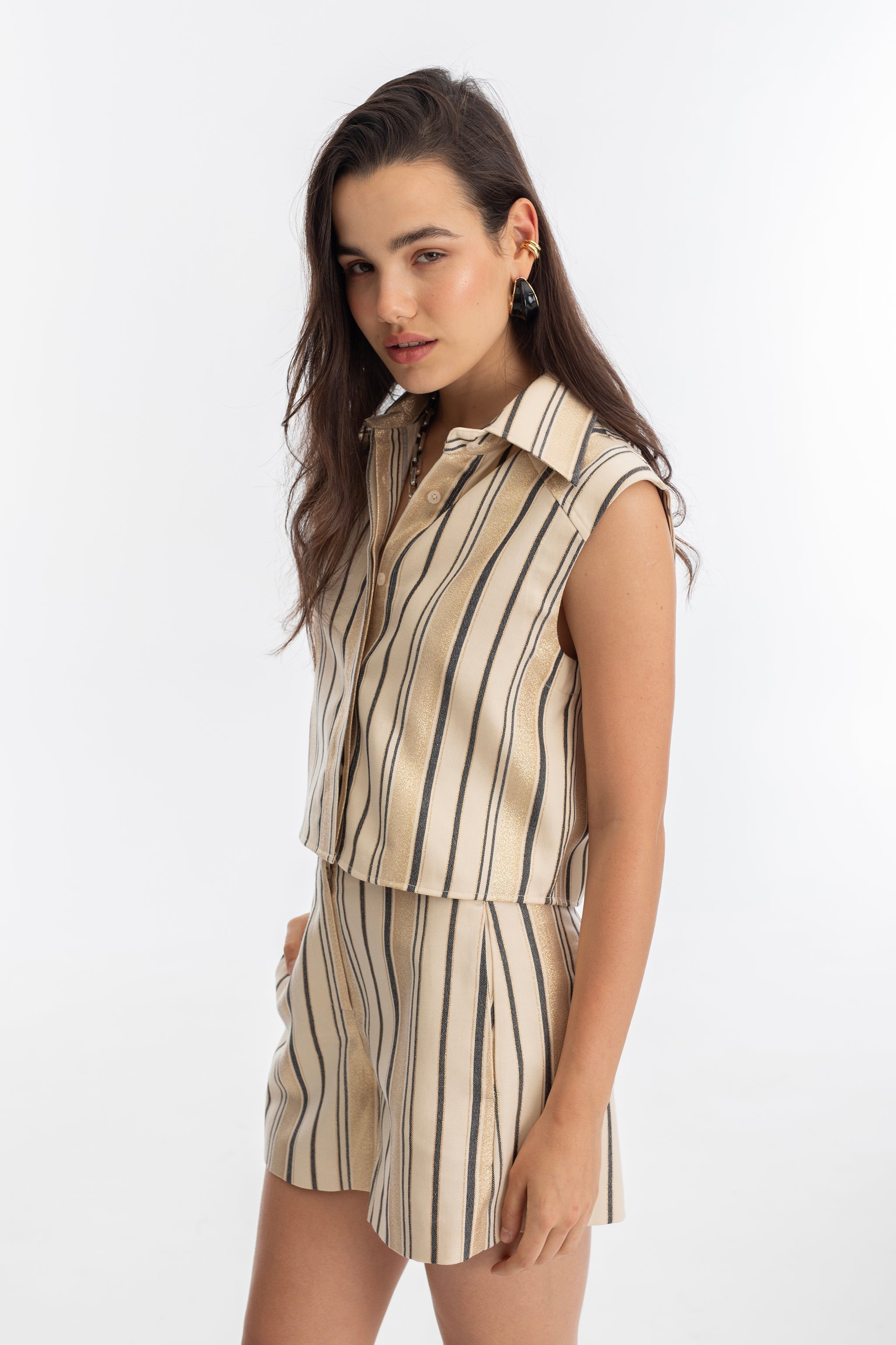 These high-waisted A-line shorts are super flattering and comfortable, and they have welt pockets on the back. They are made with a cotton blend jacquard with gold stripes, making them perfect for the holiday season.