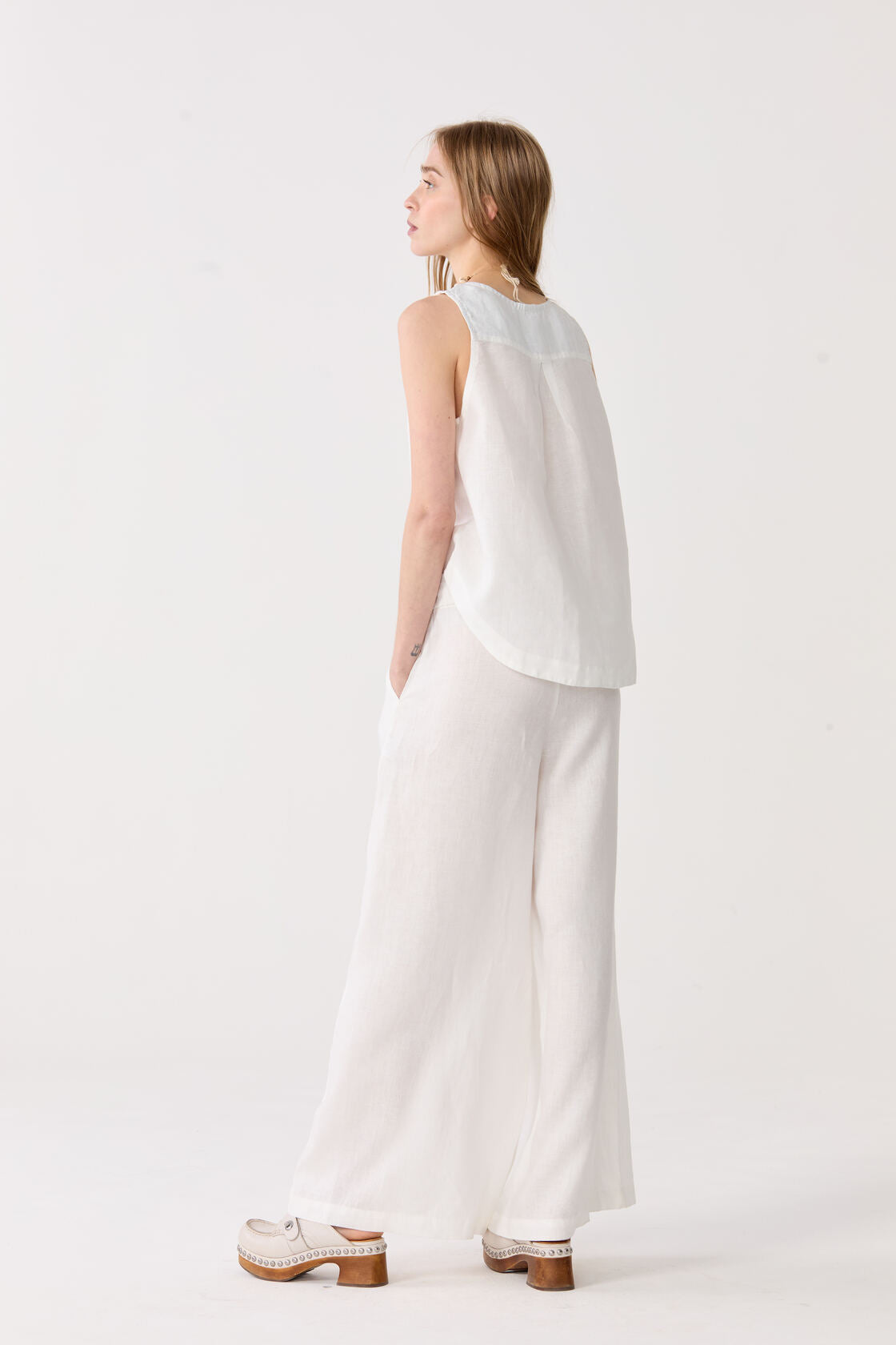 Crafted from 100% organic linen, this fun piece is pre-washed and softened to perfection. It features a  rounded neckline and curved hem, slightly longer at the back.