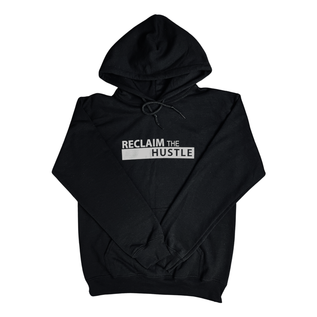This black hoodie features the “Reclaim the Hustle” graphic printed on soft midweight fleece. Designed with a relaxed unisex fit, double-lined hood, and matching drawcord for added warmth and comfort.