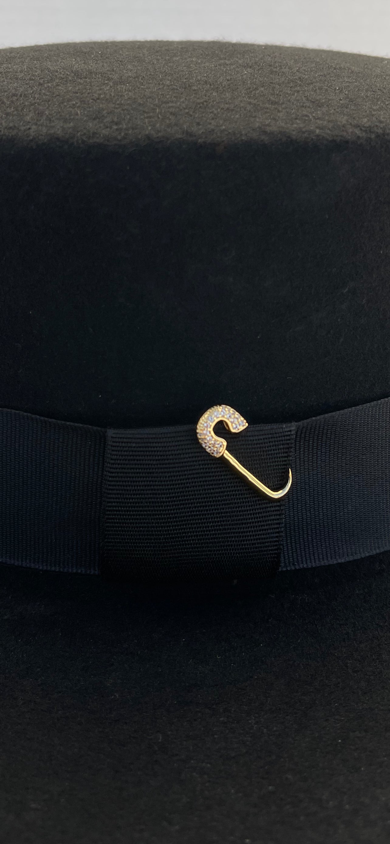 - Small gold crystal pin on side of ribbon