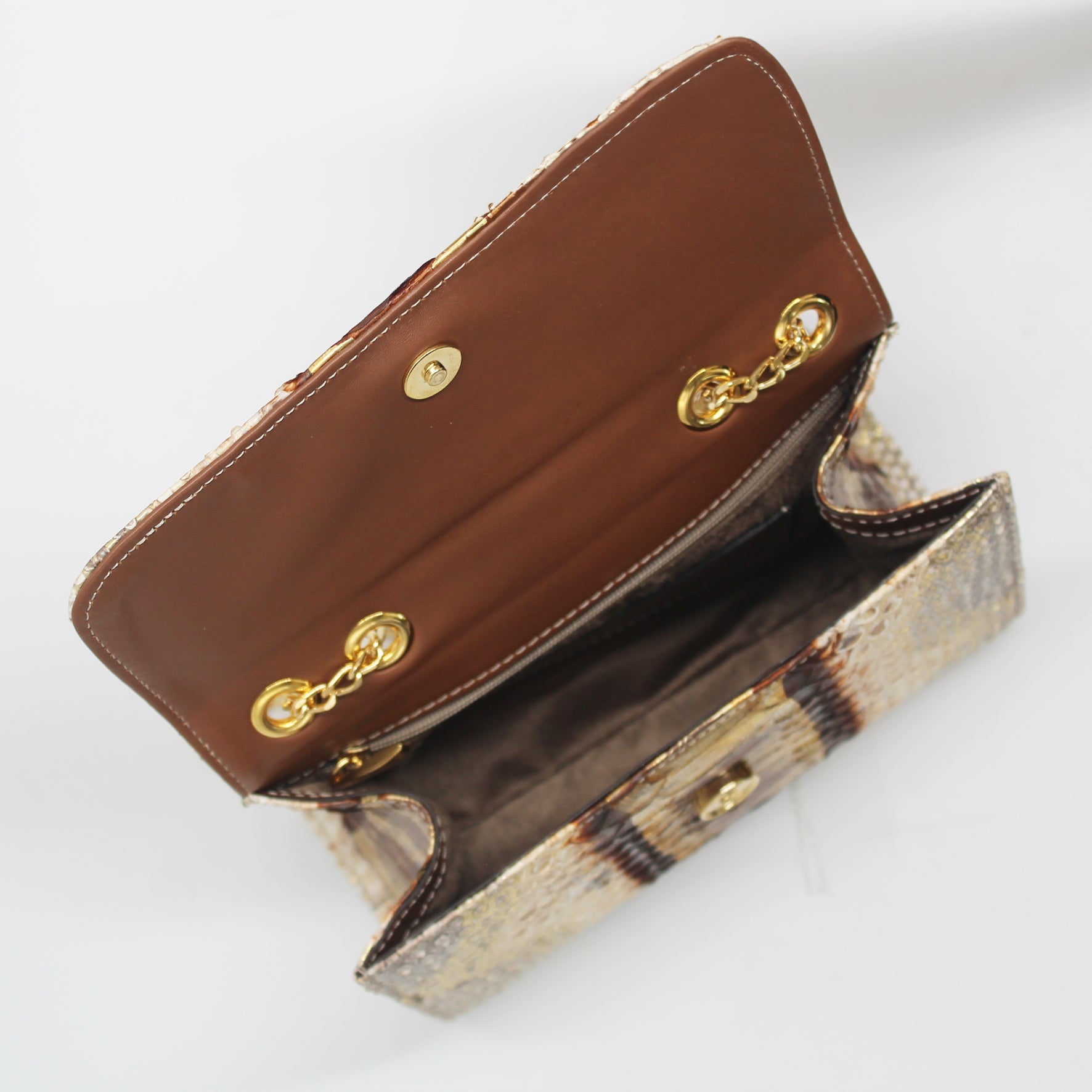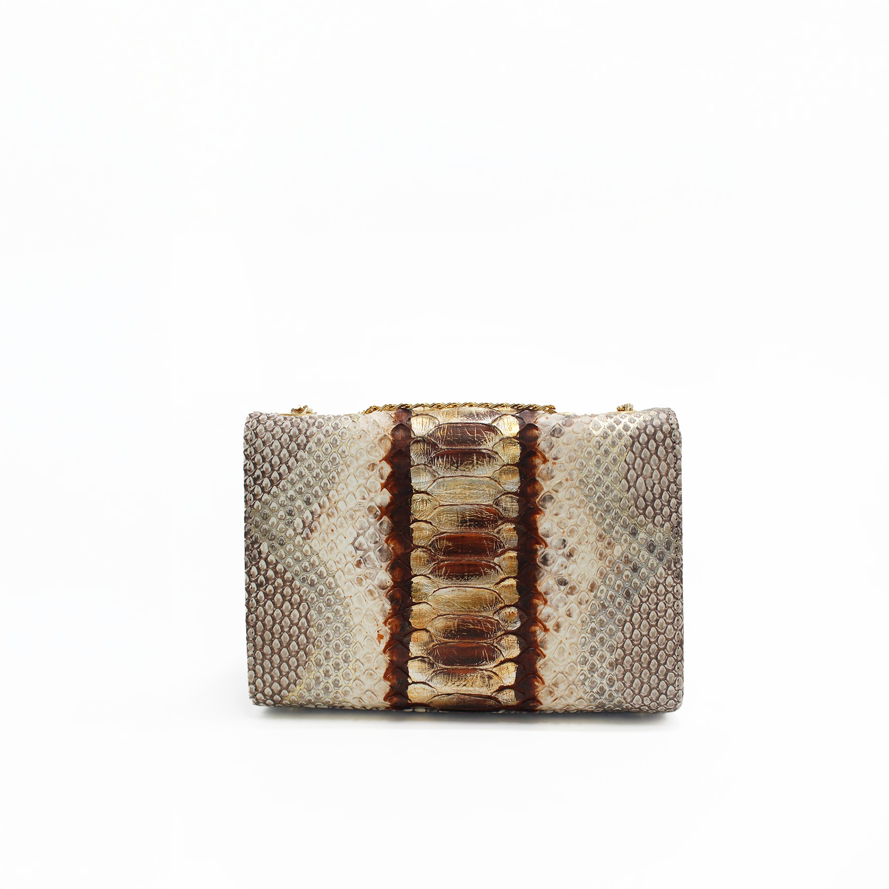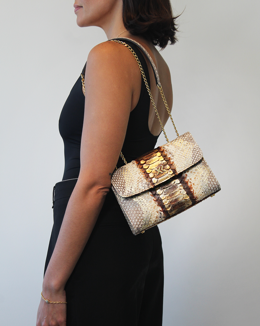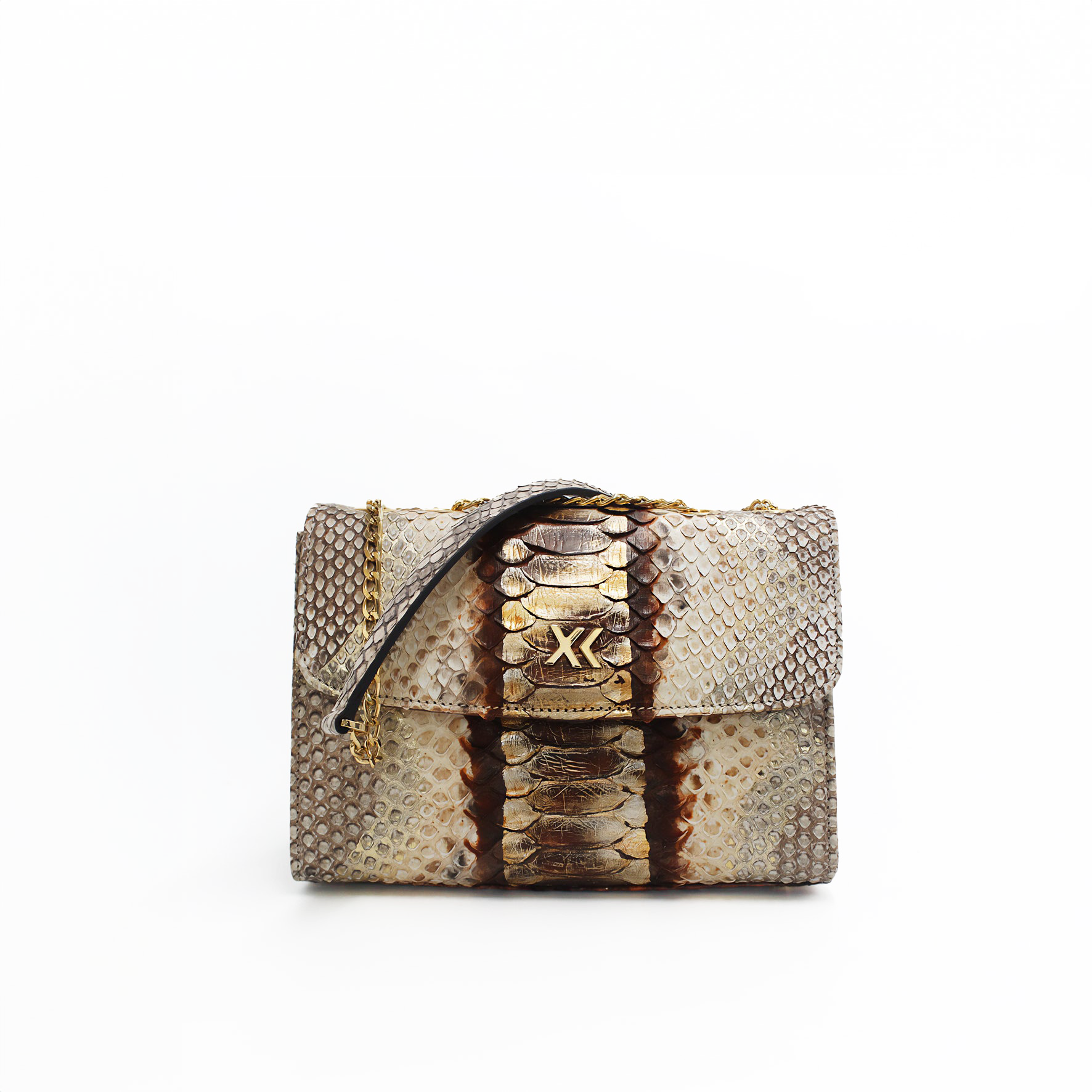 The Claudia Bag is a lightweight, structured shoulder and crossbody bag crafted in Italy from responsibly sourced python skin with a glossy finish. Its sleek design features a gold chain, a concealed magnetic snap closure and it is adorned with a metallic XK monogram on the front. Inside, you’ll find a spacious suede-lined compartment with a convenient big zipper pocket on the backside of the bag. Claudia is a timeless piece that it will not go out of style.