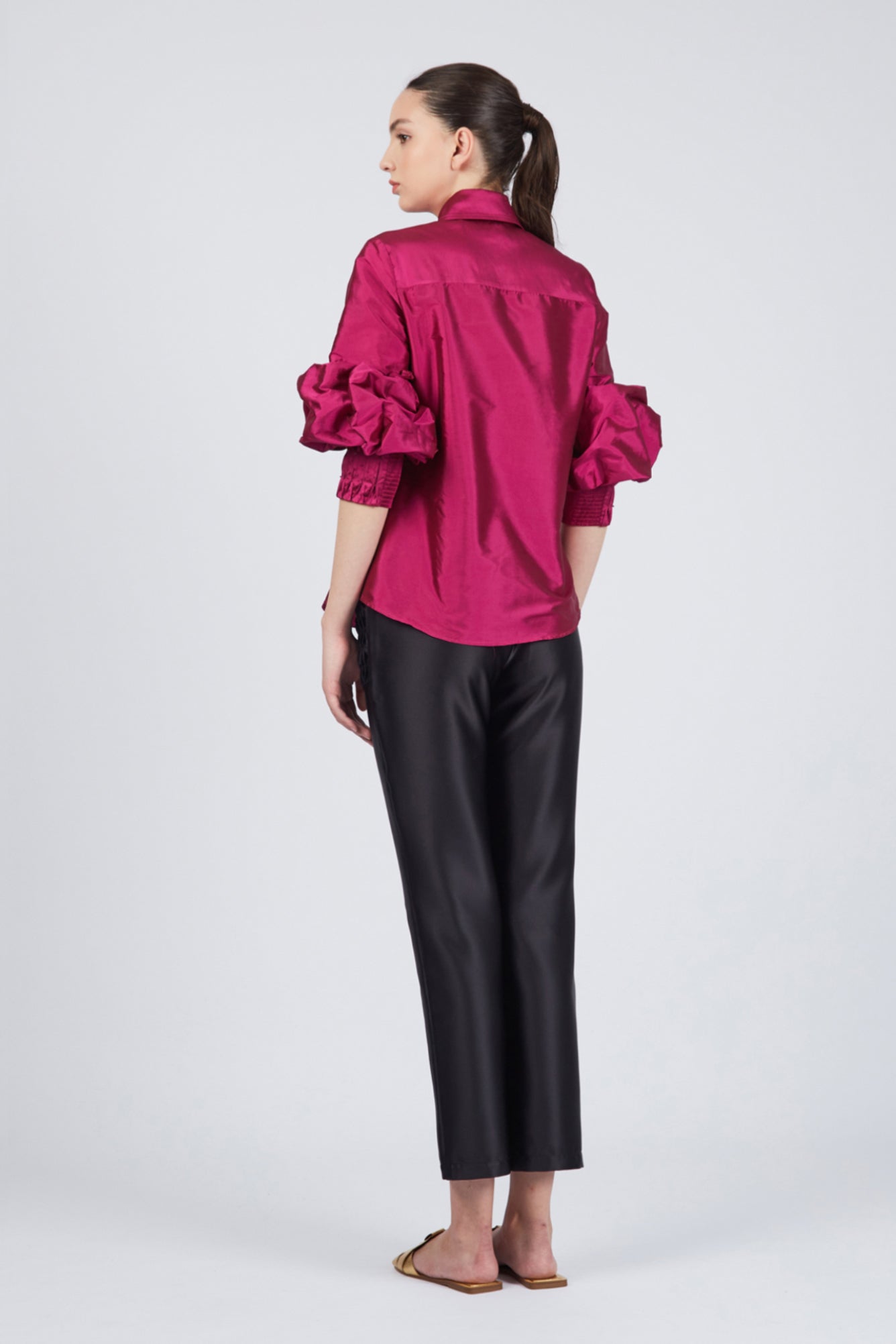 Elevate your style with the Zalma Blouse, available in vibrant Magenta and elegant Gold. Crafted from luxurious polyester satin, this blouse embodies sophistication with a fashion-forward twist. The classic shirt collar and long balloon-style sleeves create a timeless silhouette, while the cuffs, adorned with intricate embroidery, add a touch of artisanal elegance. Perfect for both day and evening wear, the Zalma Blouse seamlessly blends bold color with refined design. Make a statement with this versatile piece that exudes both charm and confidence.