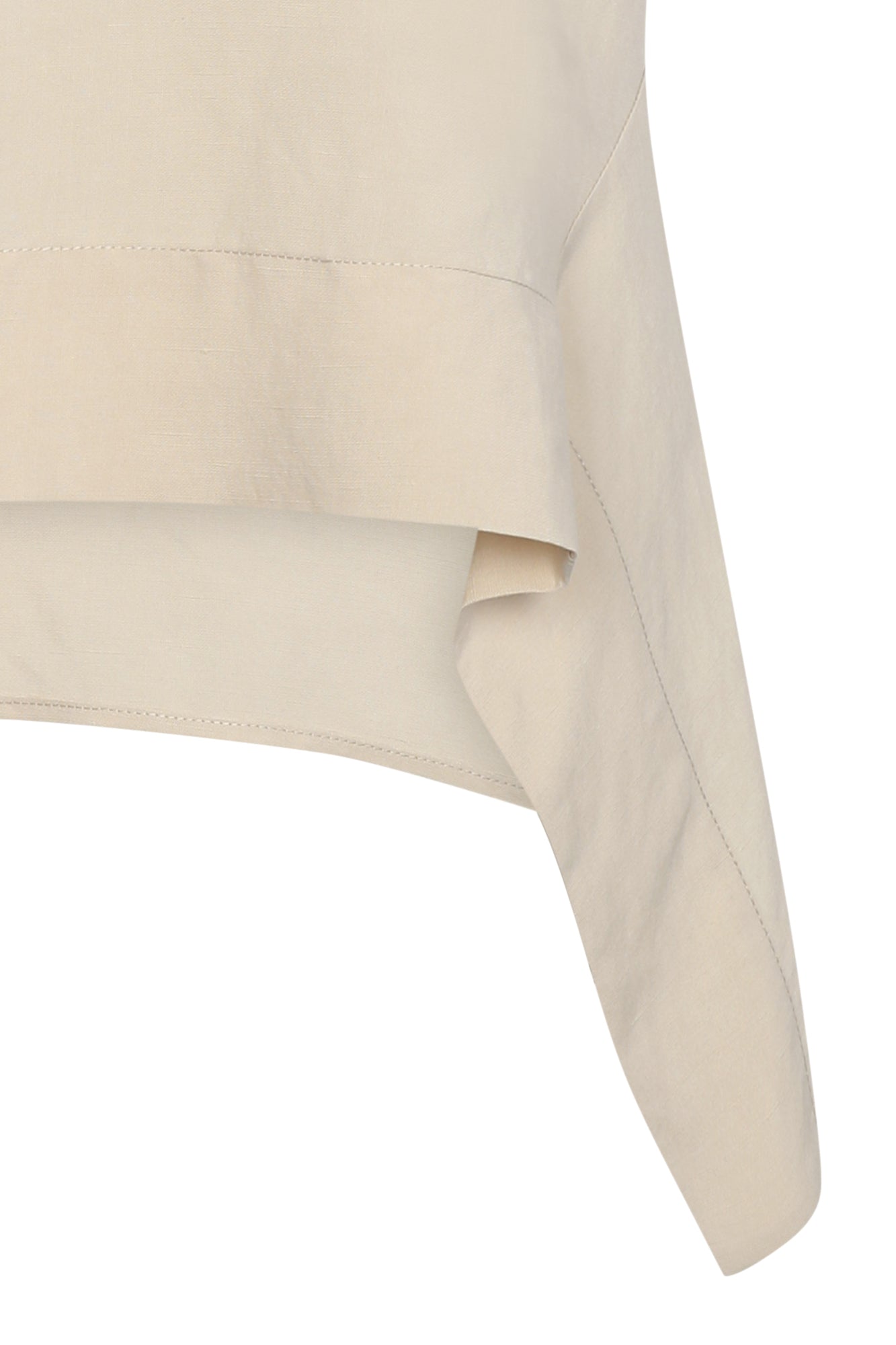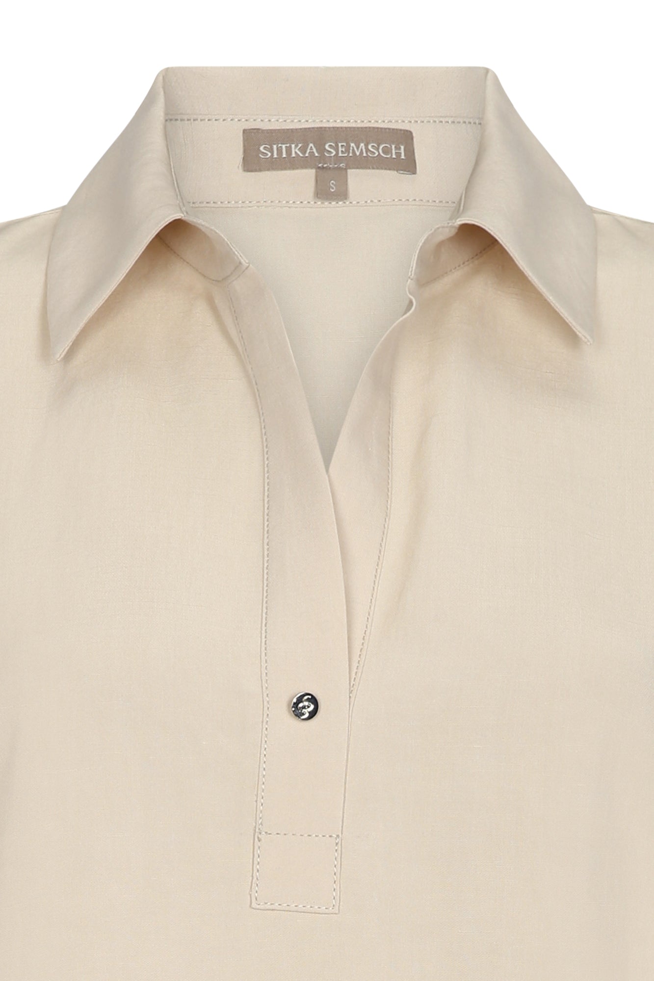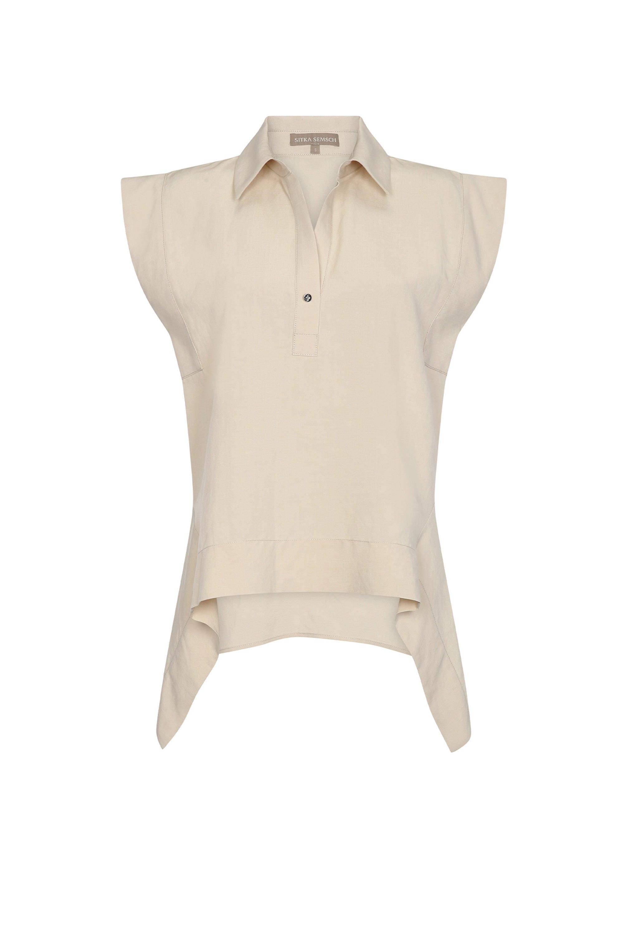 Sleeveless blouse with a shirt collar and V-neckline featuring a button