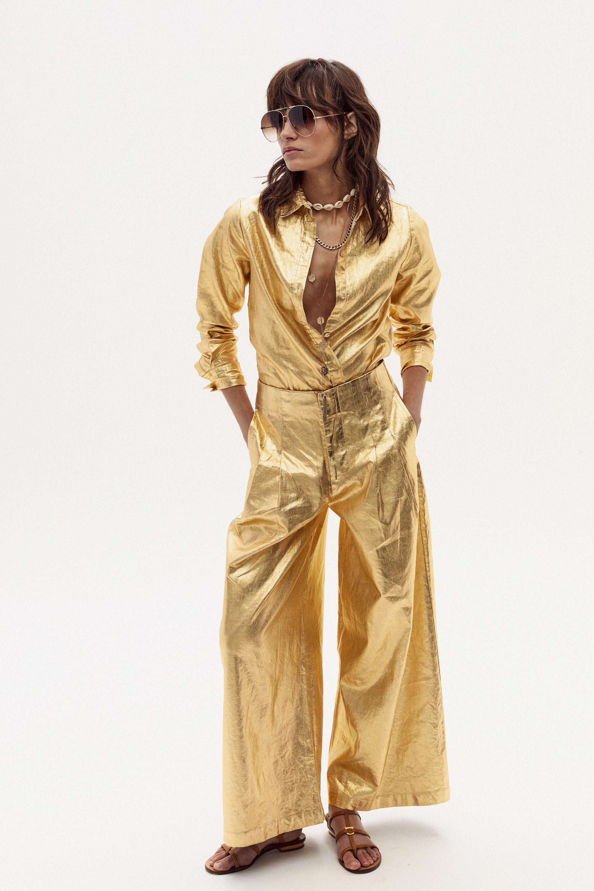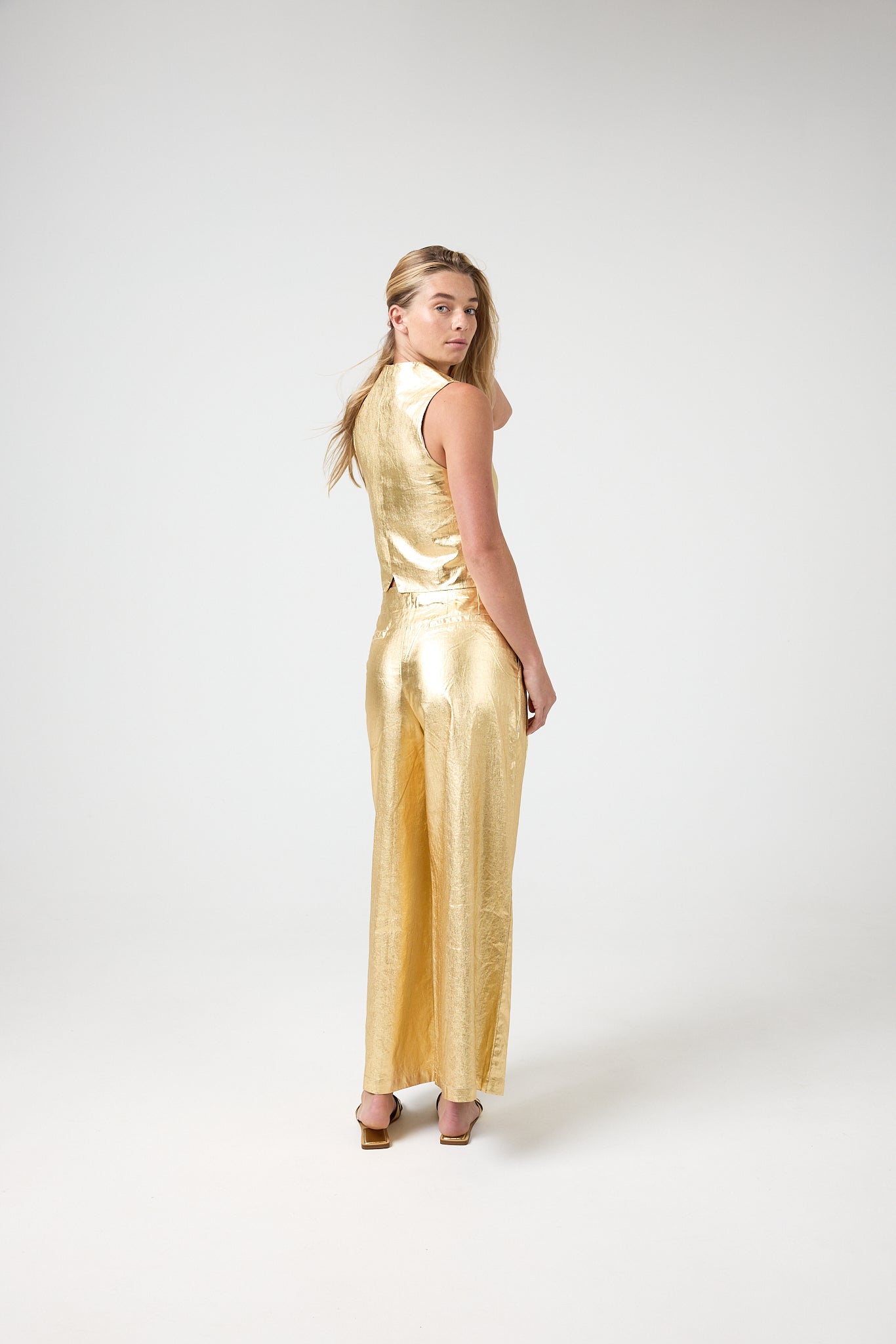 Discover our bestselling high-waisted Culotte Metallic Linen Pants, designed with a structured waistband for added support and comfort. These metallic wide pants are perfect for those who love a snug fit around the waist and have a defined waistline. They offer a flattering silhouette and are ideal for creating a chic, polished look. They are made with our signature premium 100% organic linen, finished with a metallic coating.  They have side pockets and front zipper fastening with a hook.